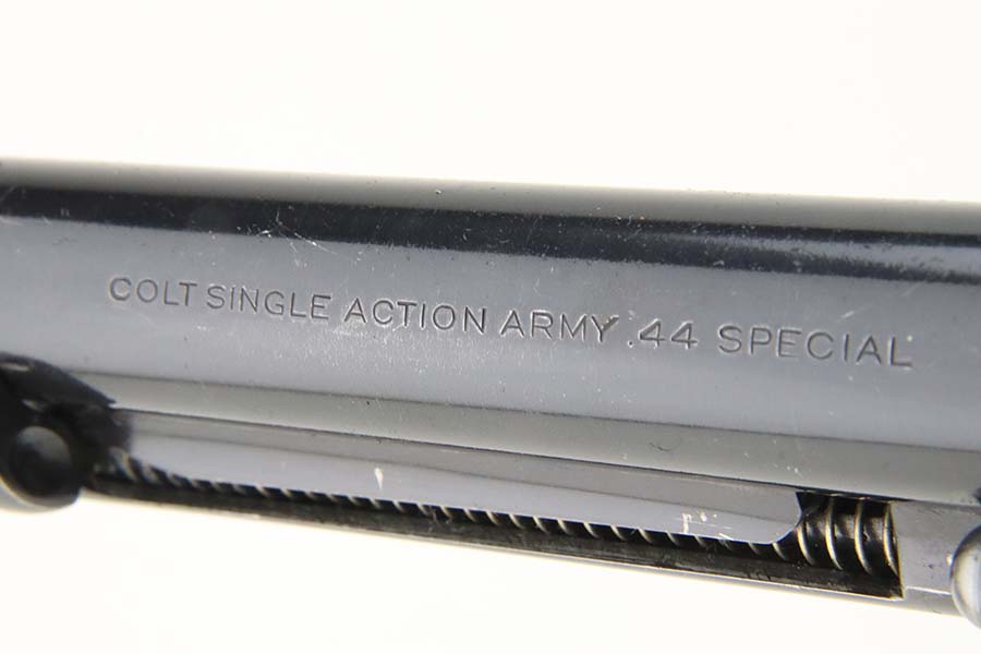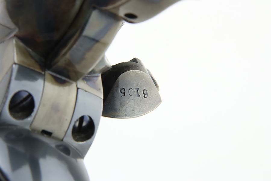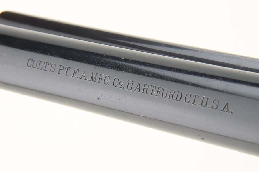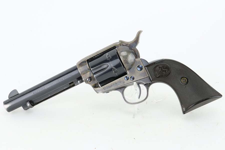 3/11/24 – This is an excellent example of a First Generation Colt SAA army from 1905. Chambered in .44 Special with a 5.5 inch barrel. The cylinder is mismatched, and we believe it has been re-barreled with a .44 Special barrel. In any case, the finish rates about 93% with some muzzle wear, minor high edge wear, and areas of minor thinning on the round edges of the frame. Very nice case-hardening. Fitted with hard rubber grips – small chip in the left side left. Mint bore.
