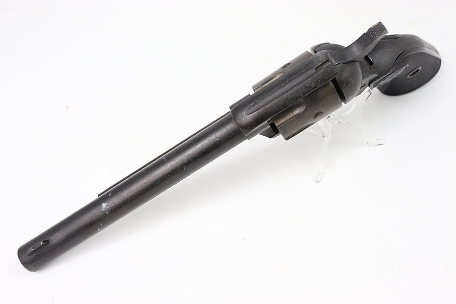 11/27/24 – This is a dummy Colt Single Action Army Revolver. Chambered in 44-40 Long Colt. The revolver is marked Japan on the bottom and used for firing blanks, as the barrel is welded. The revolver is in fair condition, with several mechanical issues: the action does not cycle smoothly, the cylinder fails to rotate, and the hammer occasionally sticks and does not fully decompress.