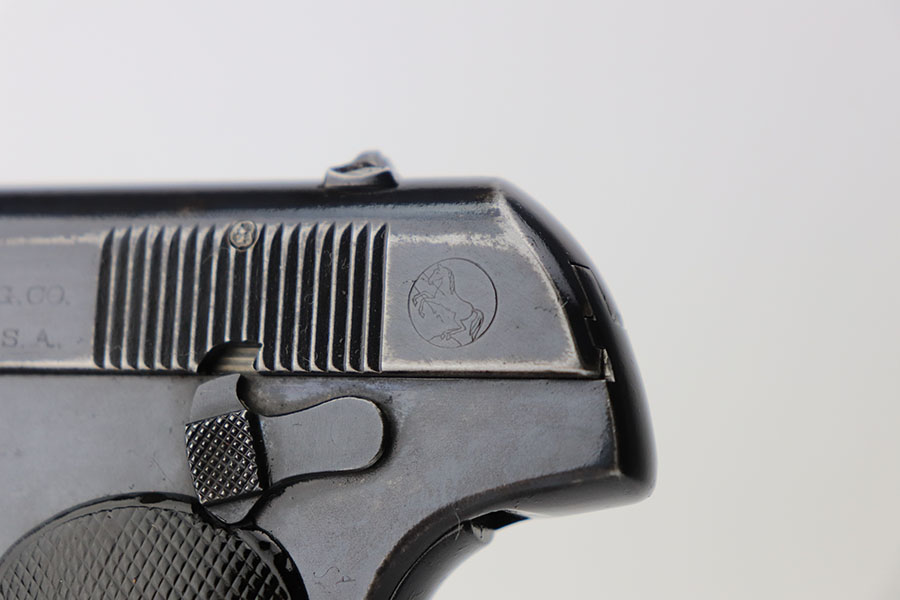 9/18/24 – This is an early Colt M1903 Hammerless pistol made in 1906. The pistol is in great overall condition with the original finish covering about 92% of the pistol. Comes with the correct early grips and magazine. Early Colt stallion logo has the proper circle around it. The bore is in great shape with some mild frosting and patina in the grooves. We rate about 8/10. Excellent mechanics and action is smooth.