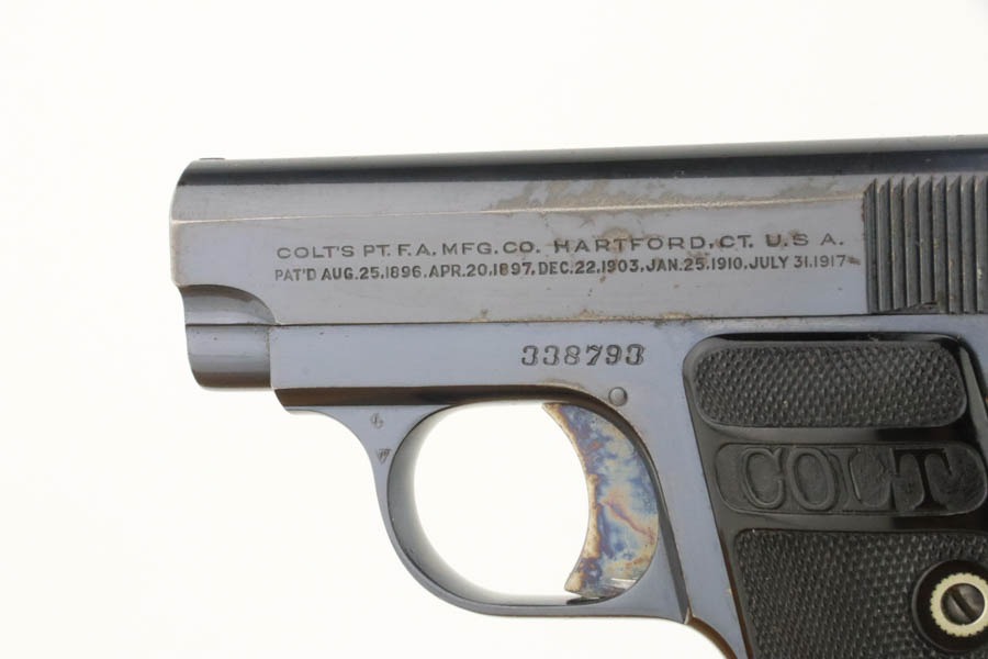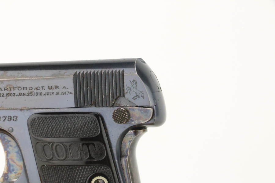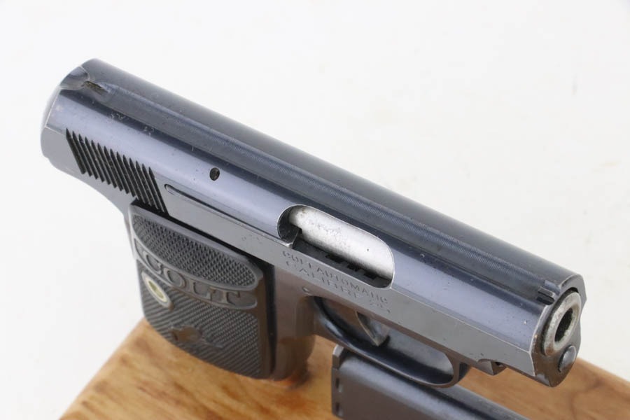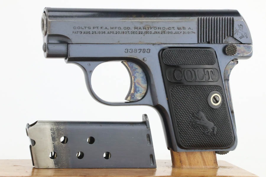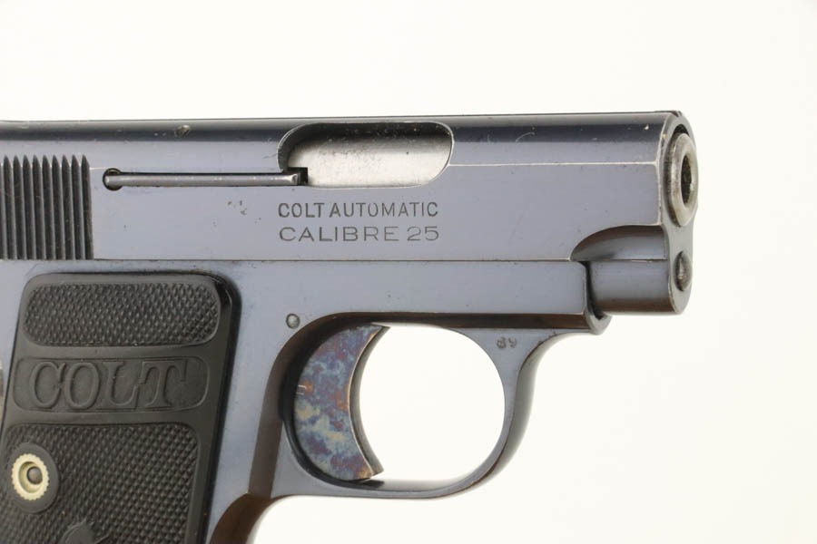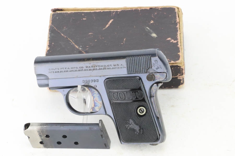10/31/24 – This is an excellent example of a Colt M1908 Vest Pocket pistol, manufactured in 1924 and chambered in .25 ACP. It is all matching and comes with its original matching-numbered box (the lid of the box is noticeably tattered). The gun has retained about 96-97% of its finish with some small spots of discoloration on the left side of the slide. Gorgeous case-hardening on the small parts. Fitted with excellent black hard rubber grips. The bore has good rifling, but there is noticeable pin-pricking throughout.
