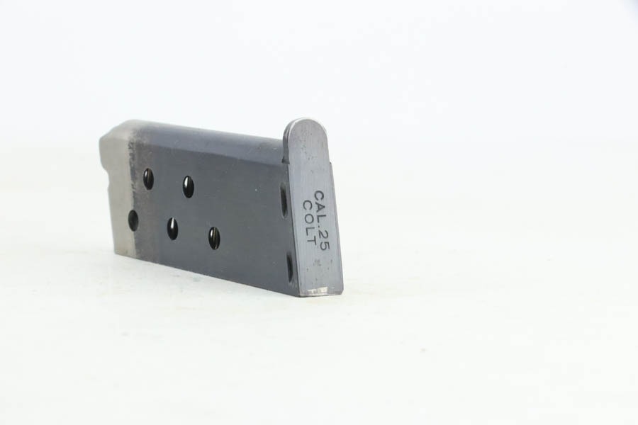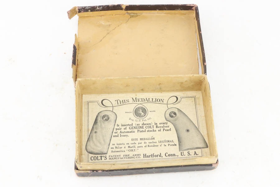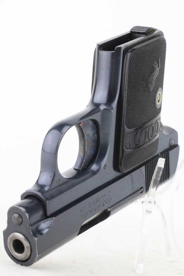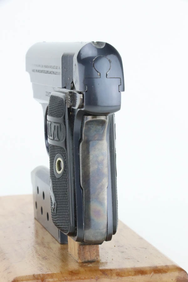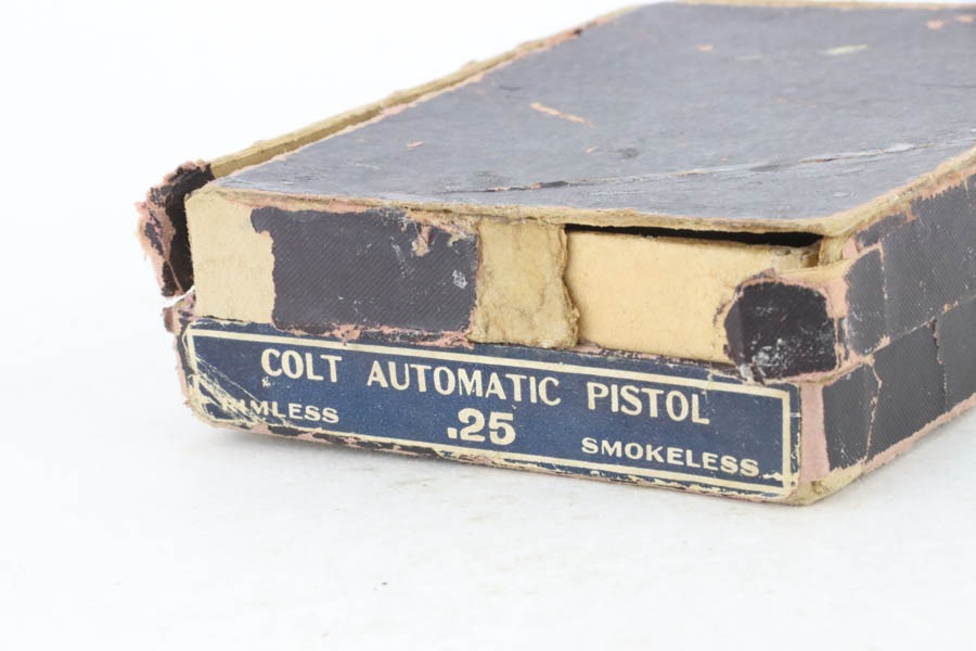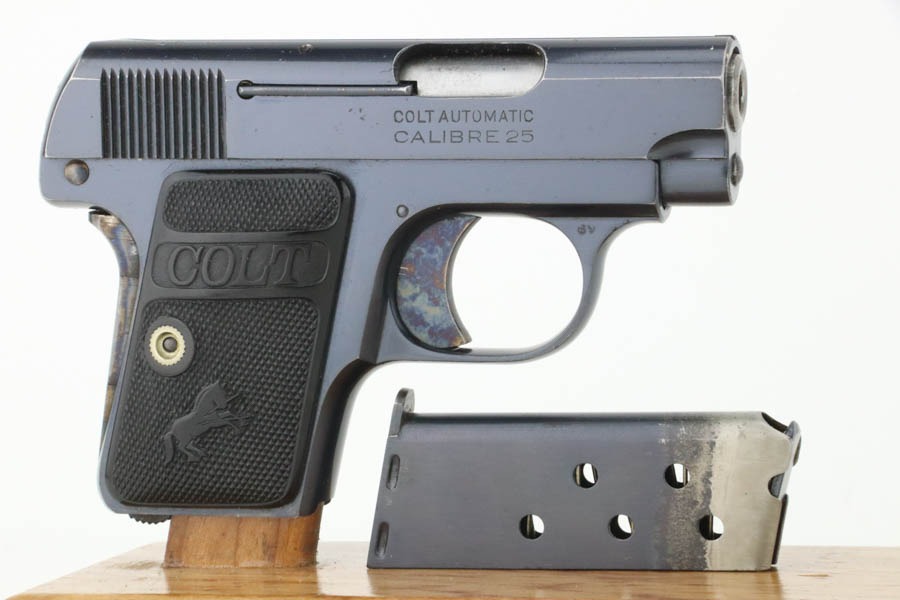 10/31/24 – This is an excellent example of a Colt M1908 Vest Pocket pistol, manufactured in 1924 and chambered in .25 ACP. It is all matching and comes with its original matching-numbered box (the lid of the box is noticeably tattered). The gun has retained about 96-97% of its finish with some small spots of discoloration on the left side of the slide. Gorgeous case-hardening on the small parts. Fitted with excellent black hard rubber grips. The bore has good rifling, but there is noticeable pin-pricking throughout.