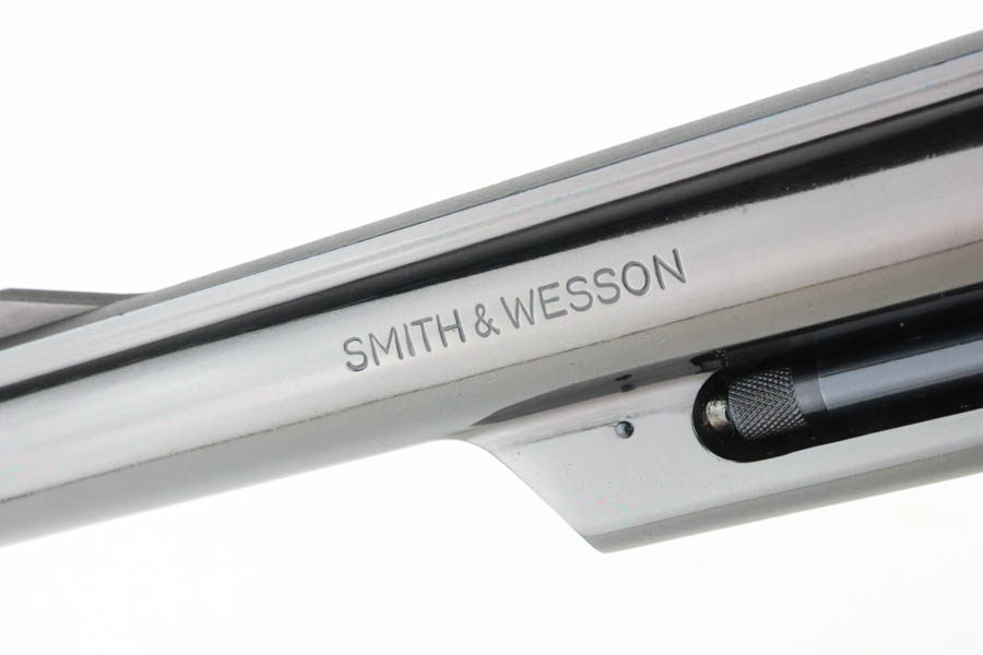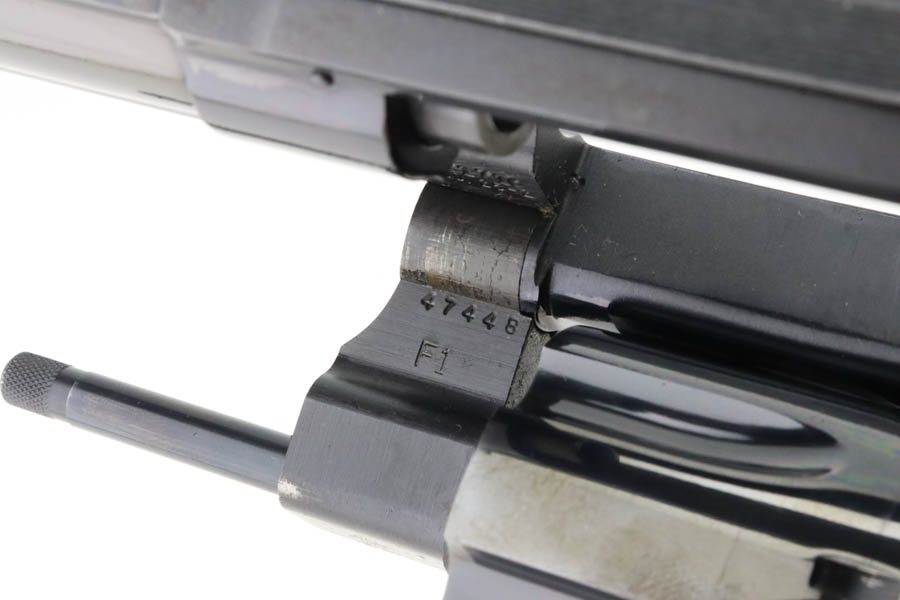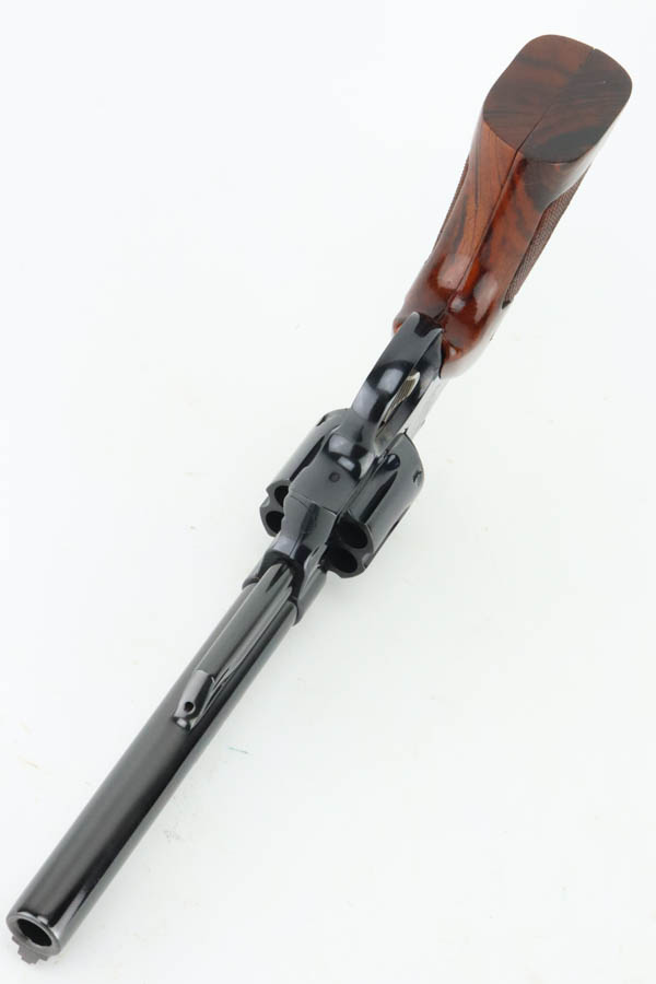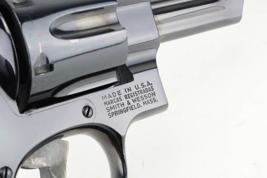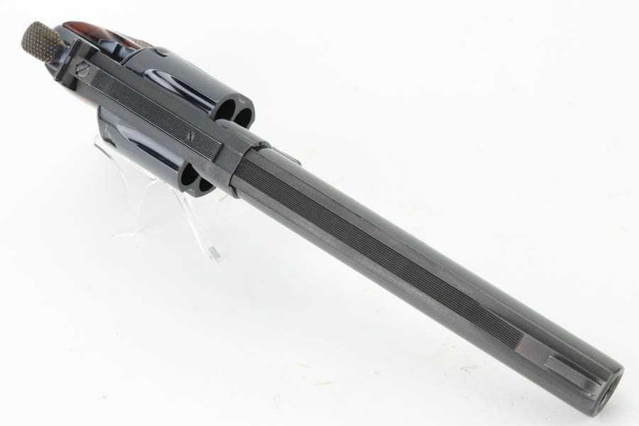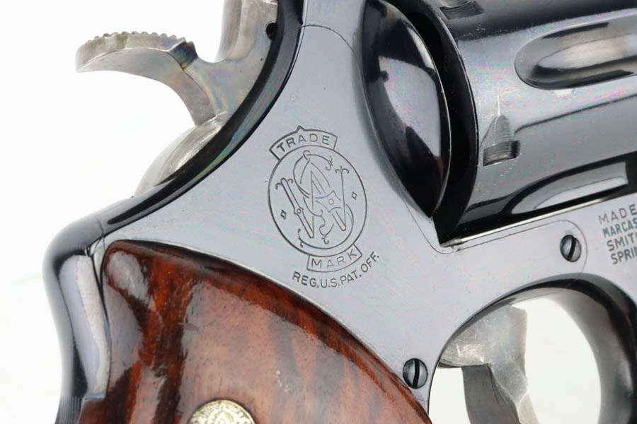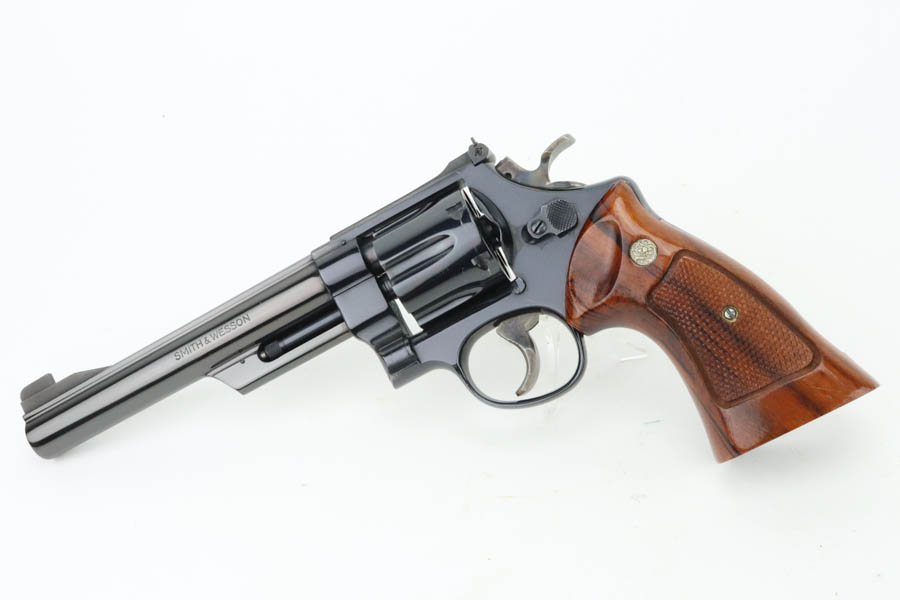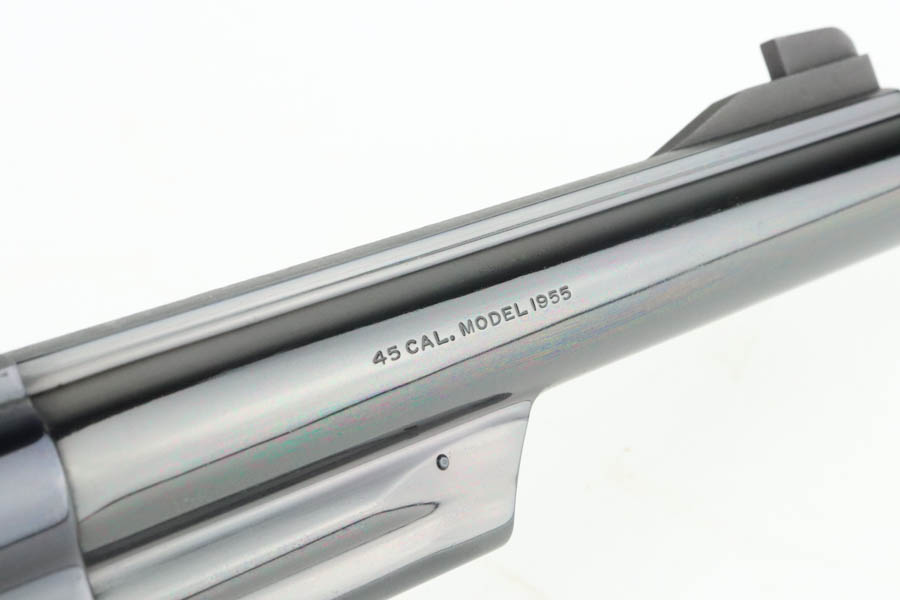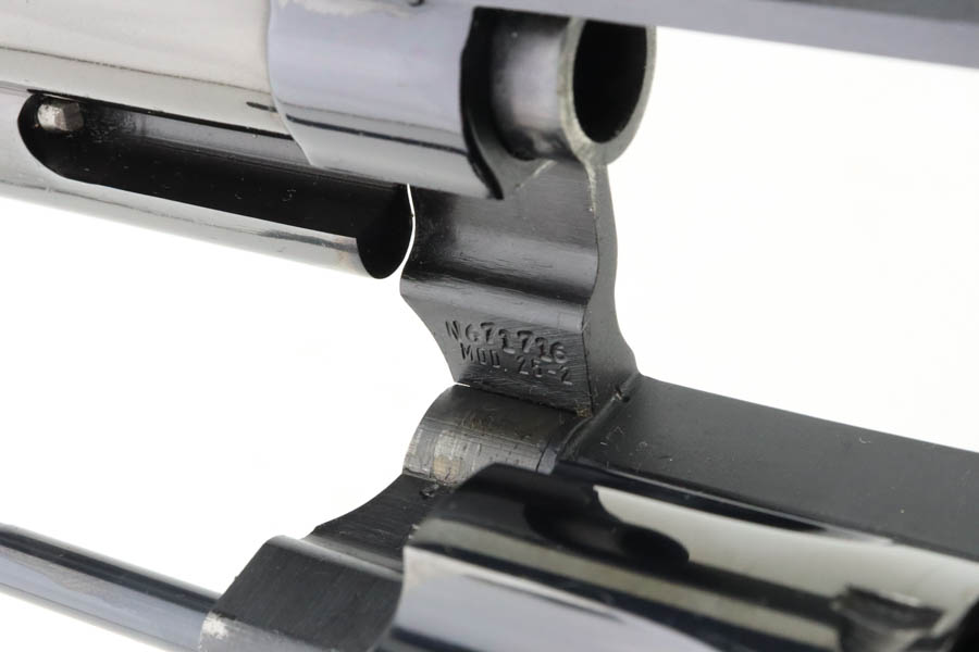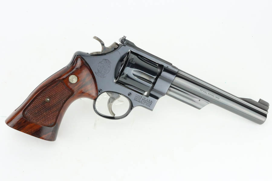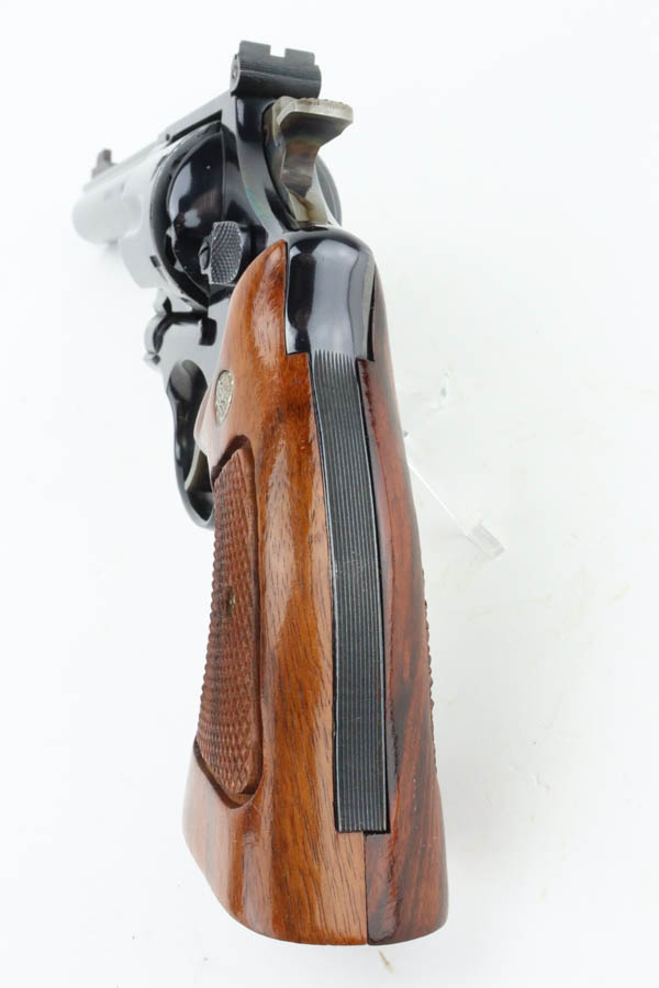6/14/24 – This is a minty example of a Smith & Wesson Model 25-2 or Model 1955 Target Revolver, manufactured in 1980 and chambered in .45 Caliber. 6.5 inch barrel. It has retained nearly all of its high polish finish with a faint roll mark on the cylinder and a few very tiny handling marks here and there. Excellent case-hardening on the hammer and trigger. Fitted with checkered Walnut grips. Mint bore. Smooth action. Comes with 12 moon clips.