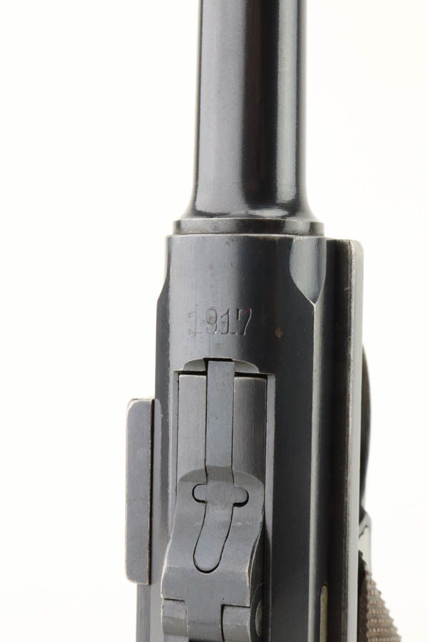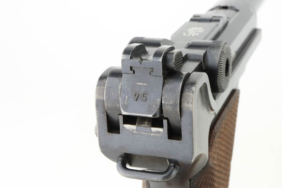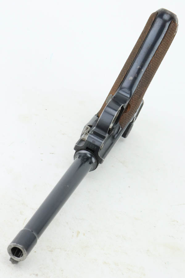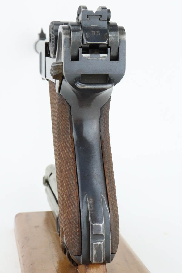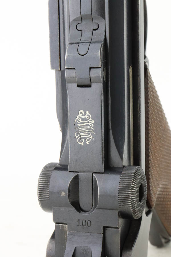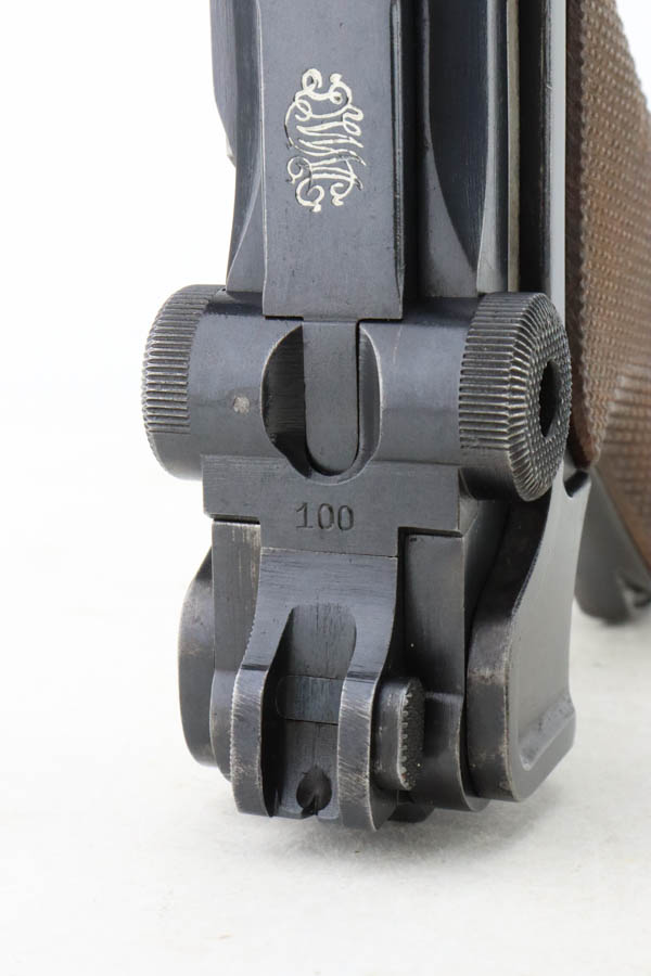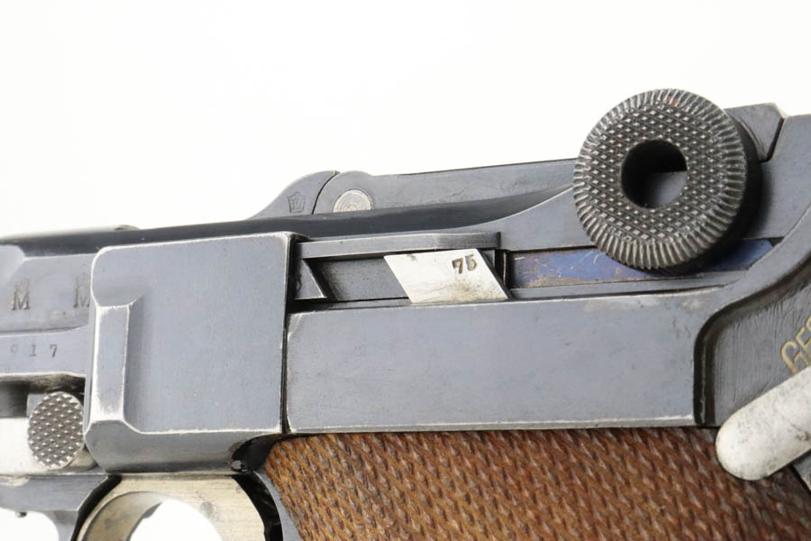 7/16/24 – This is a fantastic example of a rare and desirable Navy DWM Luger with the original, matching numbered stock! This pistol was once featured on our Youtube channel, and the video is linked below. This example is 1917 dated and has all matching numbered parts, with unnumbered grips and magazine. The magazine is a rare, original Navy example with concentric circle pattern on the side and Crown/M proof on the base. The bluing on this pistol rates at about 95% with standard high edge wear on the sideplate and muzzle, and minor bluing loss on the front strap. This example is one of very few we’ve encountered with the original, matching stock. The stock is in excellent condition, with Crown/M marked disc intact and clear serial number on attaching piece.