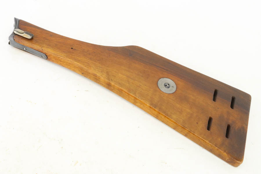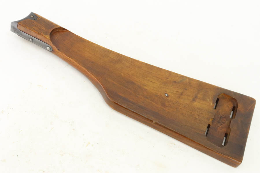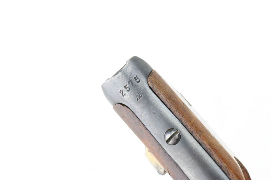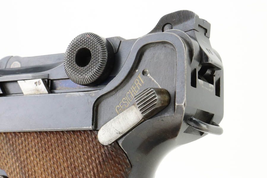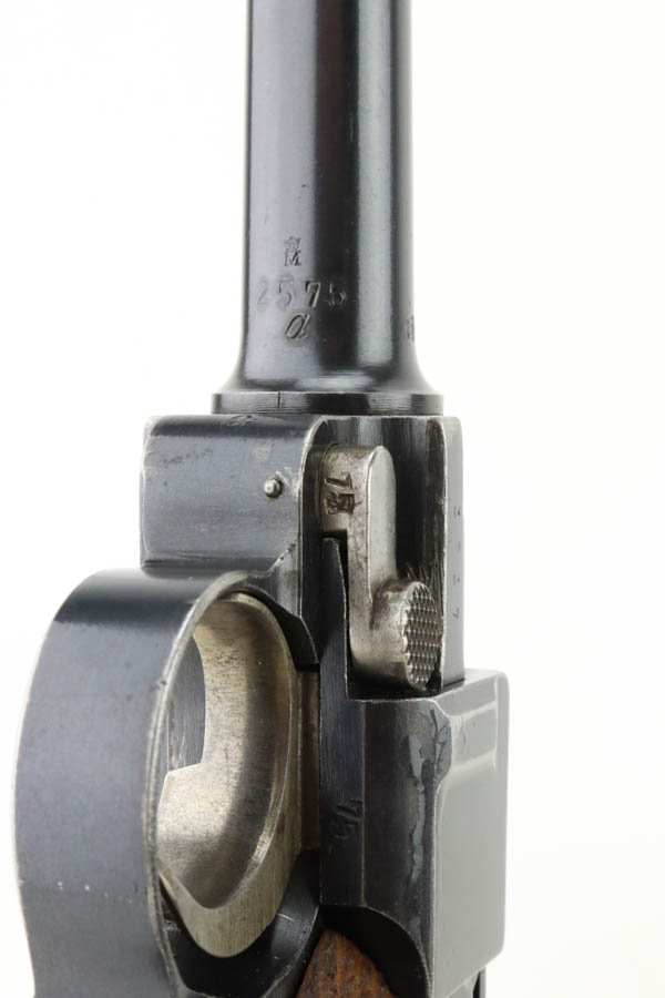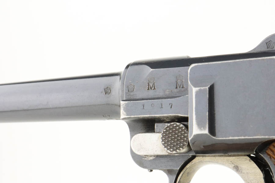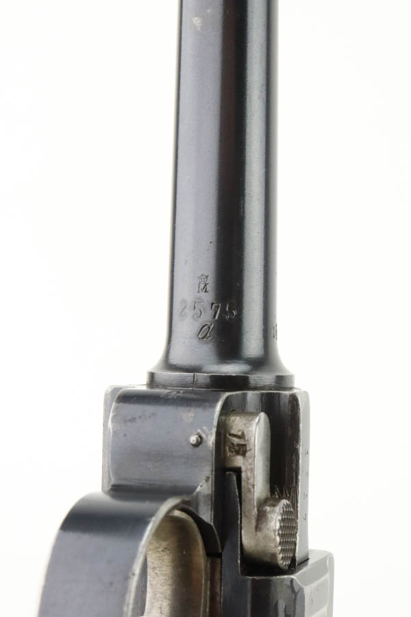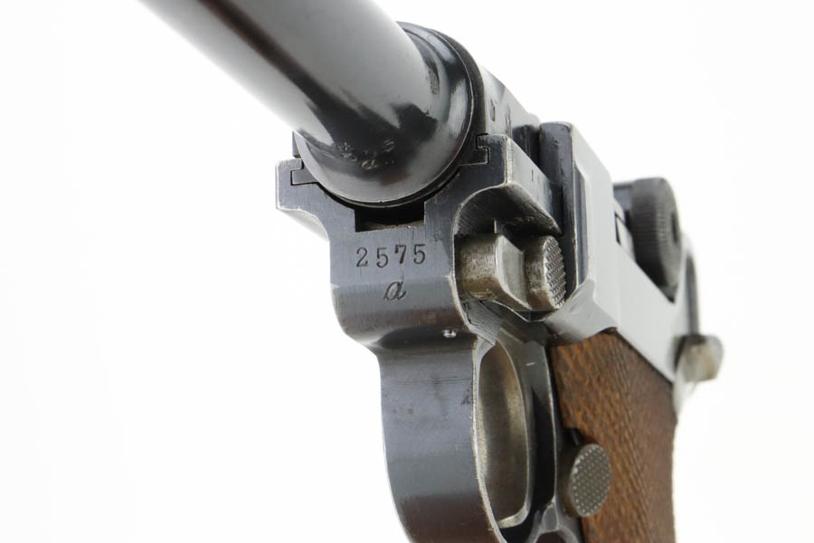 7/16/24 – This is a fantastic example of a rare and desirable Navy DWM Luger with the original, matching numbered stock! This pistol was once featured on our Youtube channel, and the video is linked below. This example is 1917 dated and has all matching numbered parts, with unnumbered grips and magazine. The magazine is a rare, original Navy example with concentric circle pattern on the side and Crown/M proof on the base. The bluing on this pistol rates at about 95% with standard high edge wear on the sideplate and muzzle, and minor bluing loss on the front strap. This example is one of very few we’ve encountered with the original, matching stock. The stock is in excellent condition, with Crown/M marked disc intact and clear serial number on attaching piece.