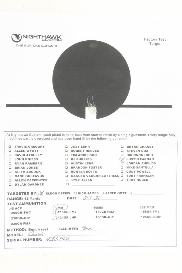 From Nighthawk’s website: The Nighthawk Custom Counselor is the original member of the Ambassador Series, showcasing a blend of innovative design and practical features tailored for concealed carry. This 9mm Officer Model boasts a 3.5-inch match-grade barrel and is built on a lightweight aluminum frame for ease of carry without sacrificing durability. Both the aluminum mainspring housing and grip safety contribute to its lightweight construction. The Counselor features a new bobbed-concealment beavertail and hammer, specifically designed for a lower profile to aid in concealed carry. With an 8+1 capacity, this 1911 pistol offers ample firepower in a compact frame. The model’s slide introduces a brand-new design, diverging from the traditional approach of using “negative” serrations. Instead, the Counselor employs “positive” serrations up front, which protrude from the slide, offering shooters a unique look and an excellent grip for press-checking. A standout feature of the Counselor is its patented Flush-Fit Magwell. This innovative design includes a shorter officer frame with a custom-engineered magwell that slides in from the front, adding back only the length of the frame it removed. This magwell holds the sear spring in place, a groundbreaking feat in the 1911 industry. This thoughtful engineering offers an excellent solution for concealed carry, merging compactness with the convenience of a magwell. Additionally, the Counselor includes an ultra-high, undercut trigger guard, accommodating most full-size hands on the grip for optimal control. The pistol’s G10 scales, custom-engineered with Railscales, are thinner than any other 1911 grips on the market, providing a comfortable and secure grip. In summary, the Nighthawk Custom Counselor combines groundbreaking innovations with exceptional functionality, making it a superb choice for shooters who prioritize concealed carry without compromising on performance or design. This pistol embodies Nighthawk Custom’s dedication to quality, craftsmanship, and ingenuity in every aspect.