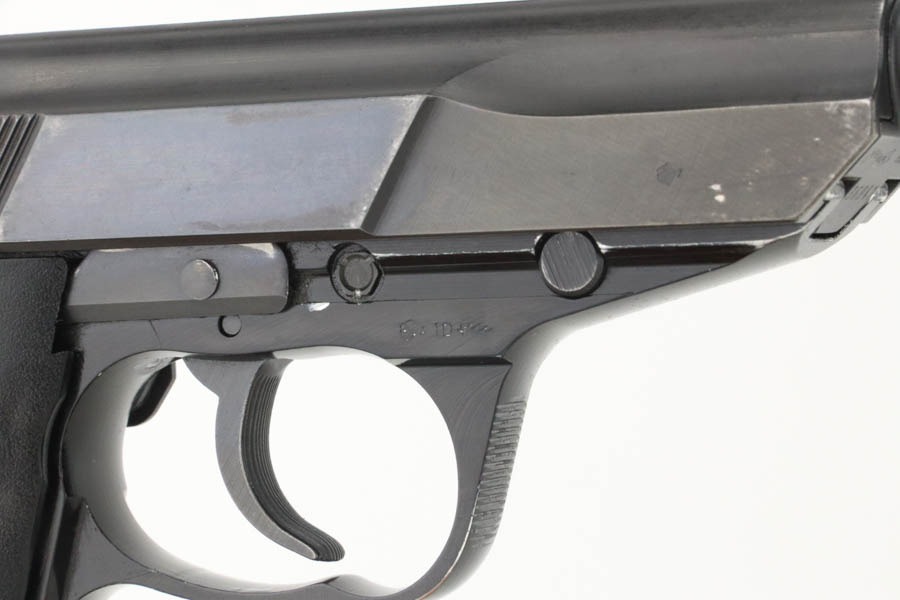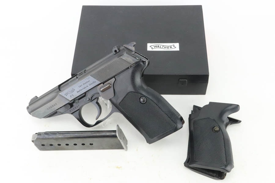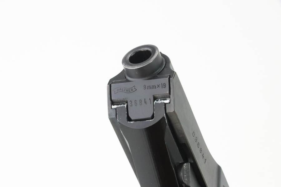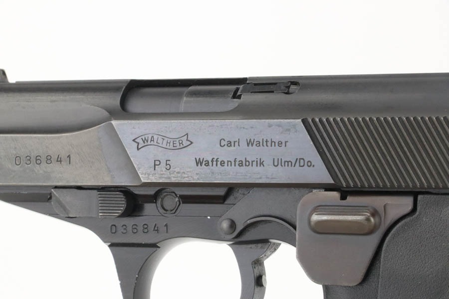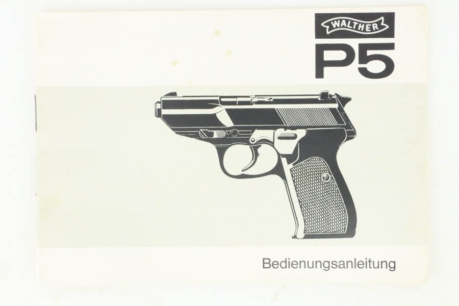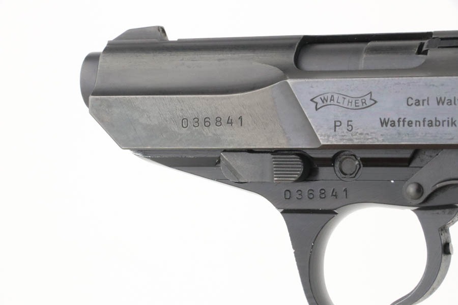 11/1/24 – This is an excellent example of a Walther P5 manufactured in 1983. All matching with the proper proofs, but there is an import mark on the underside of the slide. The gun comes in a period-correct box (the label is torn, so the serial number is not visible), owners manual, one magazine, cleaning rod, and a spare set of grips. The gun itself has retained about 97% of its original finish with very minor high edge wear and very minor discoloration on the left side of the slide. Excellent black plastic grips. Mint bore.