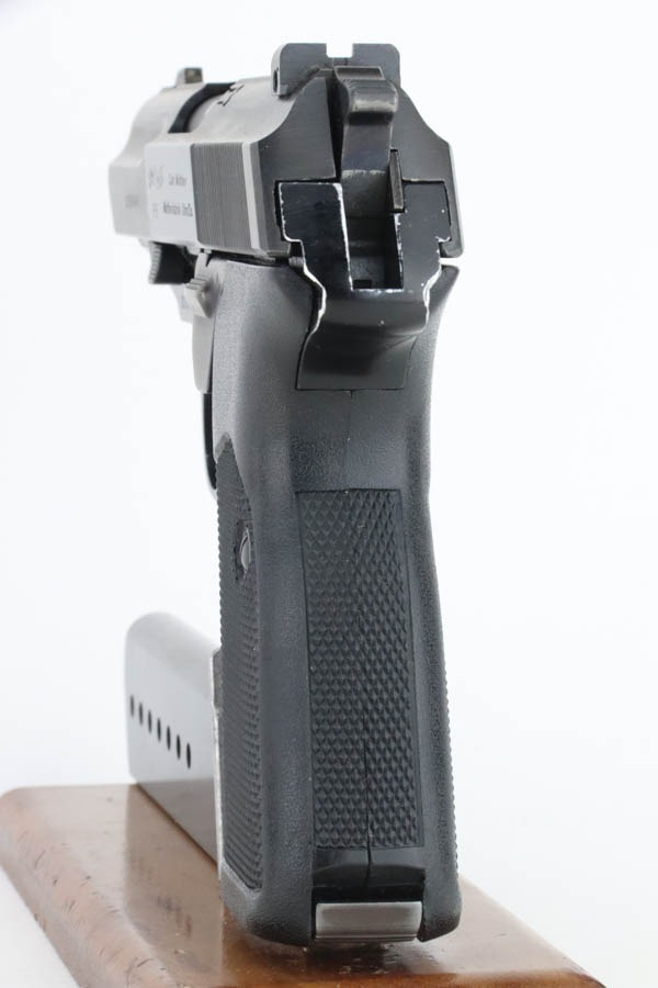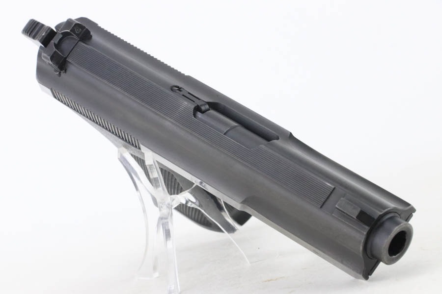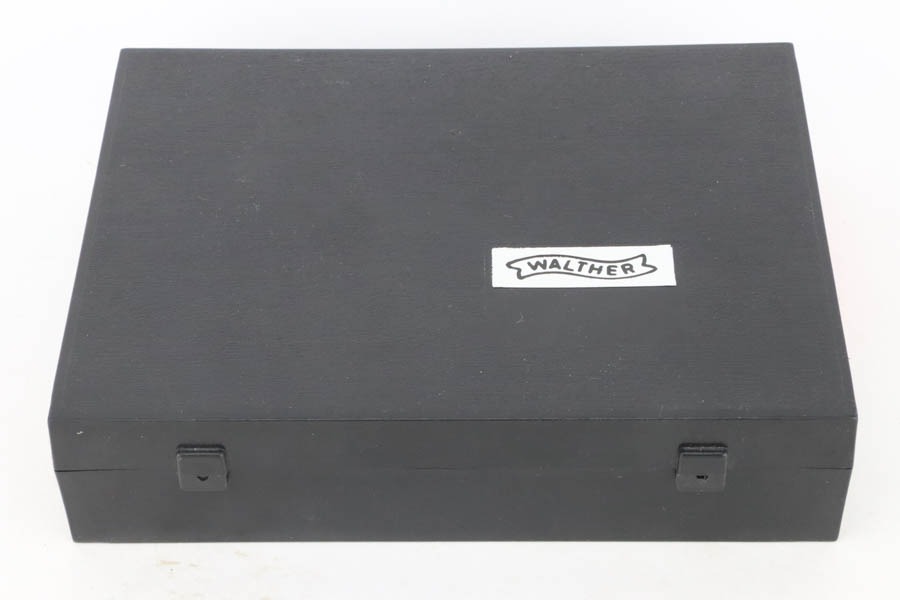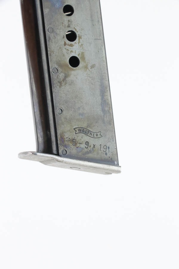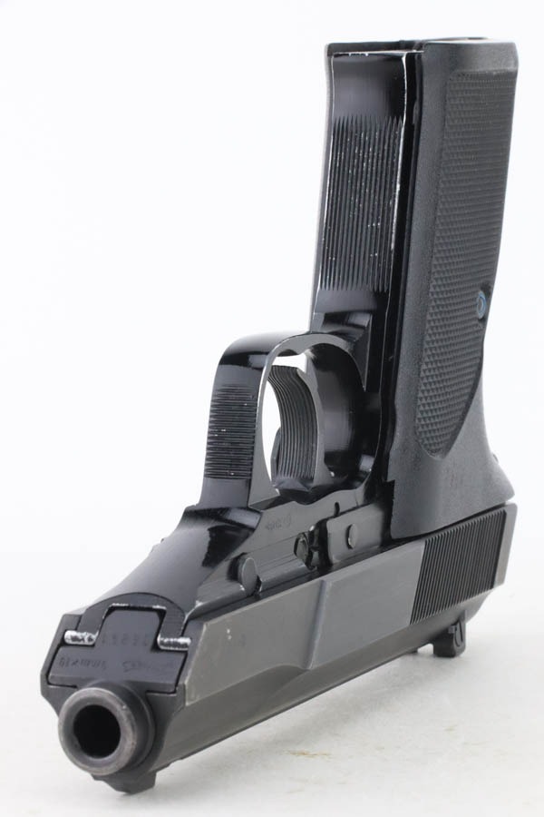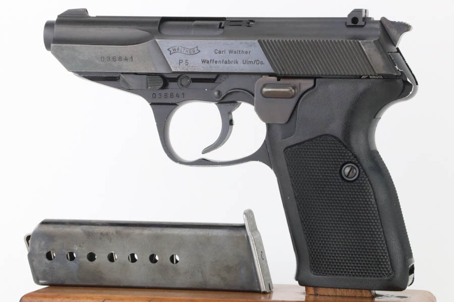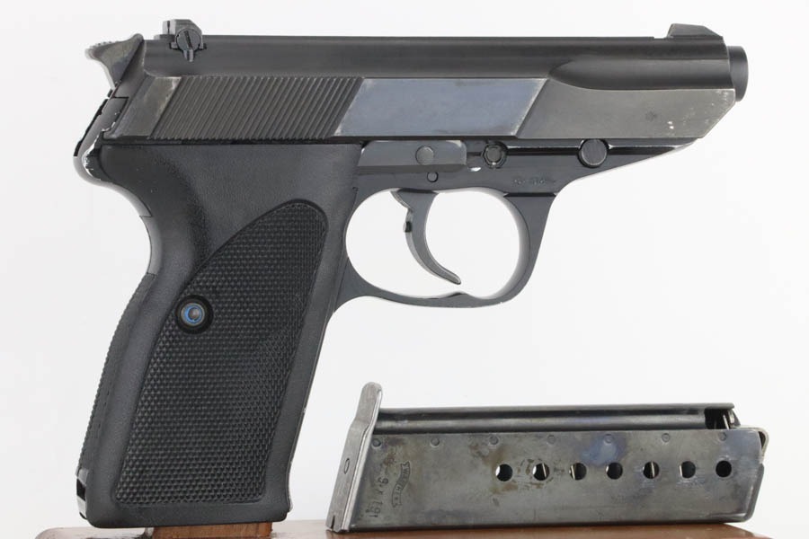 11/1/24 – This is an excellent example of a Walther P5 manufactured in 1983. All matching with the proper proofs, but there is an import mark on the underside of the slide. The gun comes in a period-correct box (the label is torn, so the serial number is not visible), owners manual, one magazine, cleaning rod, and a spare set of grips. The gun itself has retained about 97% of its original finish with very minor high edge wear and very minor discoloration on the left side of the slide. Excellent black plastic grips. Mint bore.