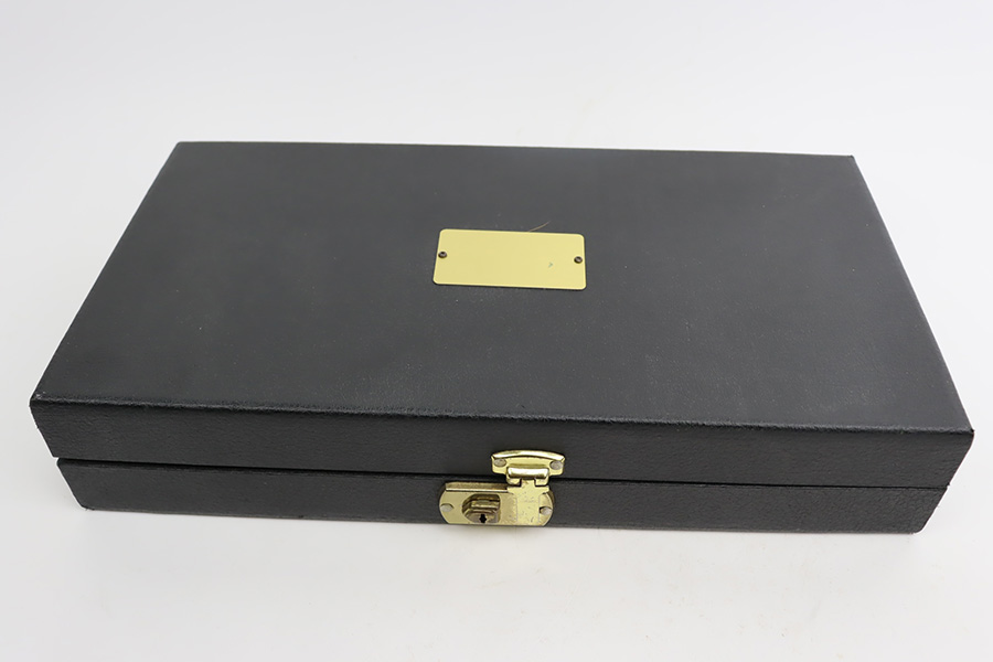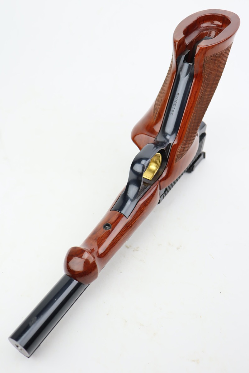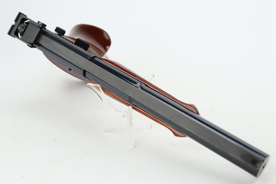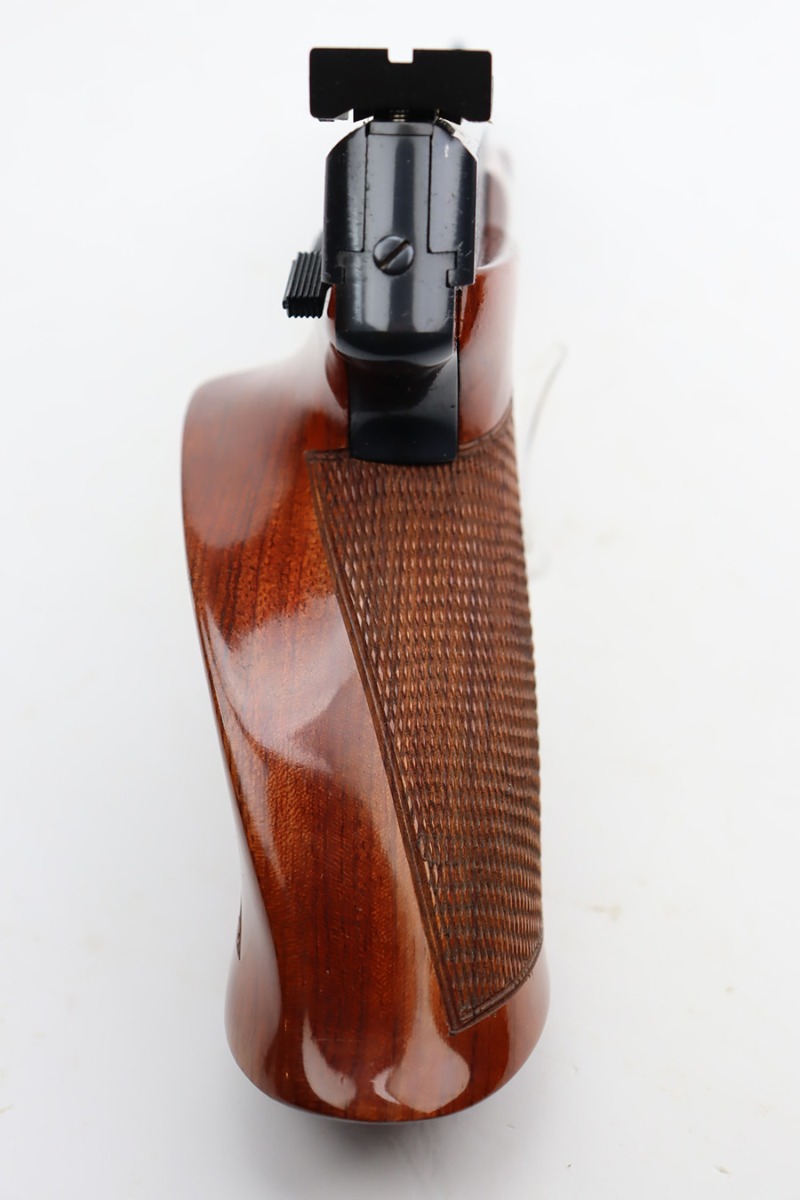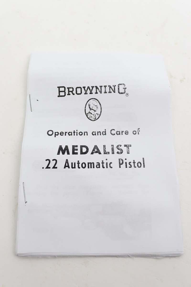 10/18/24 – This is a minty example of a Browning Medalist target pistol, manufactured in 1963 and chambered in .22 LR. Made in Belgium. It comes with a Browning presentation case, barrel counterweights, and an owners manual. 6.5in barrel with mint bore. Original blue with no notable wear. Excellent target grips. The case is also in excellent condition, with minor wear along the bottom.