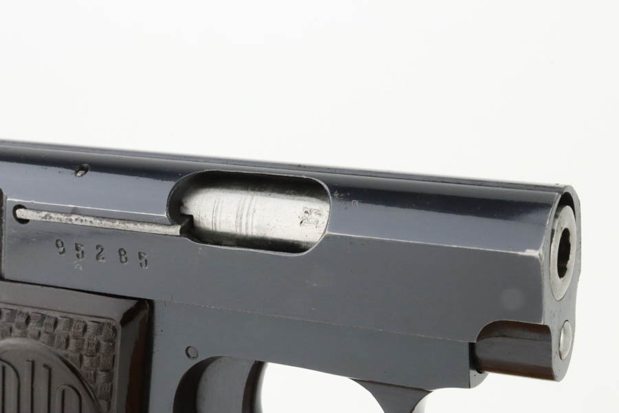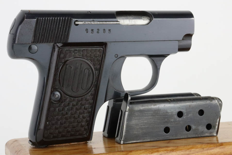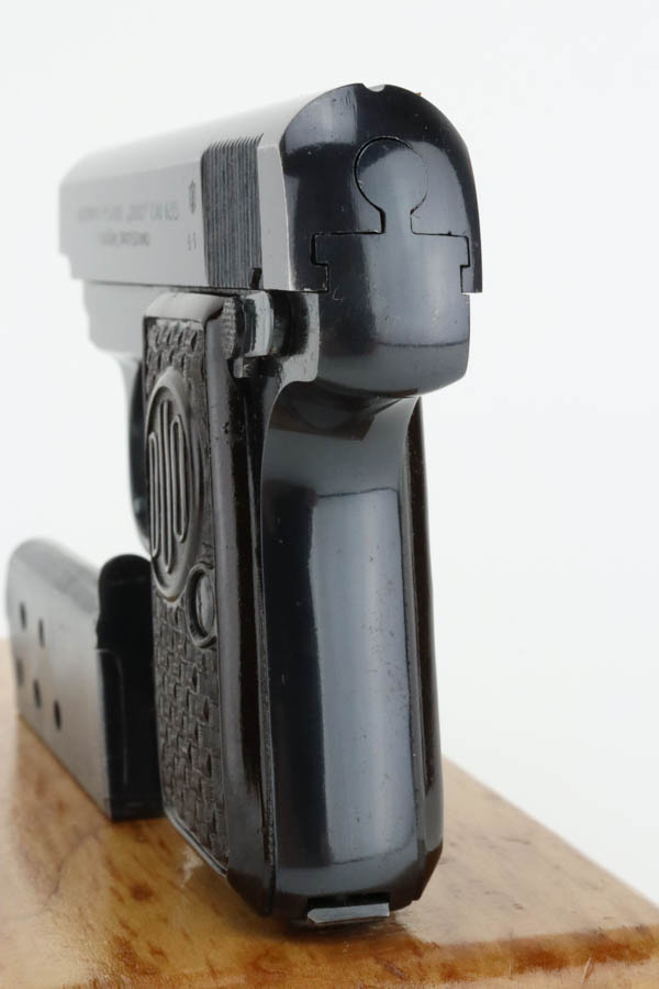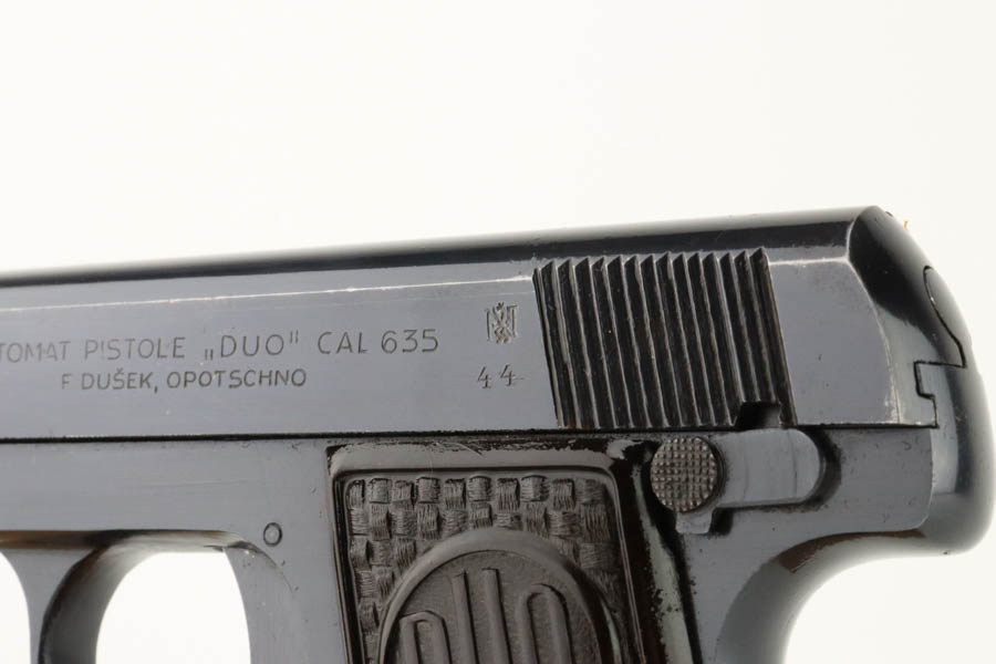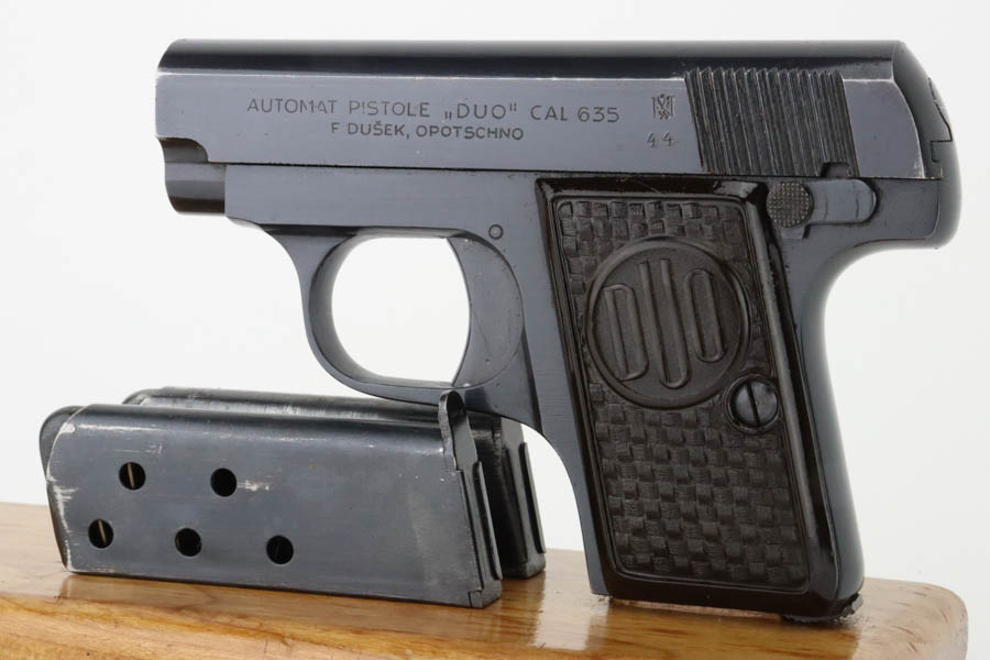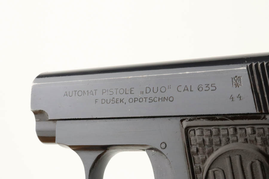 6/27/24 – This is a minty example of a Czech F. Dusek Duo pistol, manufactured in 1944 and chambered in 6.35mm or .25 ACP. All matching with the proper Czech Lion proofs. It comes as a rig with two magazines and a black leather holster embellish with a Nazi eagle pin. The gun has retained nearly all of its original high polish finish with just very minor high edge wear and areas of very light pin-pricking at the back right of the slide and on the back strap. Fitted with period-correct blackish-brown bakelite grips. Minty bore.