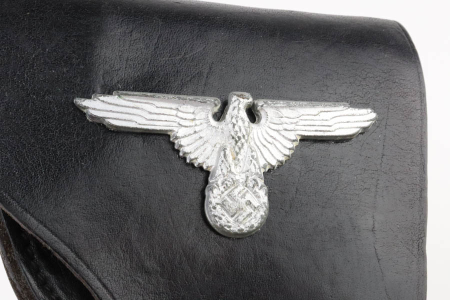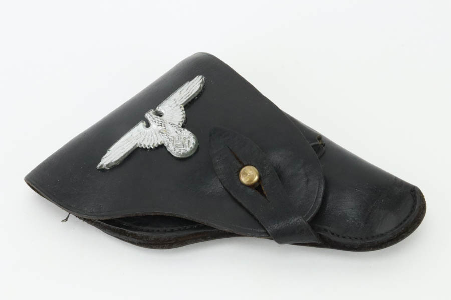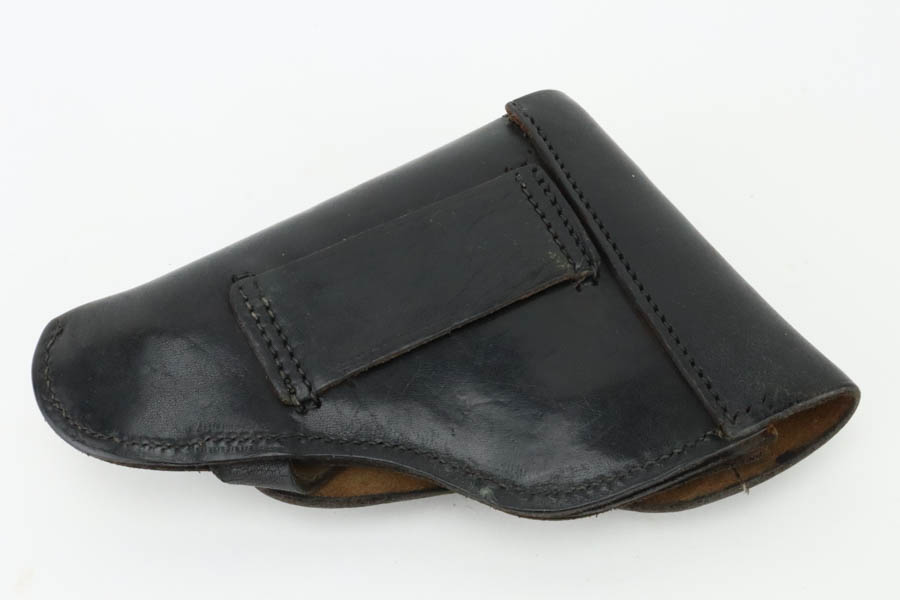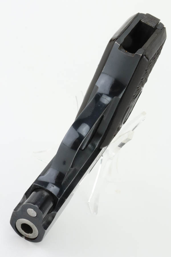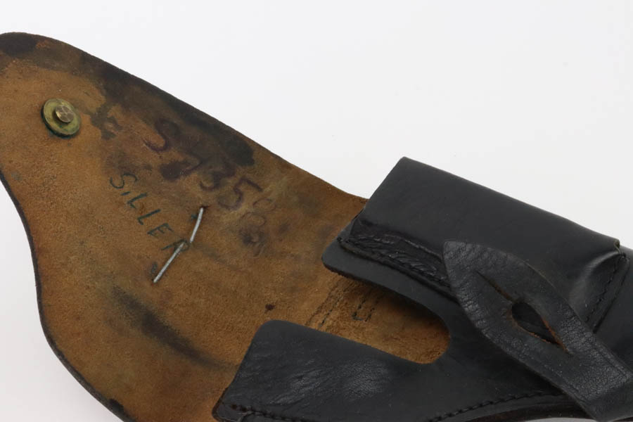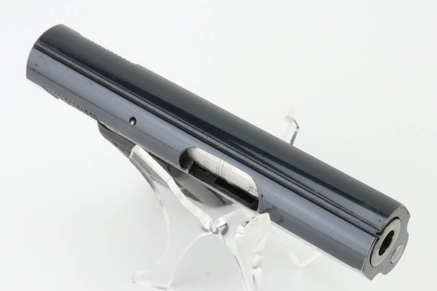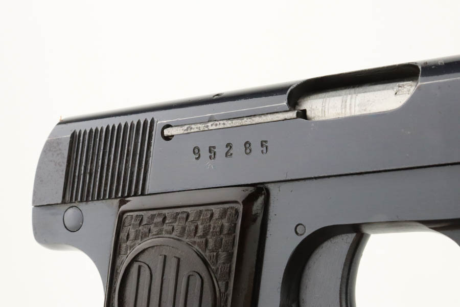 6/27/24 – This is a minty example of a Czech F. Dusek Duo pistol, manufactured in 1944 and chambered in 6.35mm or .25 ACP. All matching with the proper Czech Lion proofs. It comes as a rig with two magazines and a black leather holster embellish with a Nazi eagle pin. The gun has retained nearly all of its original high polish finish with just very minor high edge wear and areas of very light pin-pricking at the back right of the slide and on the back strap. Fitted with period-correct blackish-brown bakelite grips. Minty bore.
