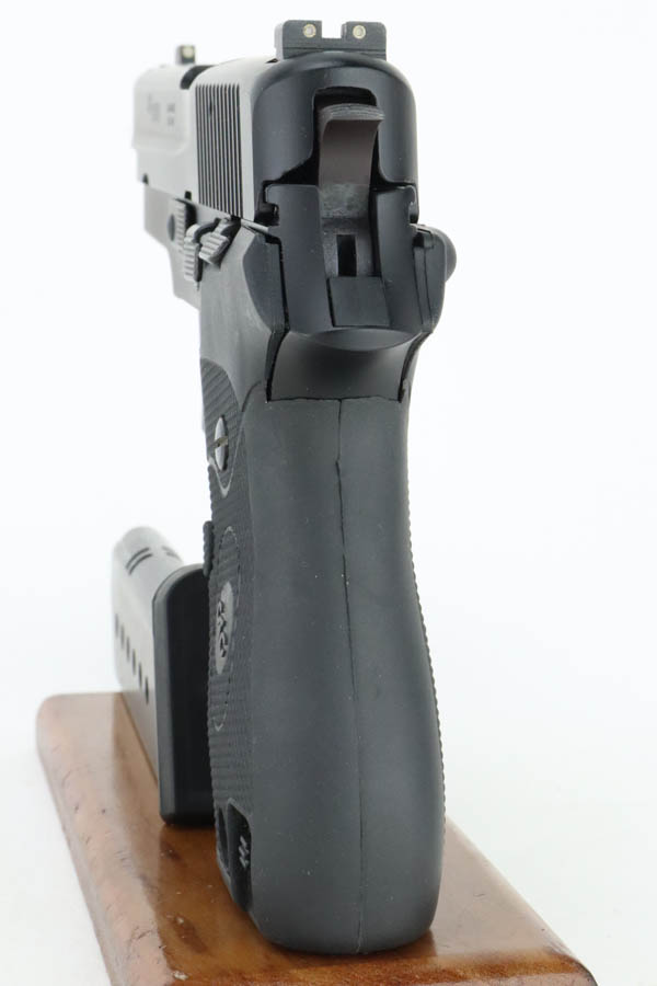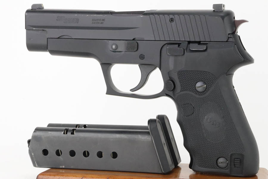 6/28/24 – This is a near-mint example of a Sig Sauer P220, manufactured in 1993 and chambered in .45 ACP. It comes with its original matching-numbered box, owners manual, and spare magazine. The gun is equipped with black rubber Crimson Trace red laser grips and comes with its original set of black plastic grips. There are almost no signs of wear or use except for a few tiny marks on the left side of the slide. Minty bore.