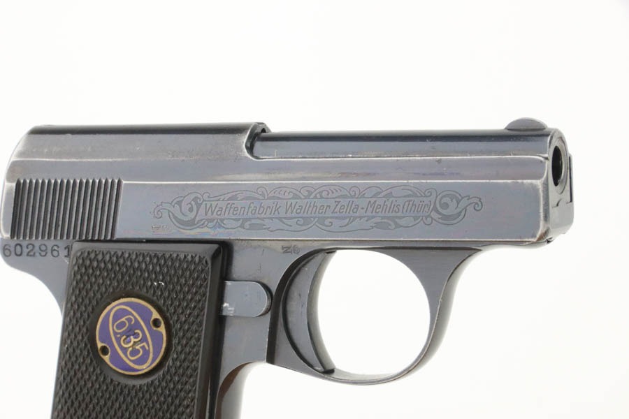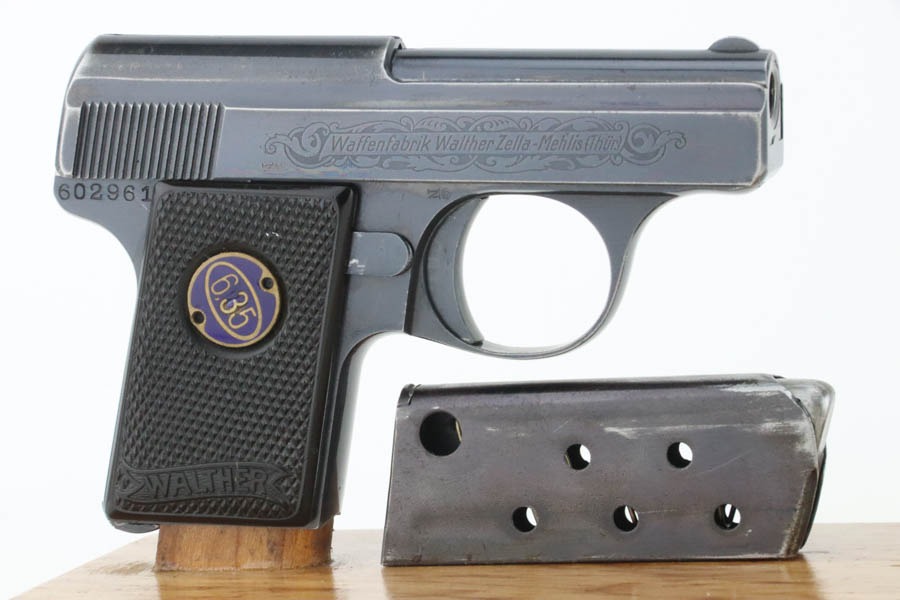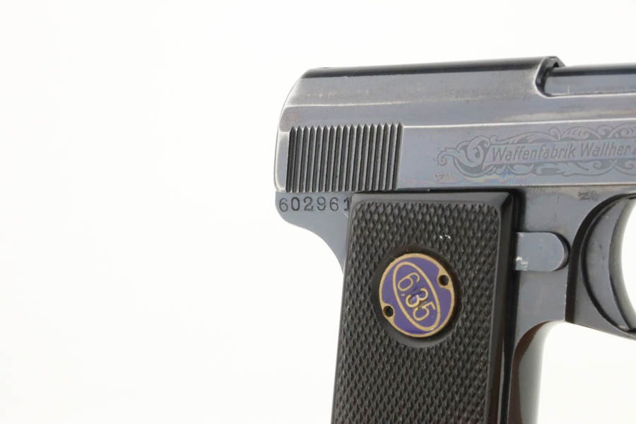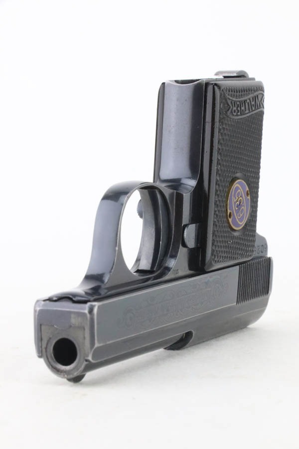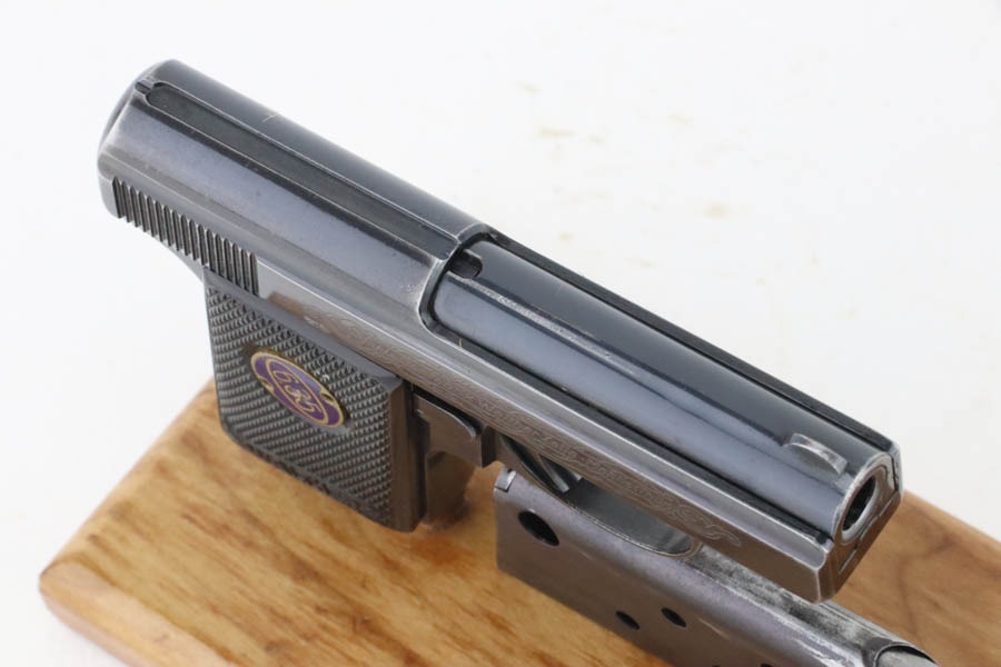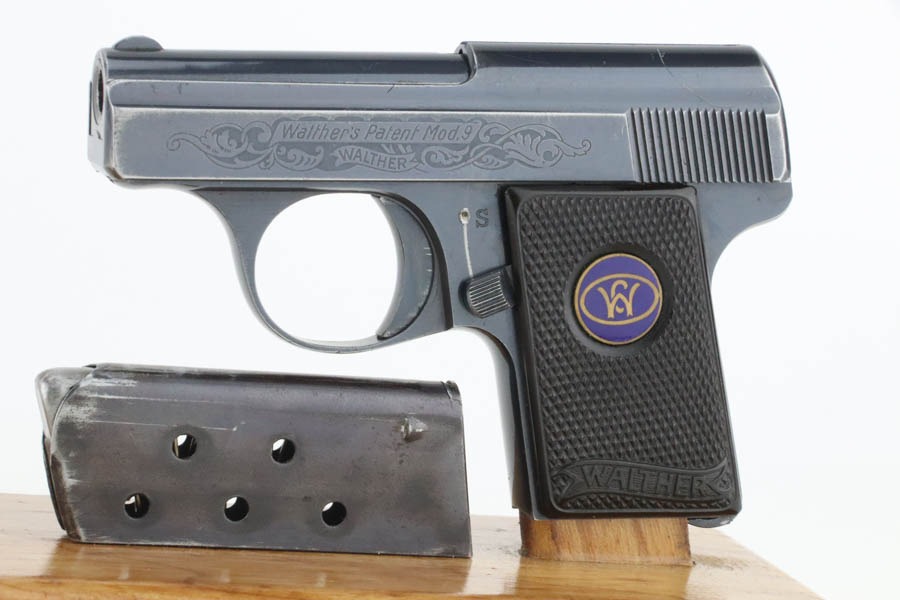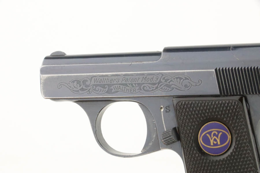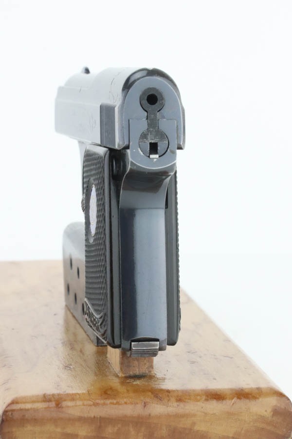 10/25/24 – For sale is a nice Walther Model 9a made during the interwar period. The pistol has a nice polished blued finish with both sides of the slide lightly engraved. The slide has the most of the finish loss with the frame having some edge loss. The The pistol has matching numbers on the slide and frame. The bore is bright with good rifling. The grip panels are incorrect for a 9a and are meant for a 9b.