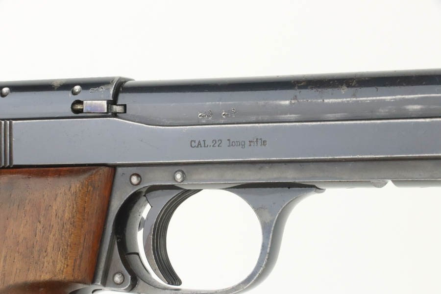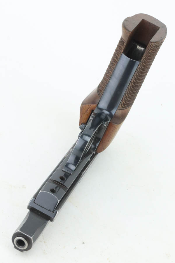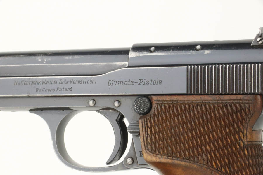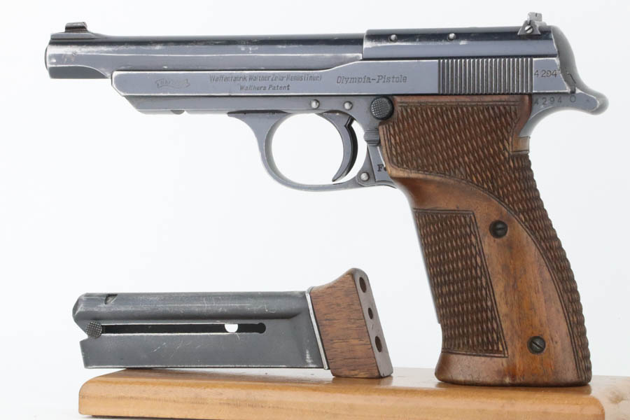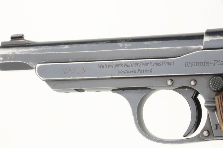 8/27/24 – This is a nice example of a Walther Olympia pistol, made in the Zella Mehlis factory before WW2. Chambered in .22 LR. It is all matching and “Crown N” proofed. The gun has retained roughly 85% of its original high polish finish. There is general high edge wear, muzzle wear, spotty wear along the barrel, and an area of noticeable pitting on the top of the barrel. Fitted with very nice checkered wood grips and comes with a matching-numbered wood bottom magazine. Mint bore.