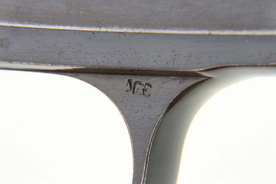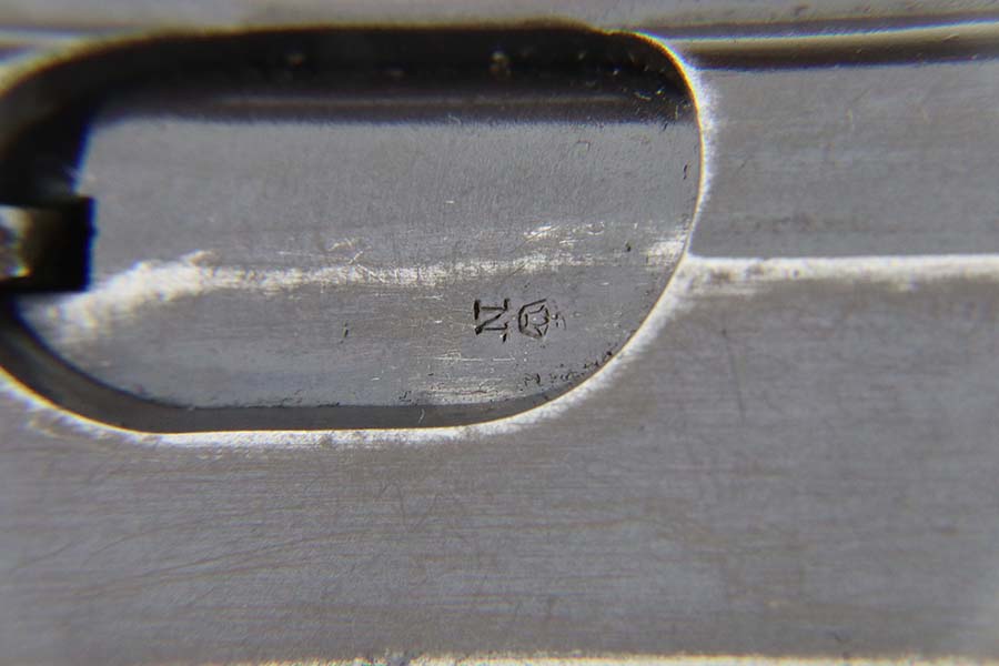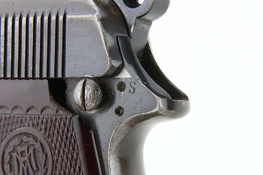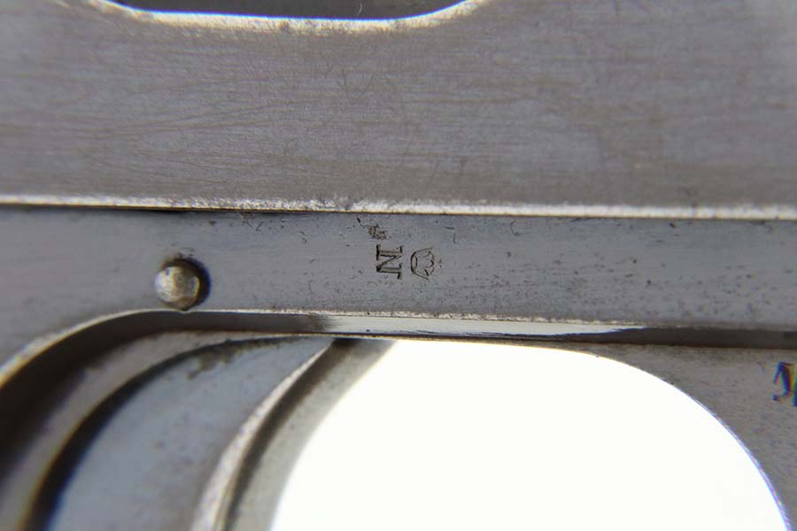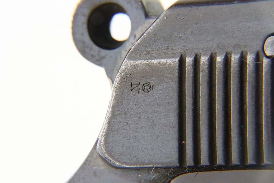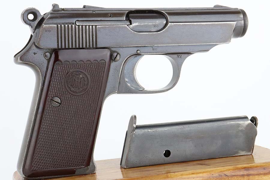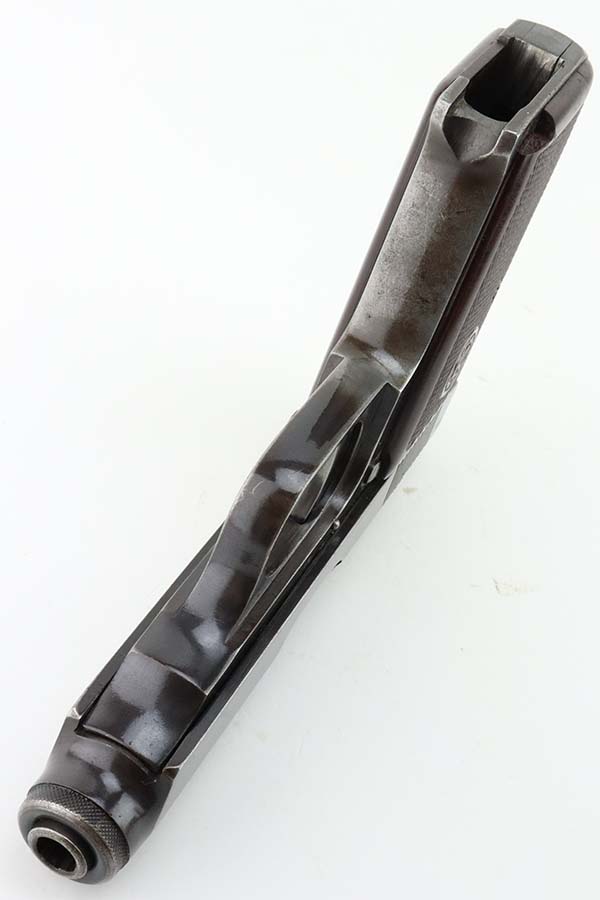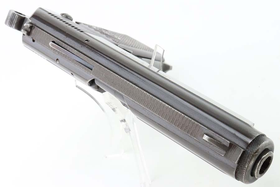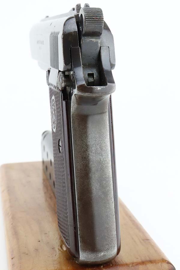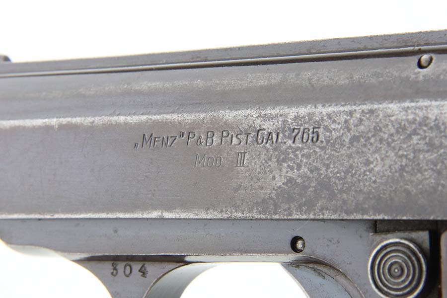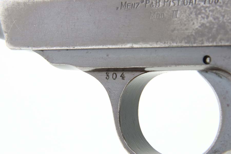 3/18/24 – This is a nice example of a rare Menz P&B Model III from the 1930’s. On 12 April 1928 a new law was promulgated in Germany that required individuals to obtain a permit to buy a gun, and also a license to carry a gun. The same law also established a legal framework for firearms manufacture. Due to these new restrictions on purchase and ownership of guns, gunmakers began to target sales somewhat more toward police and military than they had previously. This was certainly Walther’s goal when they named their new double-action gun the Polizei Pistole (PP) in 1929. (I should note, however, that prototypes for the PP began to appear as early as 1925.) A shorter version of the PP, the PPK, appeared in 1931. The success of both these guns were noted by Walther’s competitors. The P&B Model III was Menz’s answer to the market, essentially a copy of the Walther PPK. This one is matching and “Crown N” proofed. Its finish rates roughly 60% with obvious finish loss and brown patina throughout. Some spotty oxidation on the left side of the slide. Fitted with period-correct “AM” monogram grips and comes with one proper magazine. Excellent bore. NOTE: The safety lever is missing on this example.