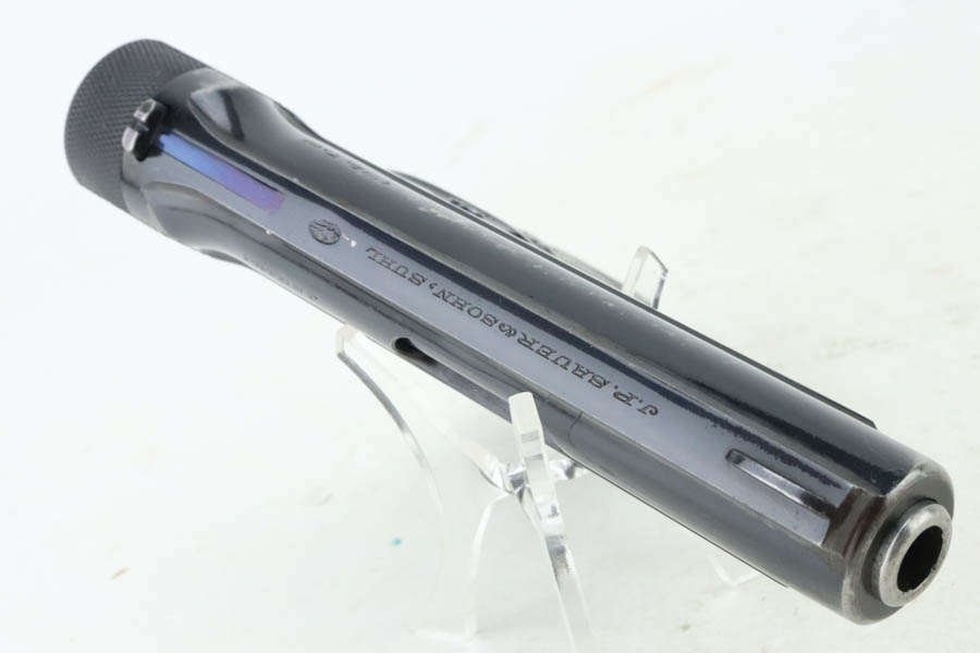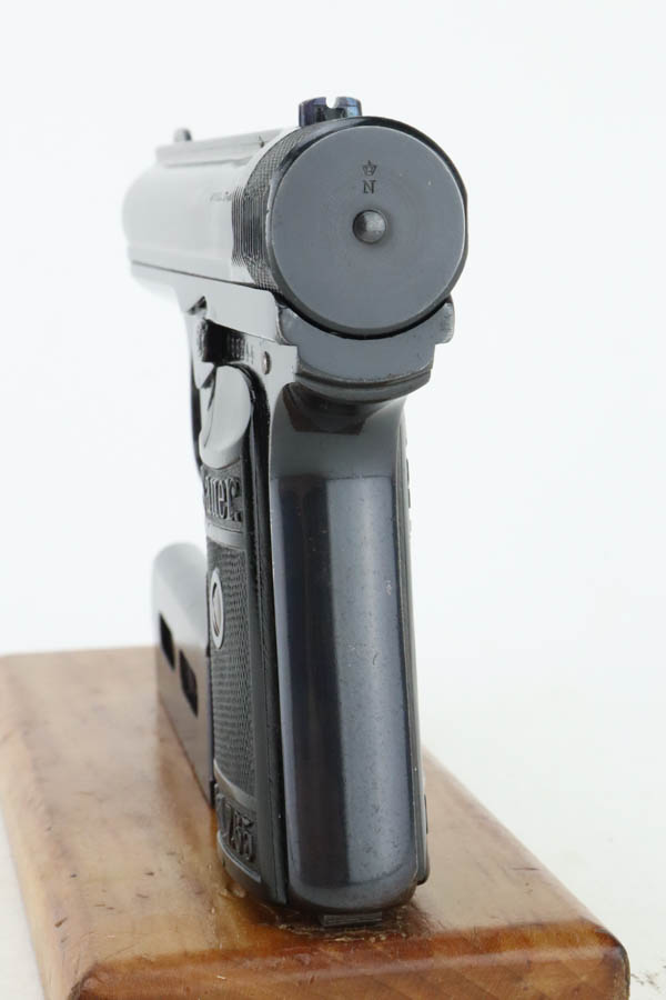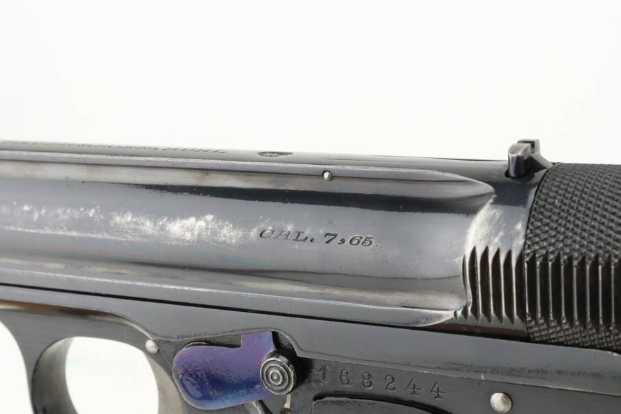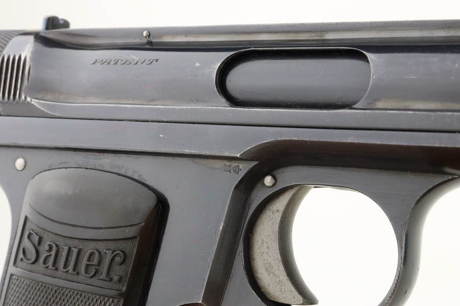 6/3/24 – This is a very rare Sauer model 1926 export. There were only 3,000-4,000 of this variation produced, and not a lot is known about them. This one has the telltale characteristics that separate it from the 1919 model and the 1929/30. The serrations on the cocking knob continue to the slide, and the trigger guard is the (correct) later oval shape. This one is all original and correct with about 90% high-polish blue remaining. There is minor muzzle wear, some light spotty wear along the left side of the slide, and some dulling on the front strap. Beautiful fire bluing on the safety lever. Excellent grips and proper magazine. Excellent bore.