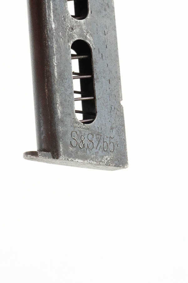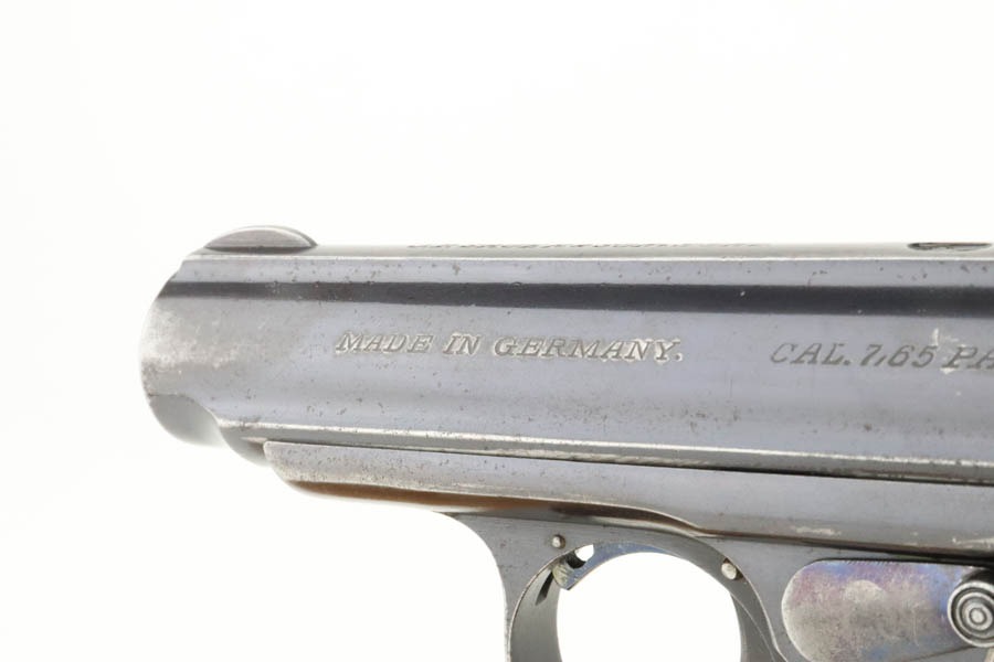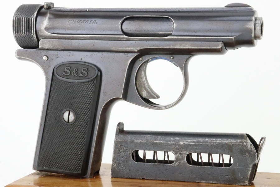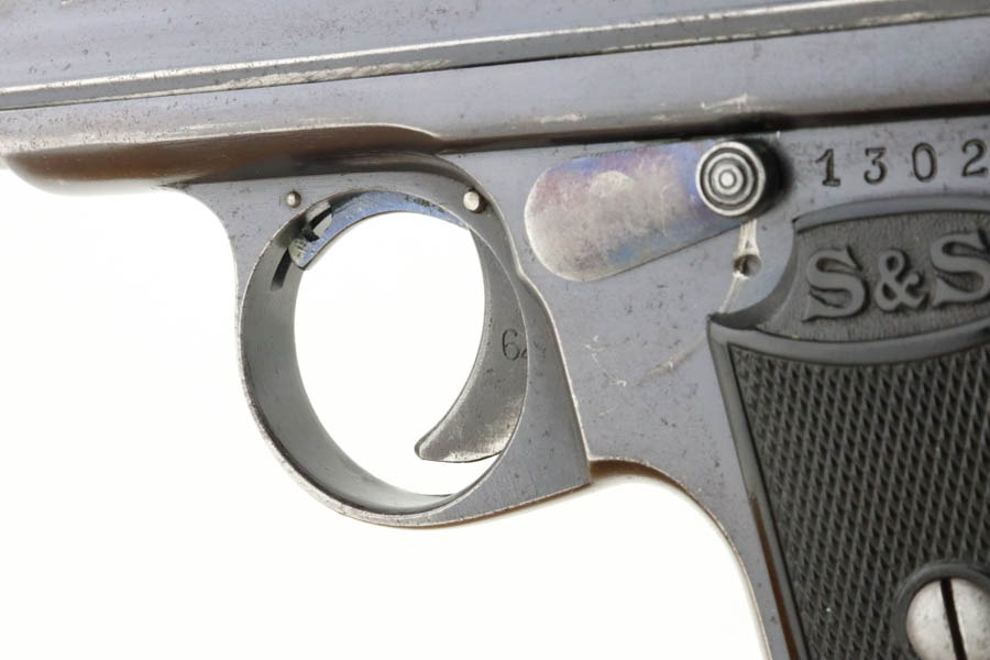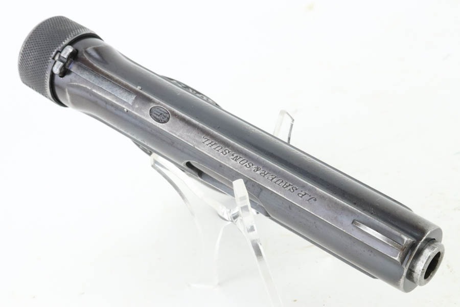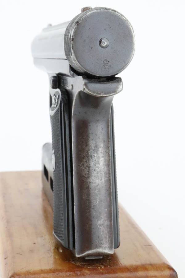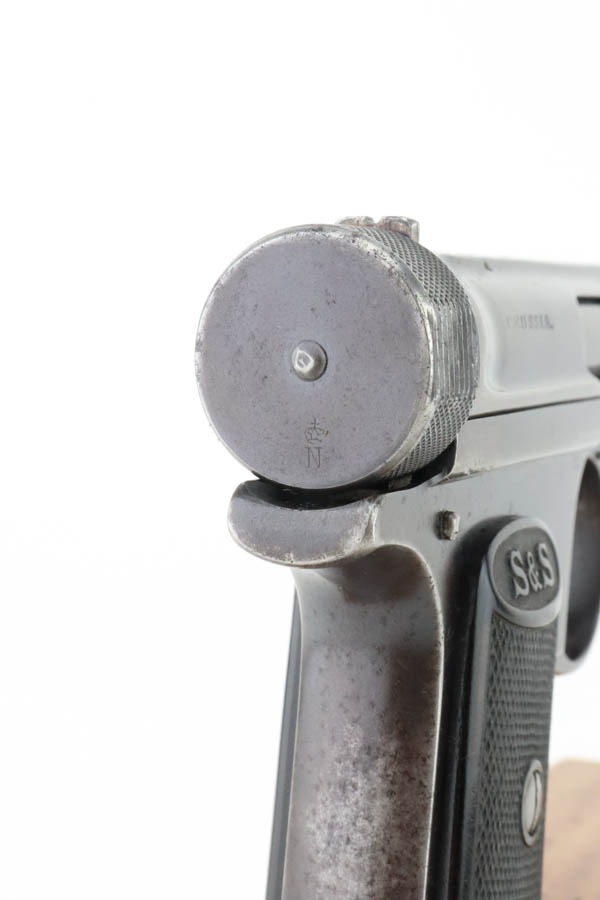 11/4/24 – This is a nice example of a Sauer Model 1913. It is all matching, has the proper “Crown N” proofs, “Made in Germany” marking on the left side of the slide, and a “Prussia” marking on the right side of the slide. This is an English export model. It has retained somewhere between 85-90% of its original finish. General high edge wear with thinning and spotty patina on the grip straps. A hint of fire-bluing remaining on the safety lever. Fitted with period-correct bakelite grips and comes with one proper magazine. The bore has good rifling, but there is pin-pricking throughout.