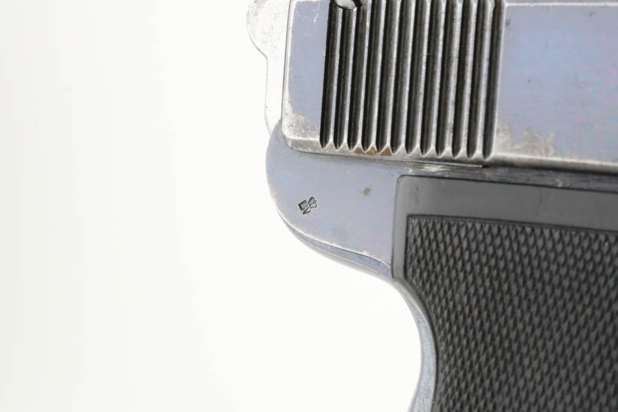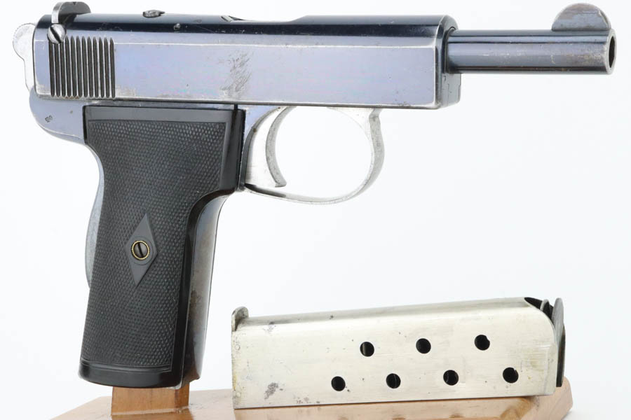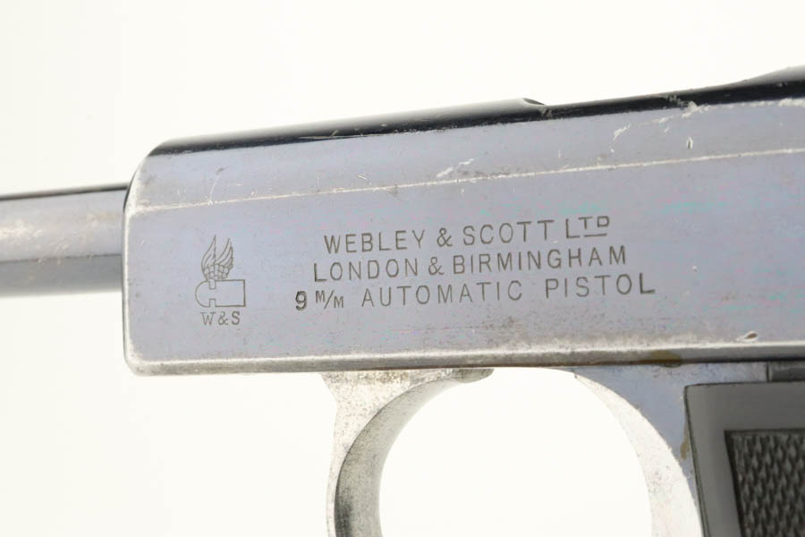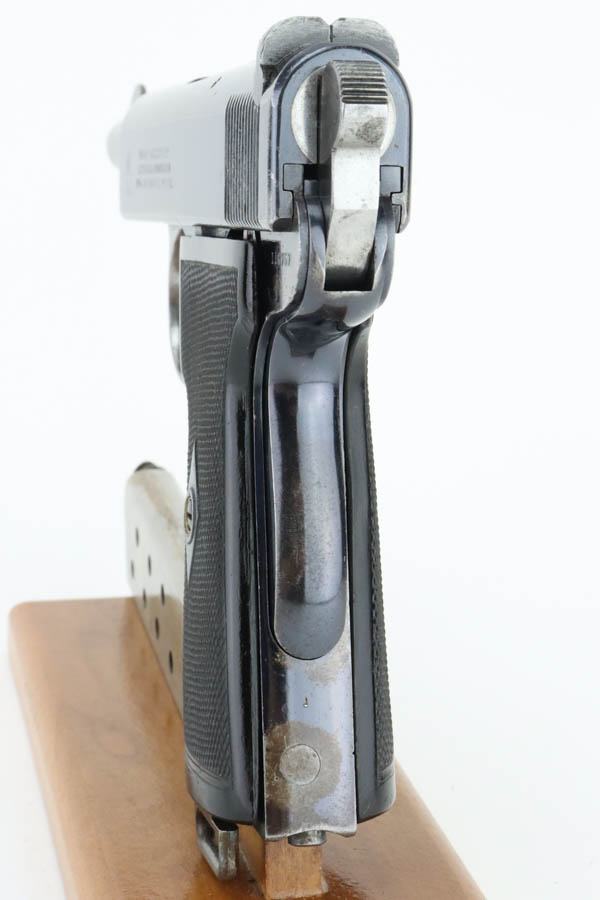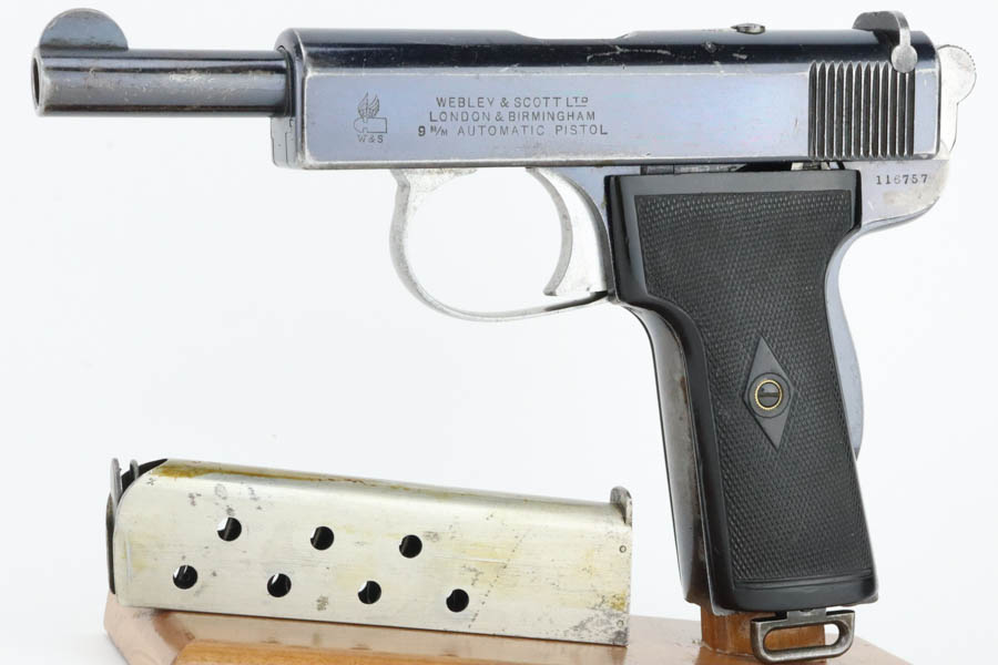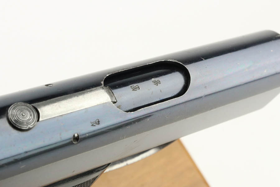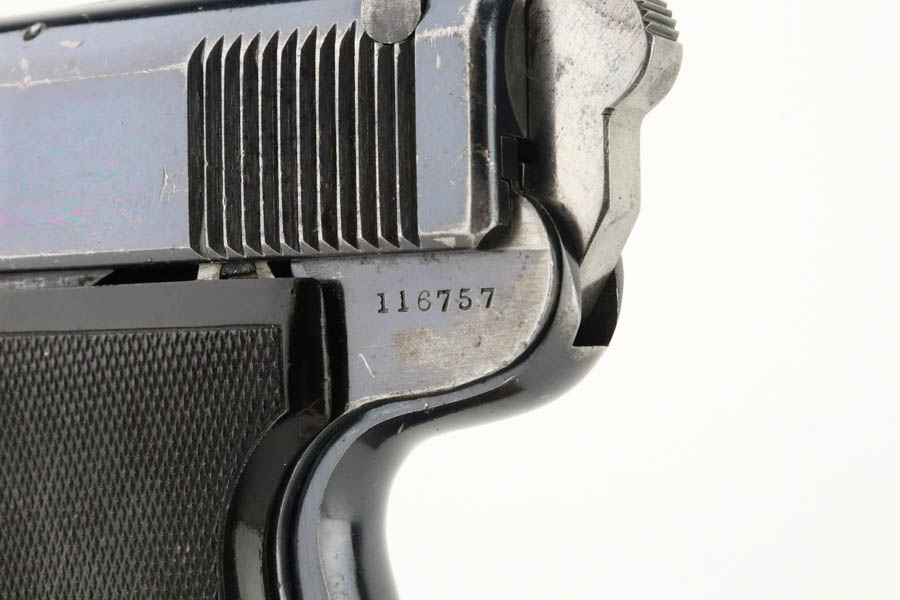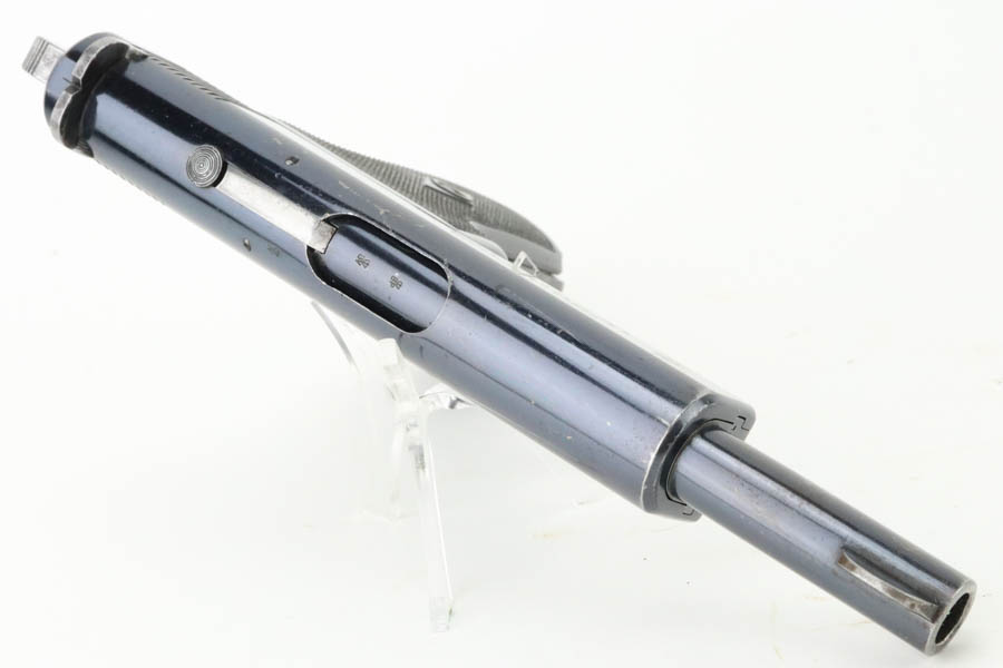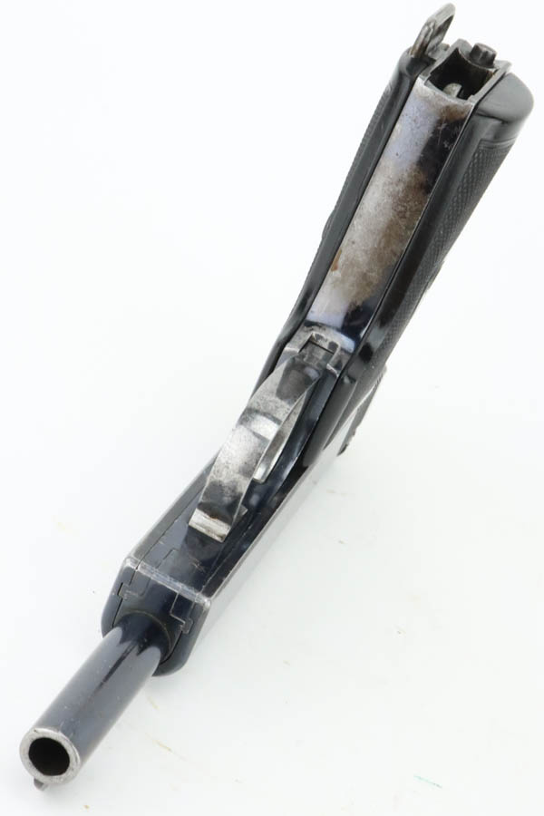 6/4/24 – This is a rare Webley & Scott Model 1909, manufactured in 1909-14. These are rare, as only about 1,700 were made. All matching with the proper proofs. Its original high polish finish rates roughly 80% with muzzle wear, general high edge wear, finish loss on the grip straps, and minor scratchy wear throughout. Fitted with period-correct bakelite grips. The rifling in the bore is fairly worn with very light pin-pricking throughout.