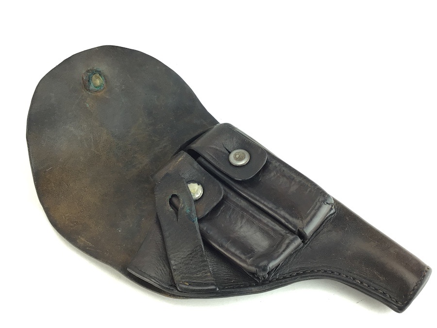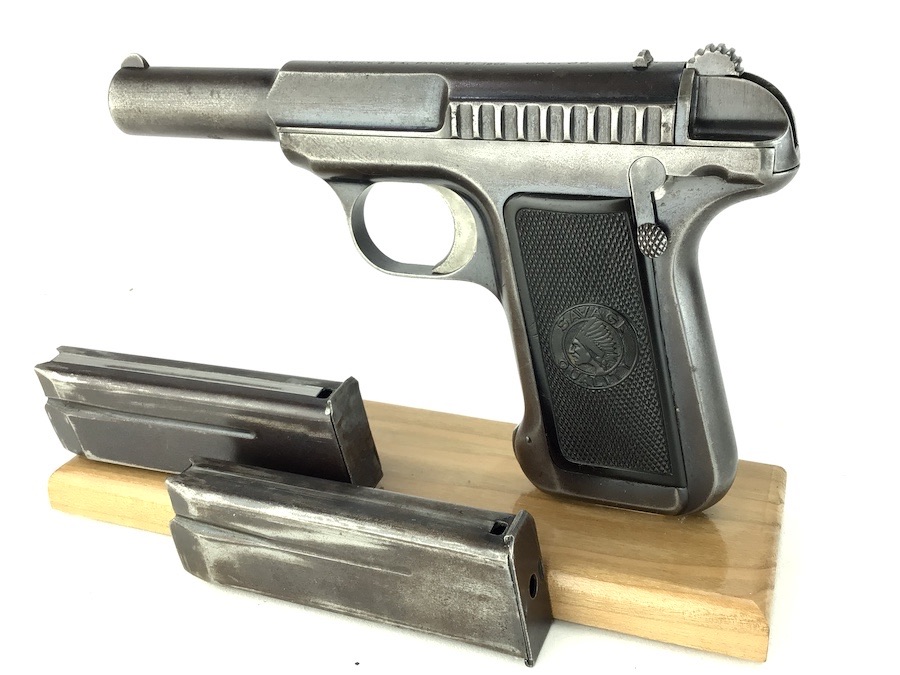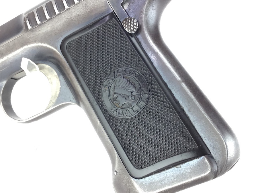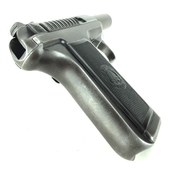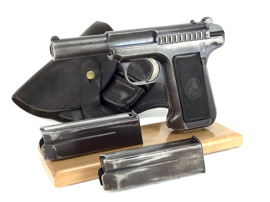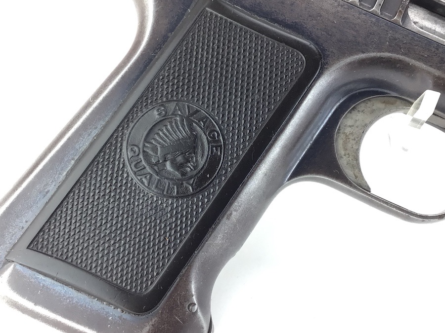 12/4/24 – This is a nice example of a Savage Model 1907 pistol chambered in 7.65mm and manufactured in 1910. The gun is all matching and has retained roughly 80% of its original high polish finish. Most of the finish loss is on the grip straps, where there is noticeable thinning. There is also minor wear around the high edges in general and around the muzzle. Includes excellent black grips, two magazines and holster. The bore is clean and has fair rifling. The right magazine pouch on the holster has loose snap. Otherwise, stitching is intact and secure.