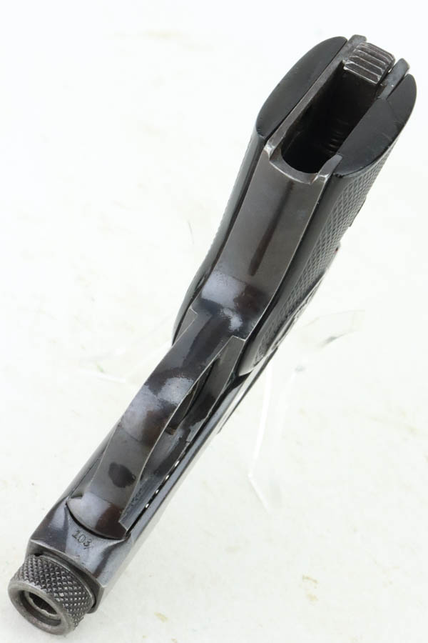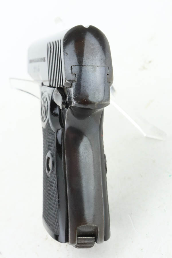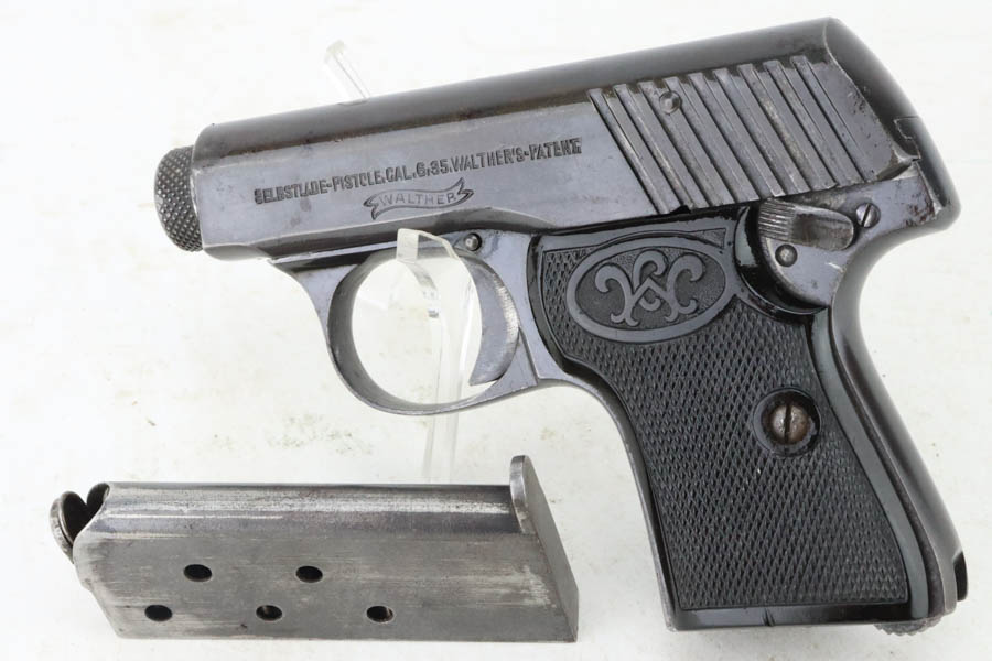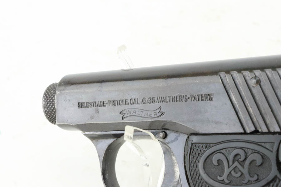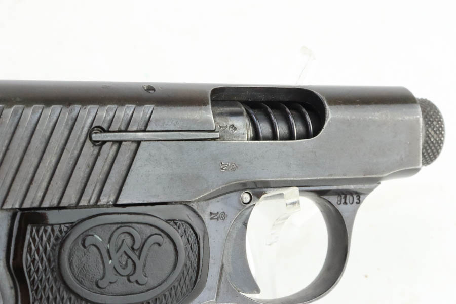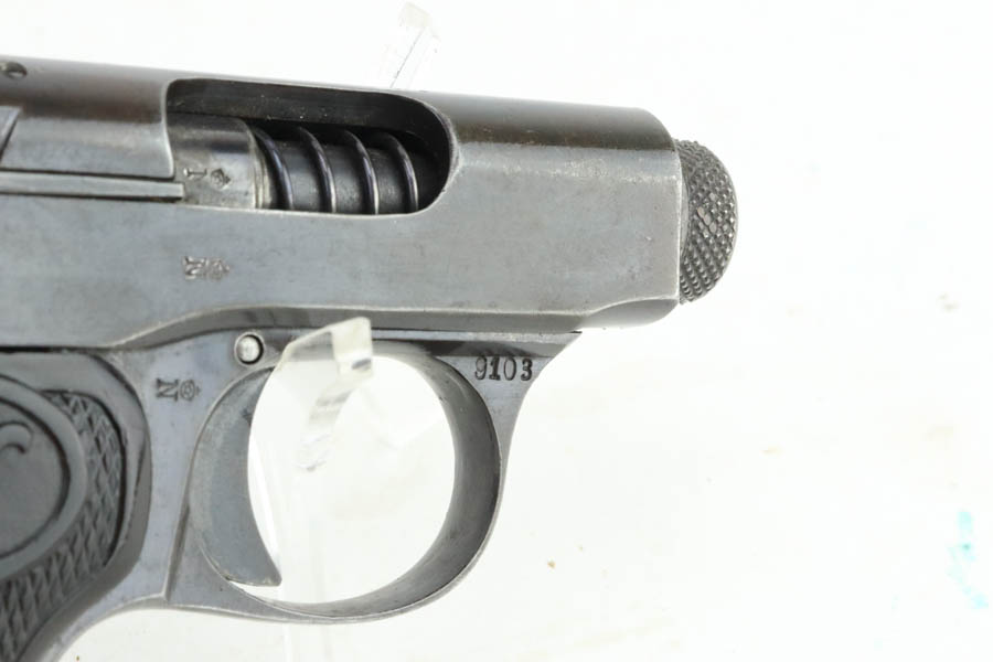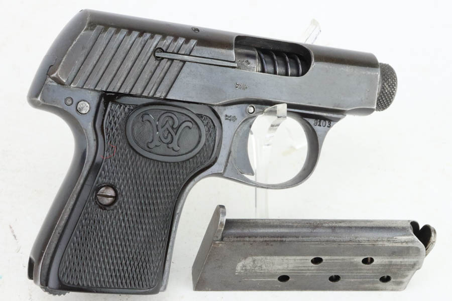 6/3/24 – This is a Walther Model 2, manufactured in 1913-15 and chambered in 6.35mm. All matching and “Crown N” proofed. It has retained about 93% of its original finish. While there is very little actual finish loss, there is light brown patina throughout. Fitted with black bakelite grips and comes with one proper magazine. The bore shows pitting throughout.