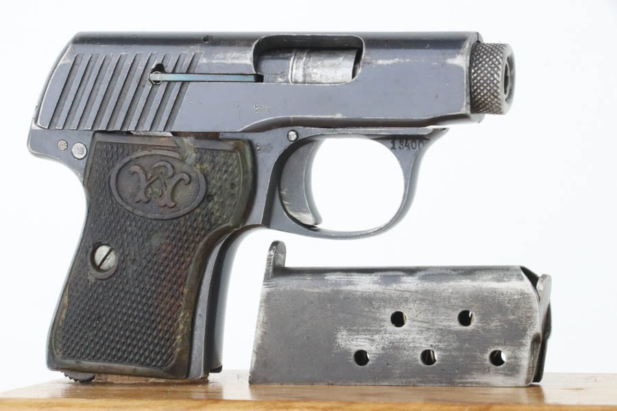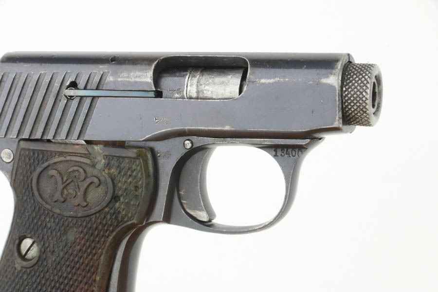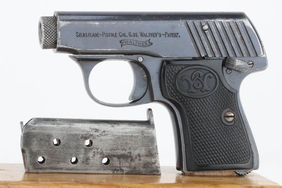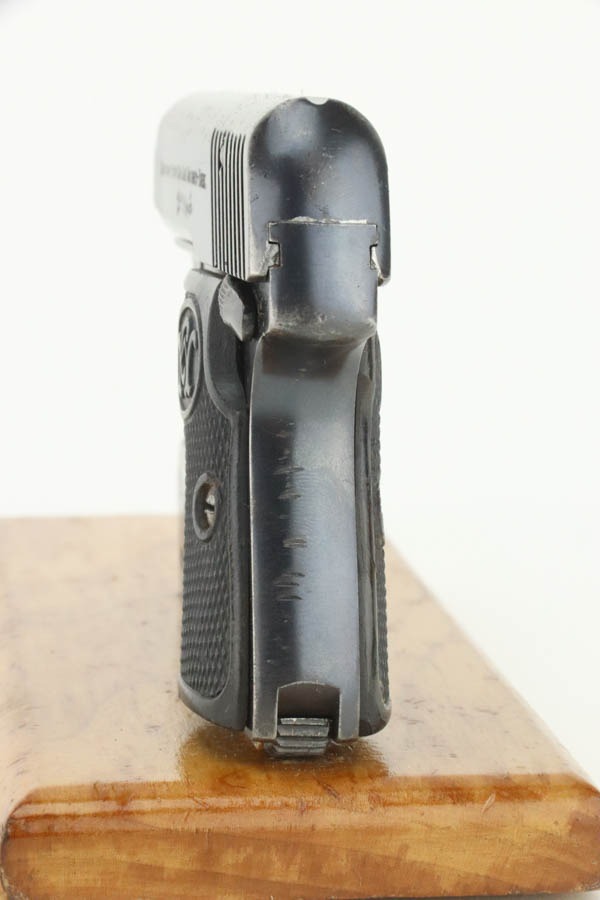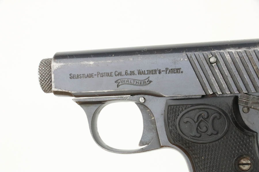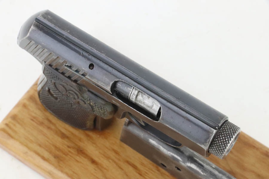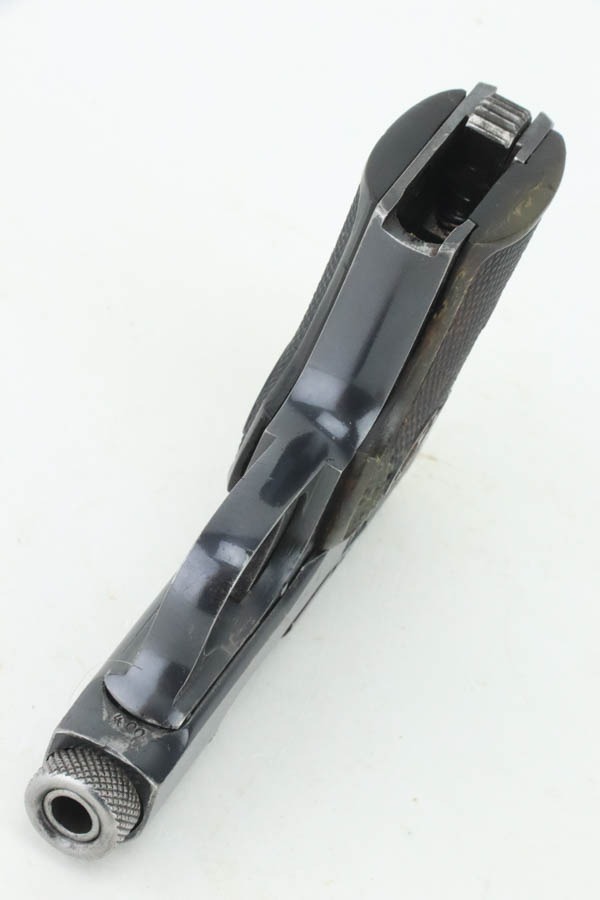11/7/24 – This is a very nice example of a Walther Model 2, manufactured in 1913-15 and chambered in 6.35mm or .25 ACP. This is the variation without the loaded chamber indicator. All matching and “Crown N” proofed. Its original finish rates about 93% with general high edge wear and some dings along the back strap. The left grip is black bakelite, and the right is made of horn. On the right side, there is a chip and a few tiny bore holes. Comes with one magazine. The bore has pretty good rifling, but there is light pin-pricking throughout.