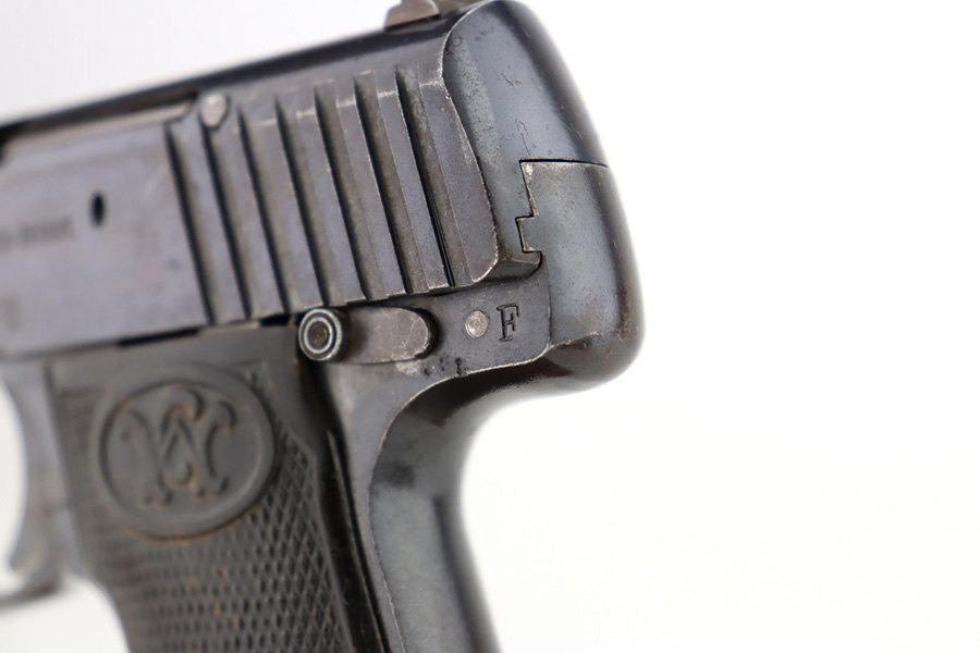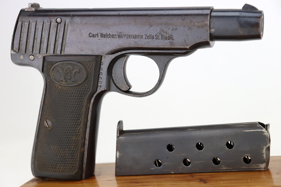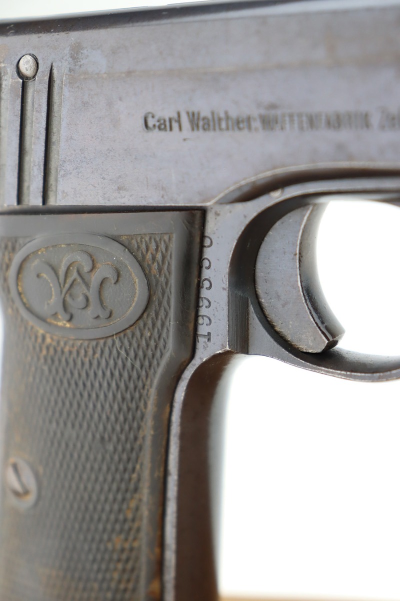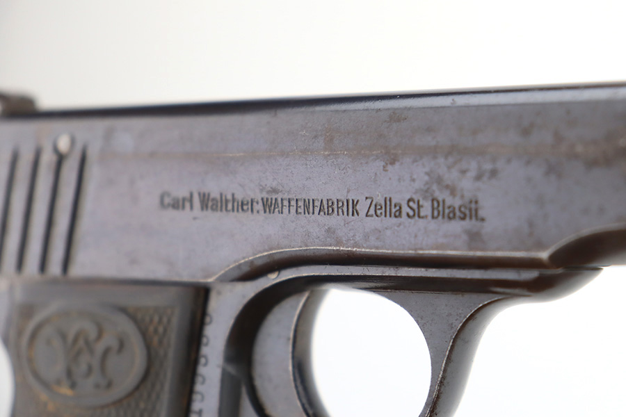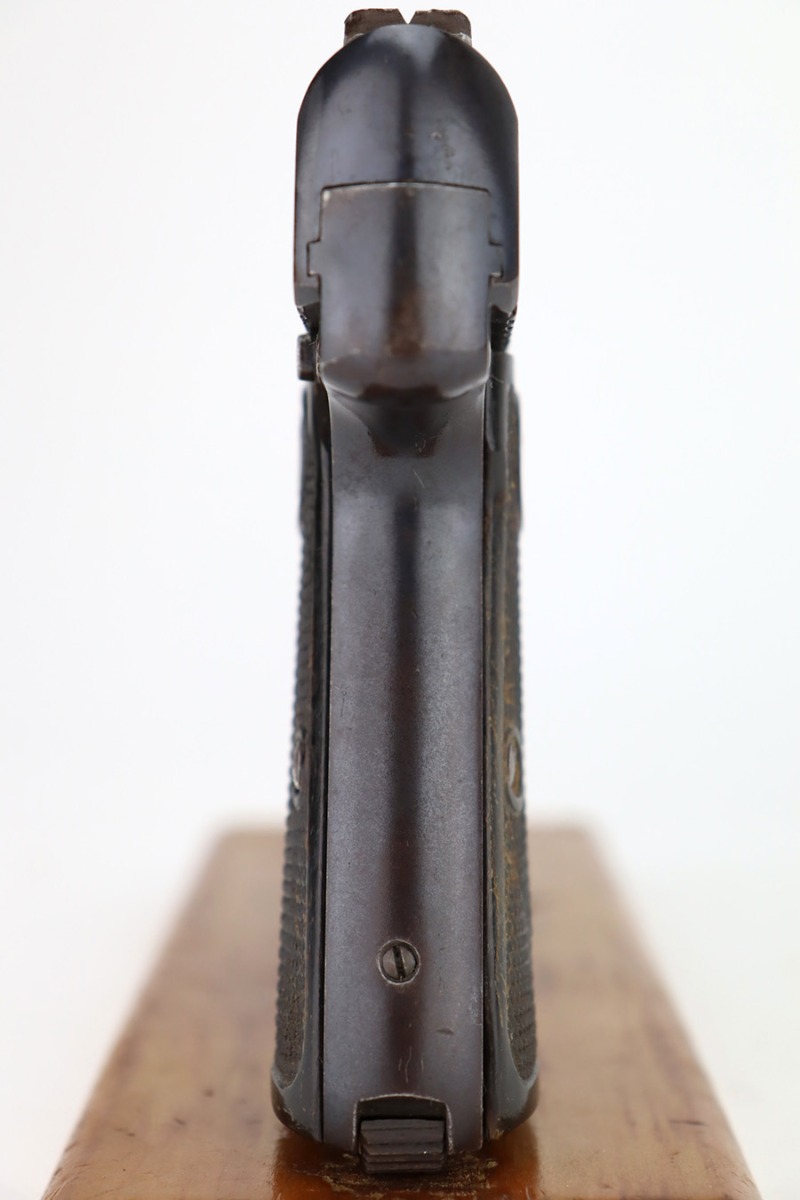 7/1/24 – This is an excellent example of a Walther Model 4 from the 1920’s. All matching with “Crown N” proofs. The hammer and firing pin were broken but have been replaced by our gunsmith. The originals are included. It has retained nearly all of its original finish but there are areas of minor oxidation visible here and there. Fitted with black bakelite grips and comes with one proper magazine. The bore has pretty good rifling, but there is frosting in the grooves.