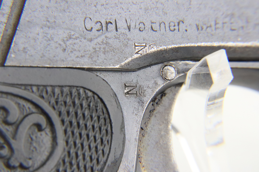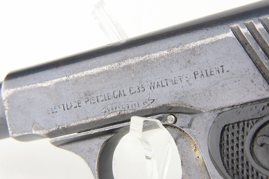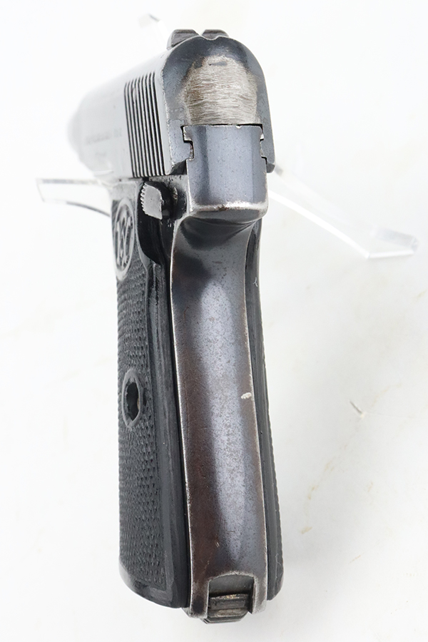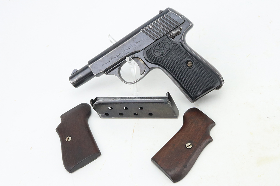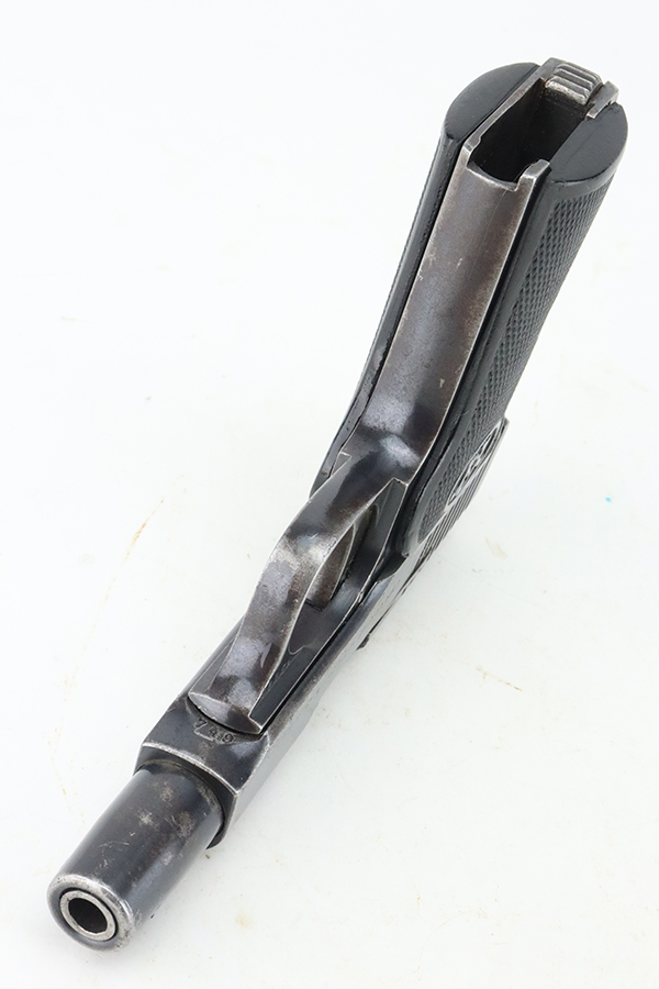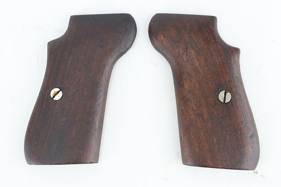 7/19/24 – This is a nice example of a Walther Model 7 from the 1920’s. All matching with “Crown N” proofs. It has retained about 90% of its original finish. The wear is mostly concentrated around the high edges, and there is light pin-pricking throughout. Fitted with black bakelite grips and comes with a spare set of wood grips. Comes with one magazine. The bore has decent rifling. However, there are two slight bulges in the barrel.