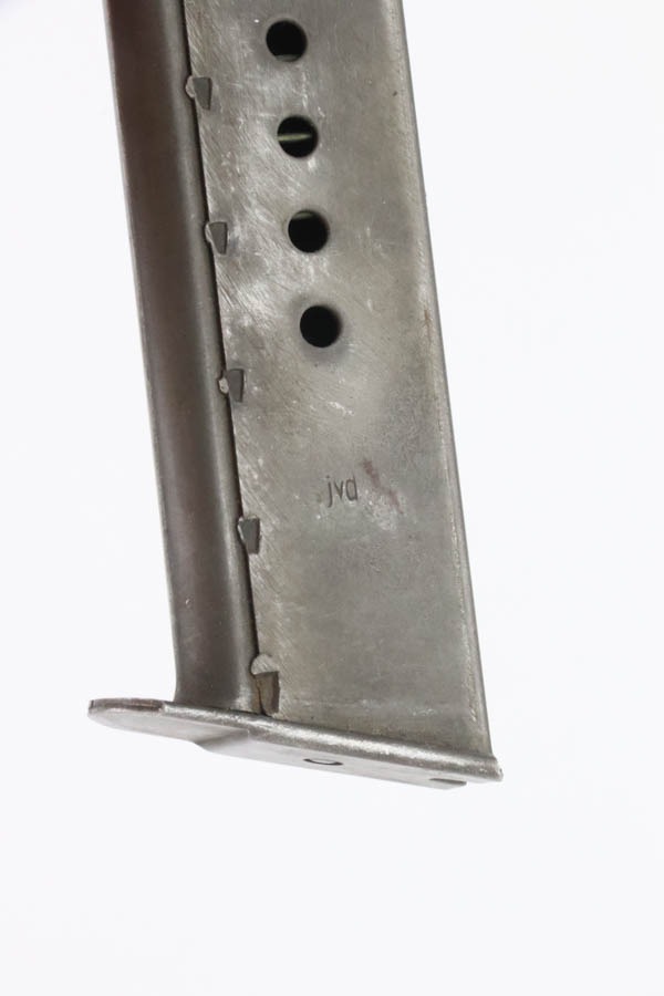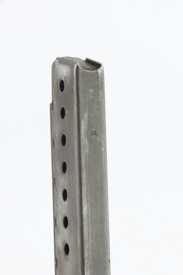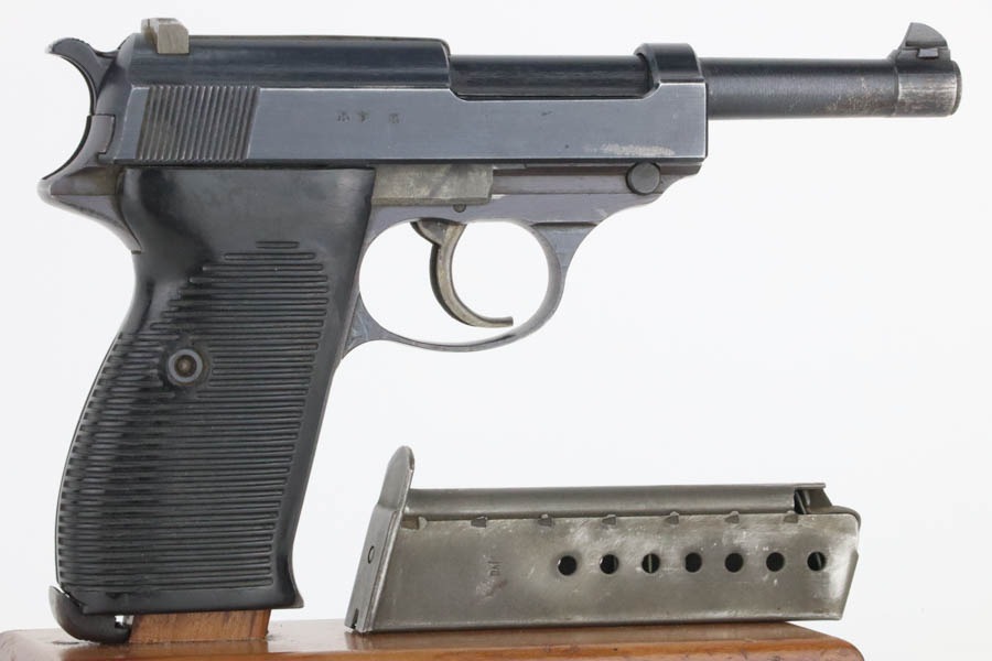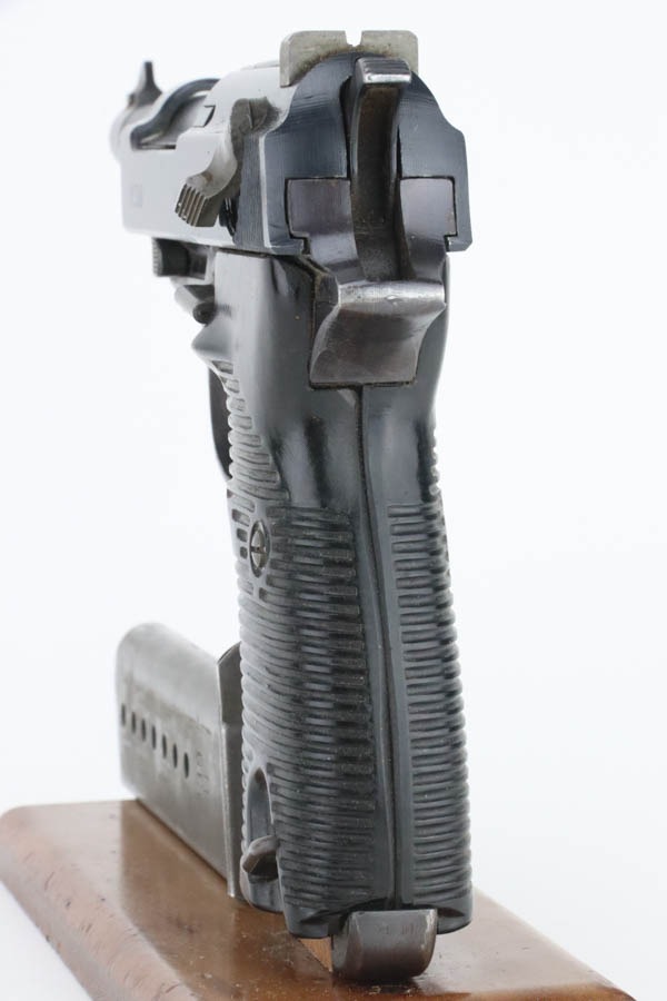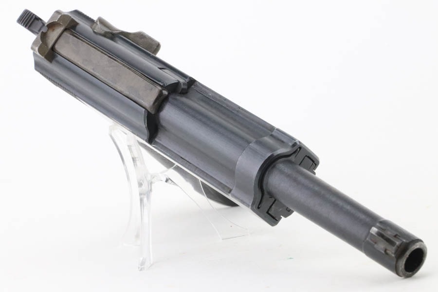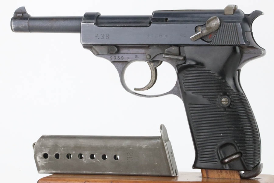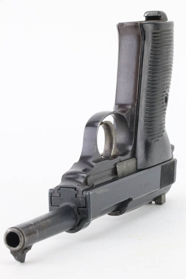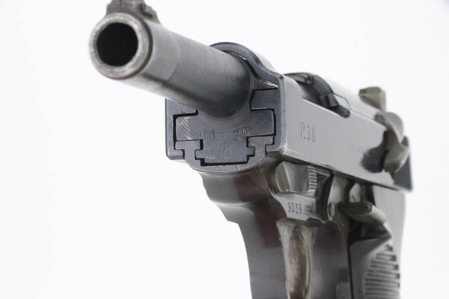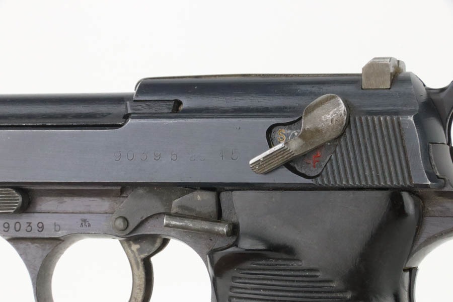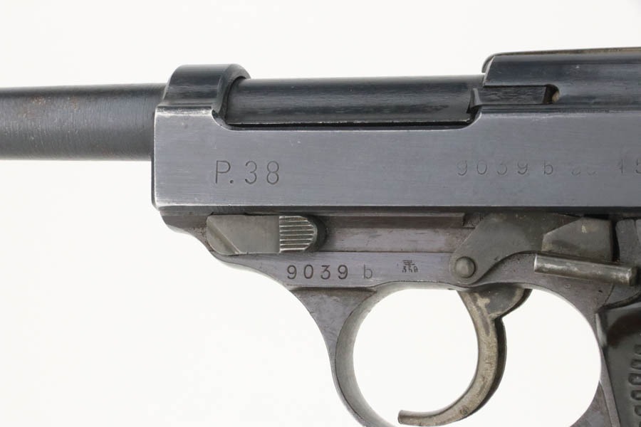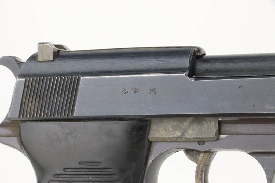 12/3/24 – This is an excellent example of an end-of-war AC 45 Walther P.38 issued to the Nazi military in 1945. It is all matching and has the proper “Eagle 359” military acceptance proofs. This one has a rare “Waffen 76” marked barrel, indicating it was made at the Czech FNH factory. It has all the proper late-war features, such as rough machining on the barrel and phosphate small parts. It has retained about 96% of its original finish with very minor high edge wear and some wear around the muzzle. Fitted with blackish-brown bakelite grips and comes with a rare, end-of-war, phosphate, “U” marked magazine – Walther marked “Eagle 359”. Mint bore. De-cocker is functional.