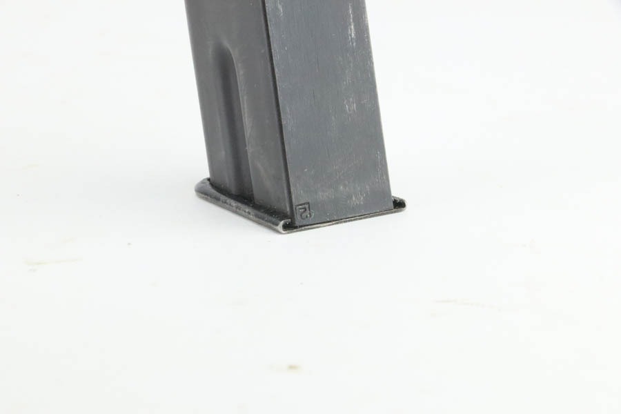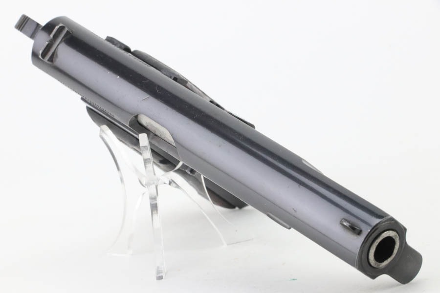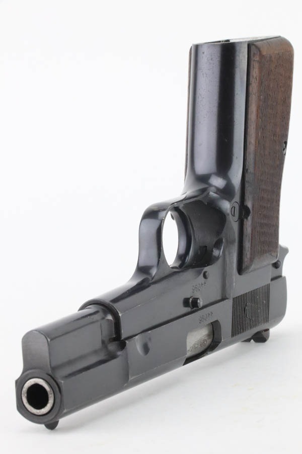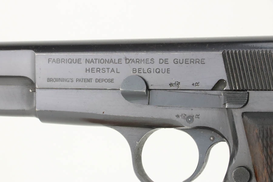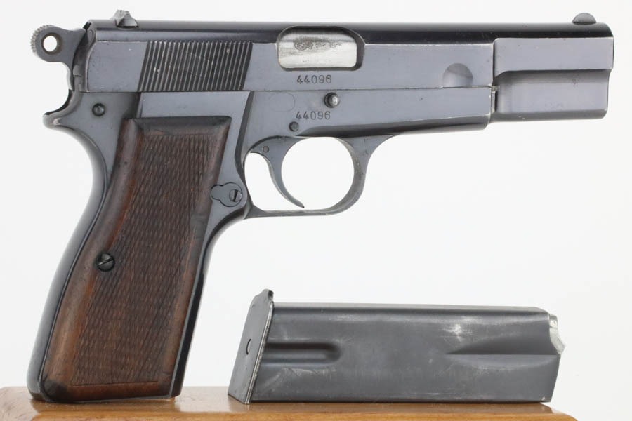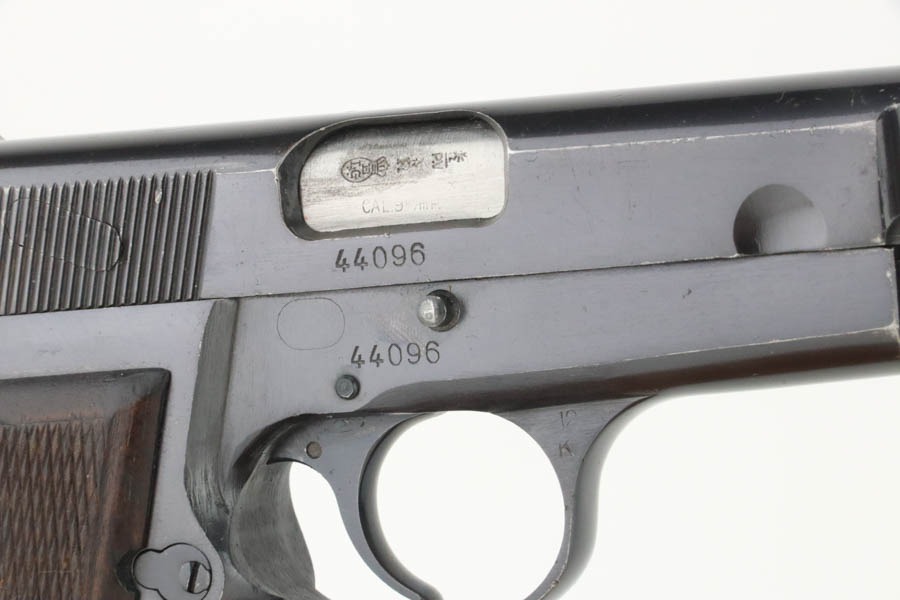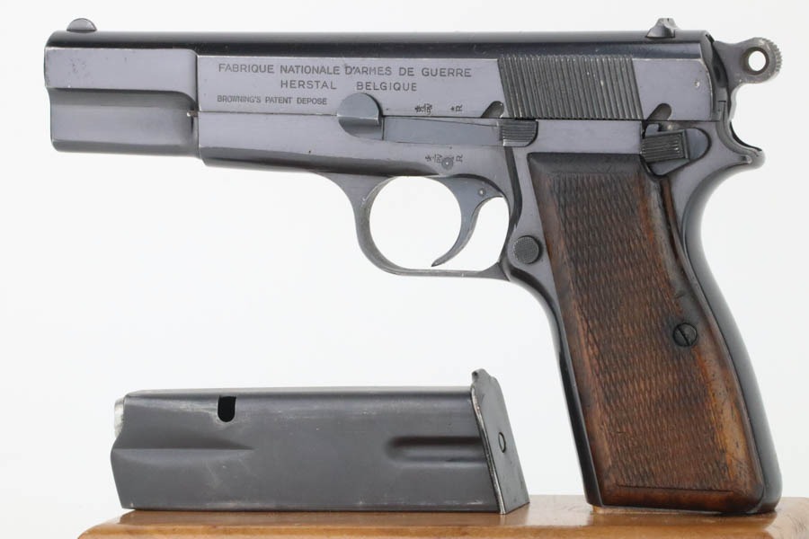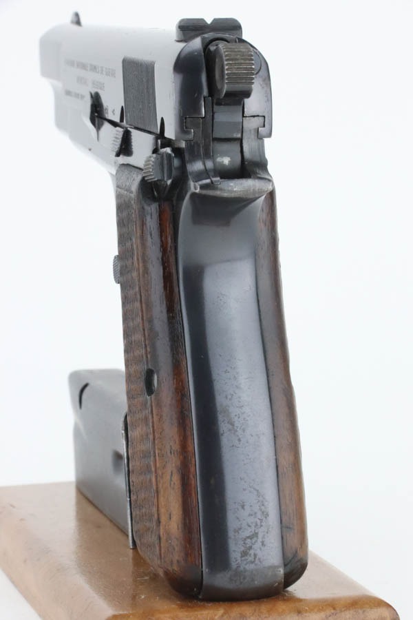 12/3/24 – This is an excellent example of a post-war Belgian FN Browning Hi Power. All matching with the proper Belgian proofs. It has retained about 96% of its original bluing. There is not much actual finish loss, but there is some light pin-pricking on the grip straps and a few small scratches and dings here and there. Fitted with nice wood grips – only minor bruising. Comes with one proper magazine. Mint bore.