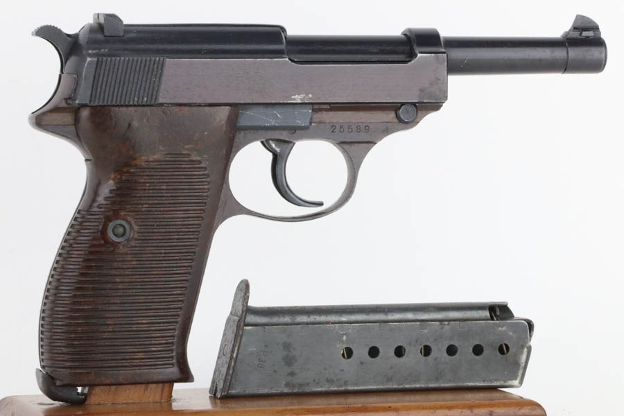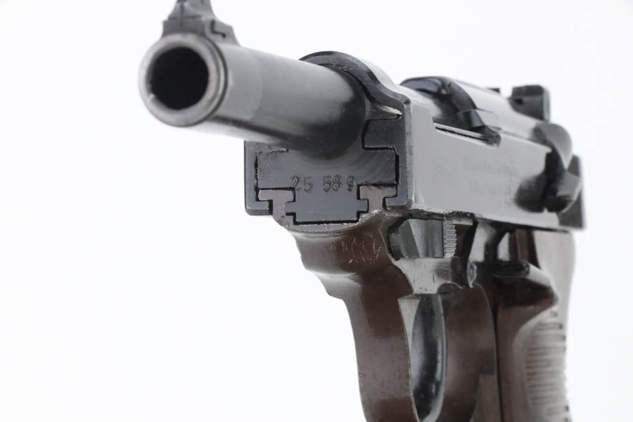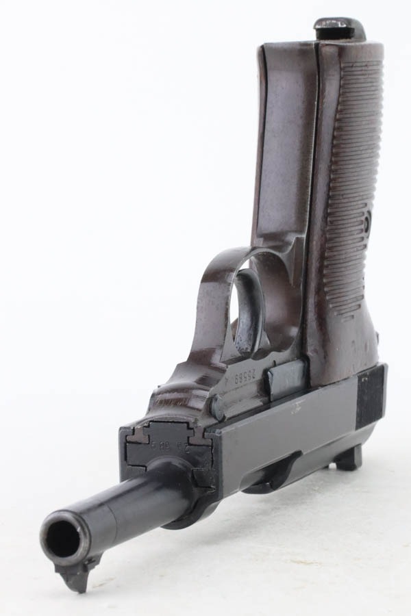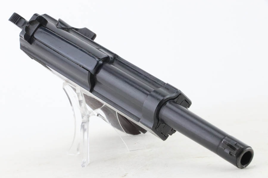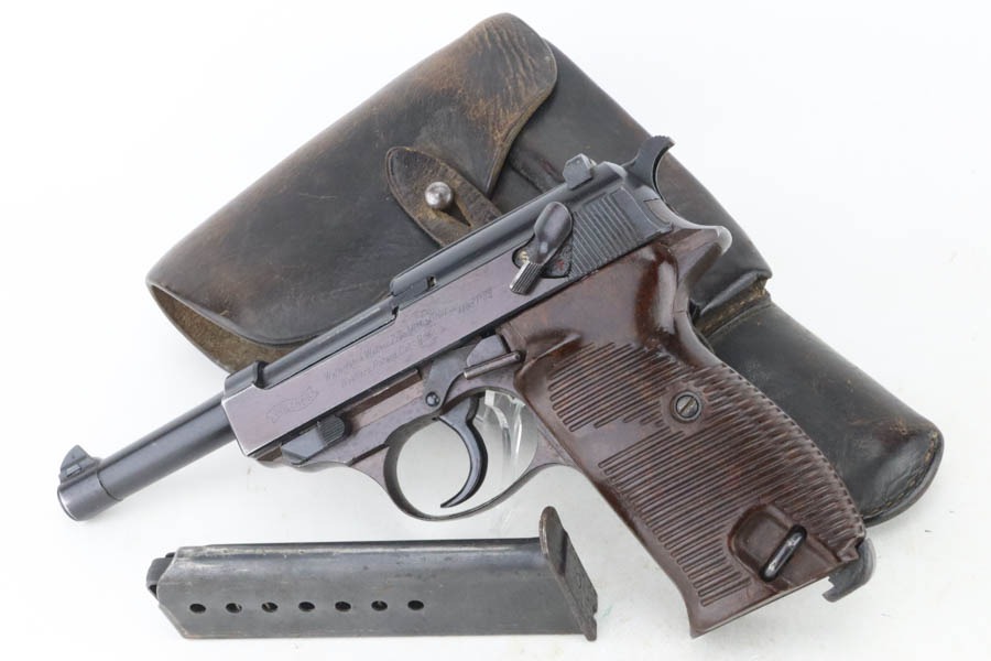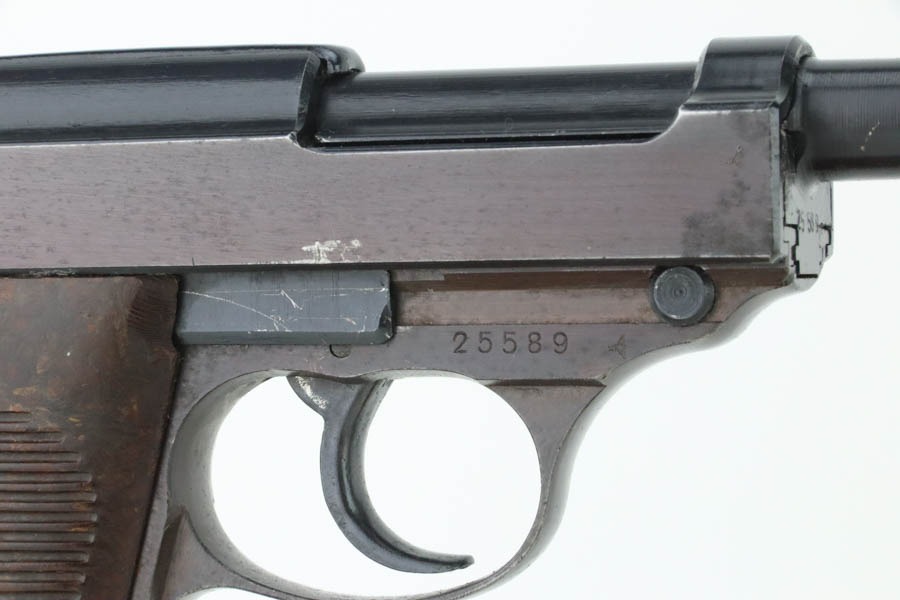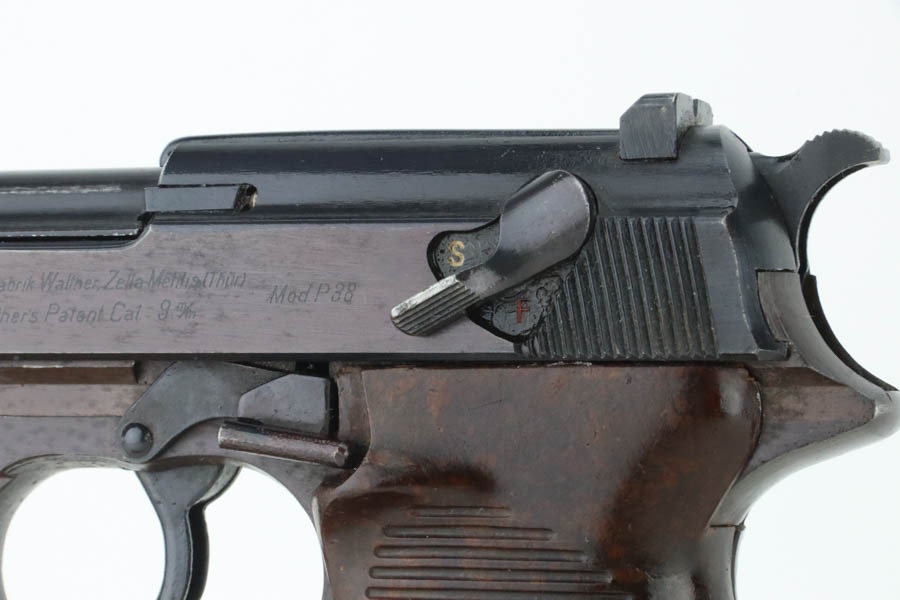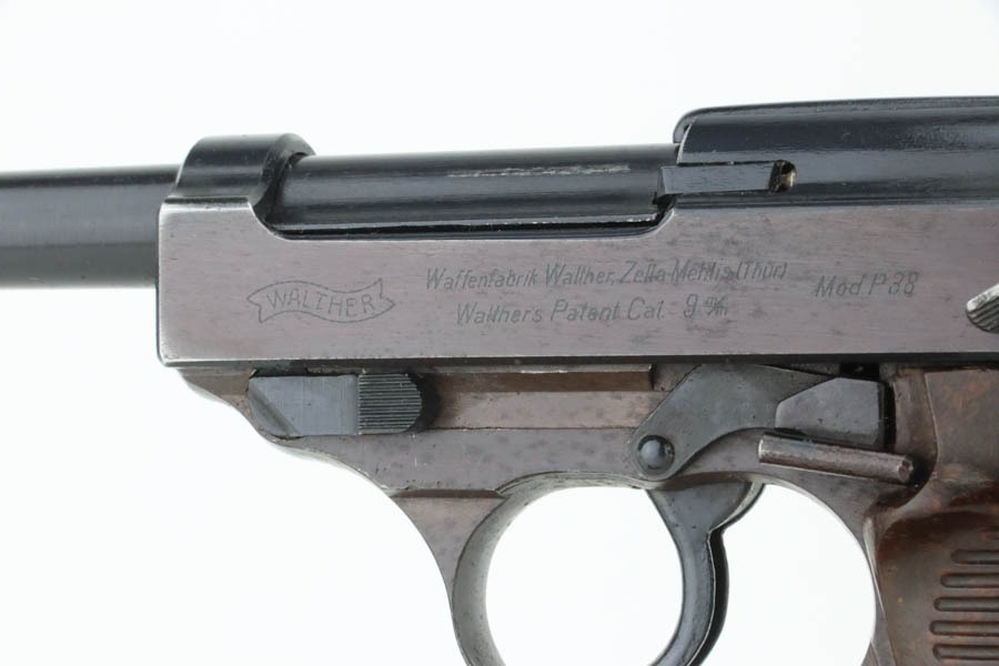 10/30/24 – This is an excellent example of a rare Walther Mod P.38 sold in the commercial market during WW2. This one is all matching and has the proper “Eagle N” proofs. This gun is rare as only 1,800 were produced. It comes as a rig with an “Eagle 359” marked military magazine and a what looks like a “Waffen 182” marked FN High Power holster (fits the gun well). The gun also comes with the original capture document that lists this gun by serial number with a holster. The gun has retained about 96% of its original finish with very minor high edge and muzzle wear. While there is very little actual finish loss, there are some areas of light spotty oxidation here and there – most noticeable on the left side of the slide, at the front right of the slide, and on the front strap. The bluing has a really nice plum-colored tint to it. Fitted with excellent reddish bakelite grips. Mint bore. De-cocker is functional.