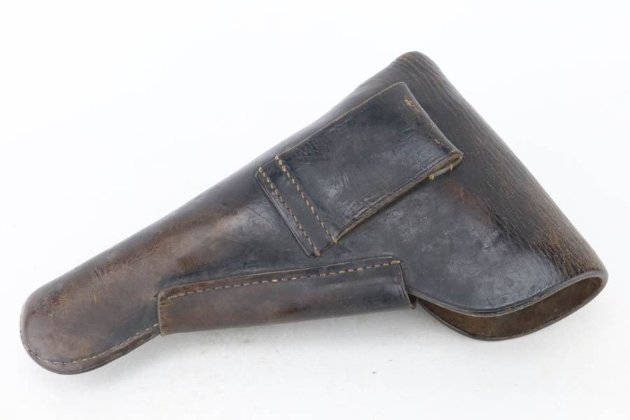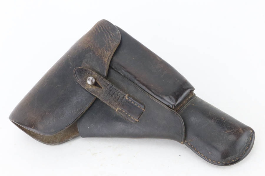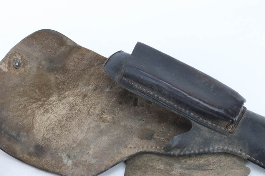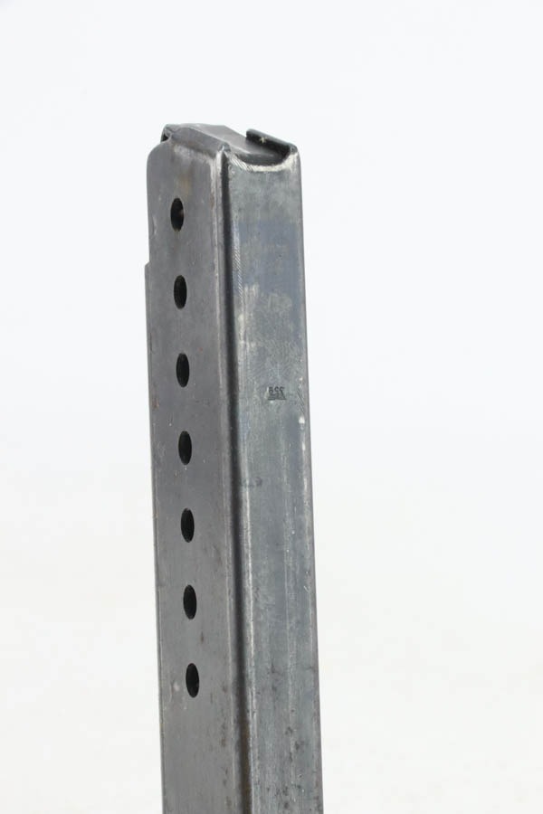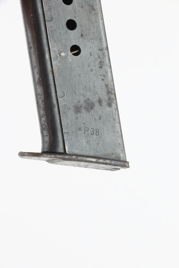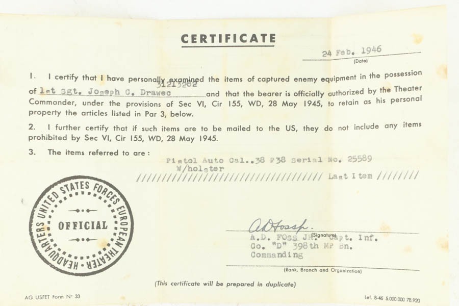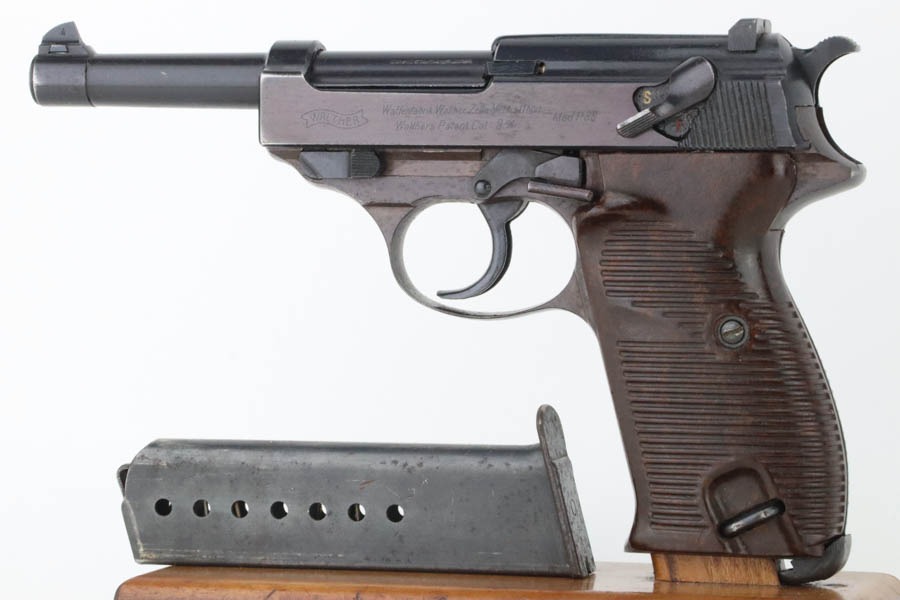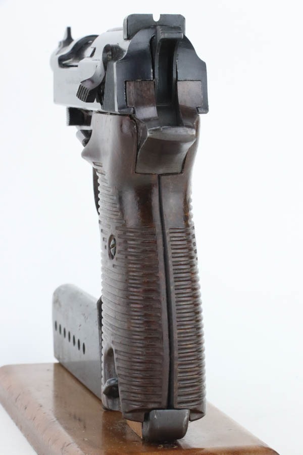 10/30/24 – This is an excellent example of a rare Walther Mod P.38 sold in the commercial market during WW2. This one is all matching and has the proper “Eagle N” proofs. This gun is rare as only 1,800 were produced. It comes as a rig with an “Eagle 359” marked military magazine and a what looks like a “Waffen 182” marked FN High Power holster (fits the gun well). The gun also comes with the original capture document that lists this gun by serial number with a holster. The gun has retained about 96% of its original finish with very minor high edge and muzzle wear. While there is very little actual finish loss, there are some areas of light spotty oxidation here and there – most noticeable on the left side of the slide, at the front right of the slide, and on the front strap. The bluing has a really nice plum-colored tint to it. Fitted with excellent reddish bakelite grips. Mint bore. De-cocker is functional.