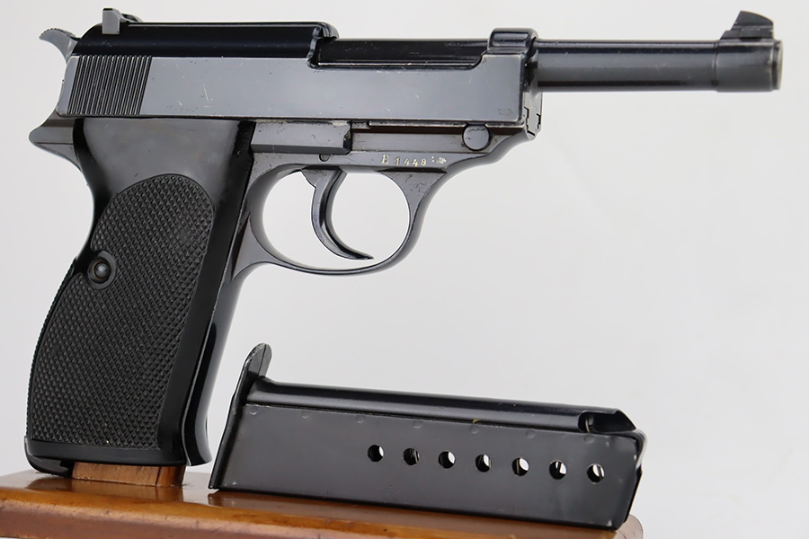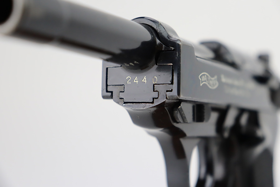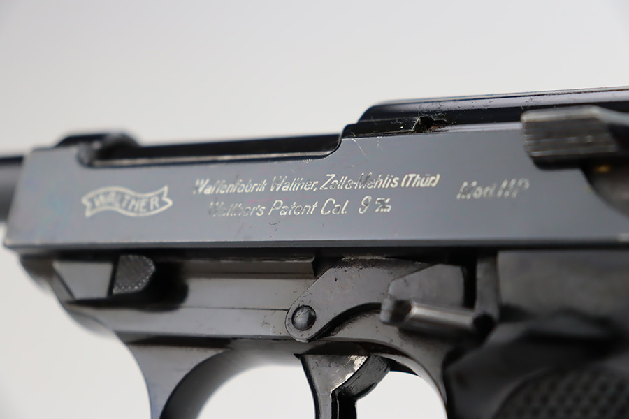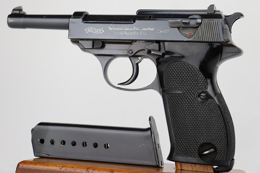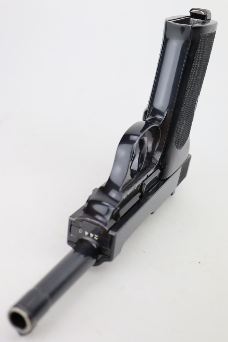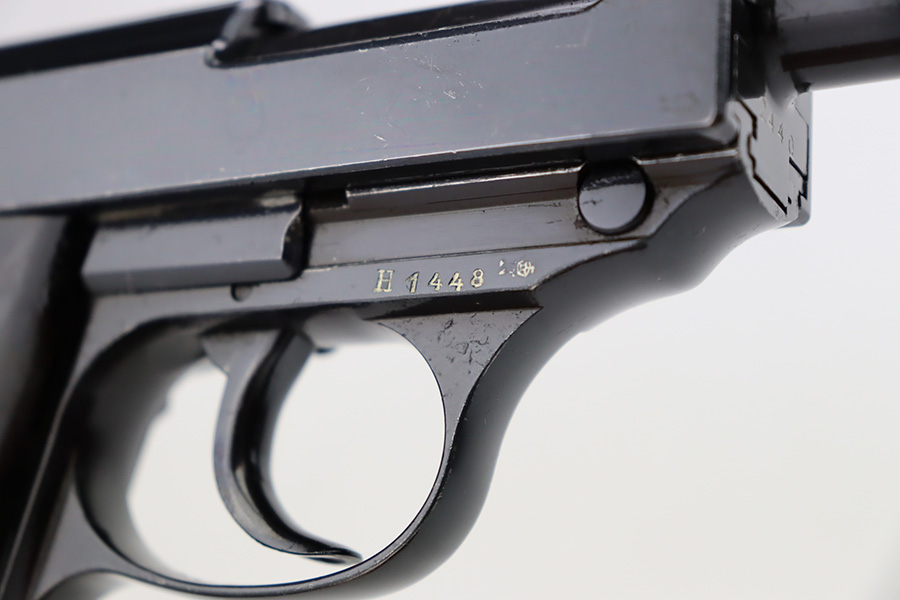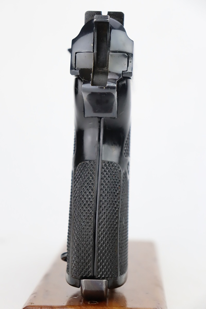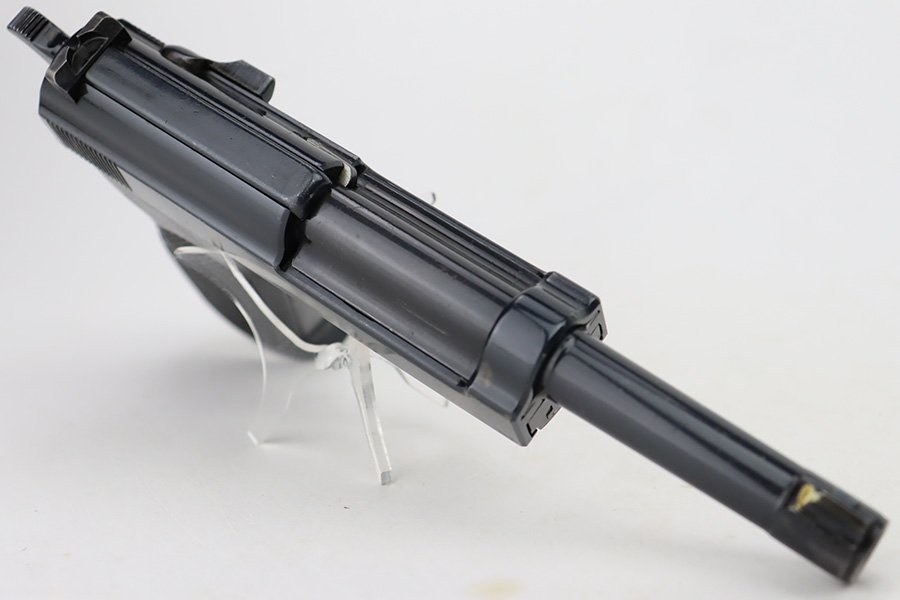 10/18/23 – This is an excellent example of a rare Walther Mod HP delivered to Sweden in about 1939. This one is part of the first contract, one of only about 1,000. It has the proper features, such as a square firing pin and an “H” serial prefix. Unfortunately, it is mismatched. It has retained about 96-97% of its original finish with very minor wear around the muzzle and on the high edges of the slide. Some light scratches along both sides of the slide. Fitted with proper checkered black bakelite grips and comes with an “Eagle 88” marked Spreewerk magazine. Very nice bore with strong rifling and just hints of pin-pricking in the grooves. De-cocker is functional.