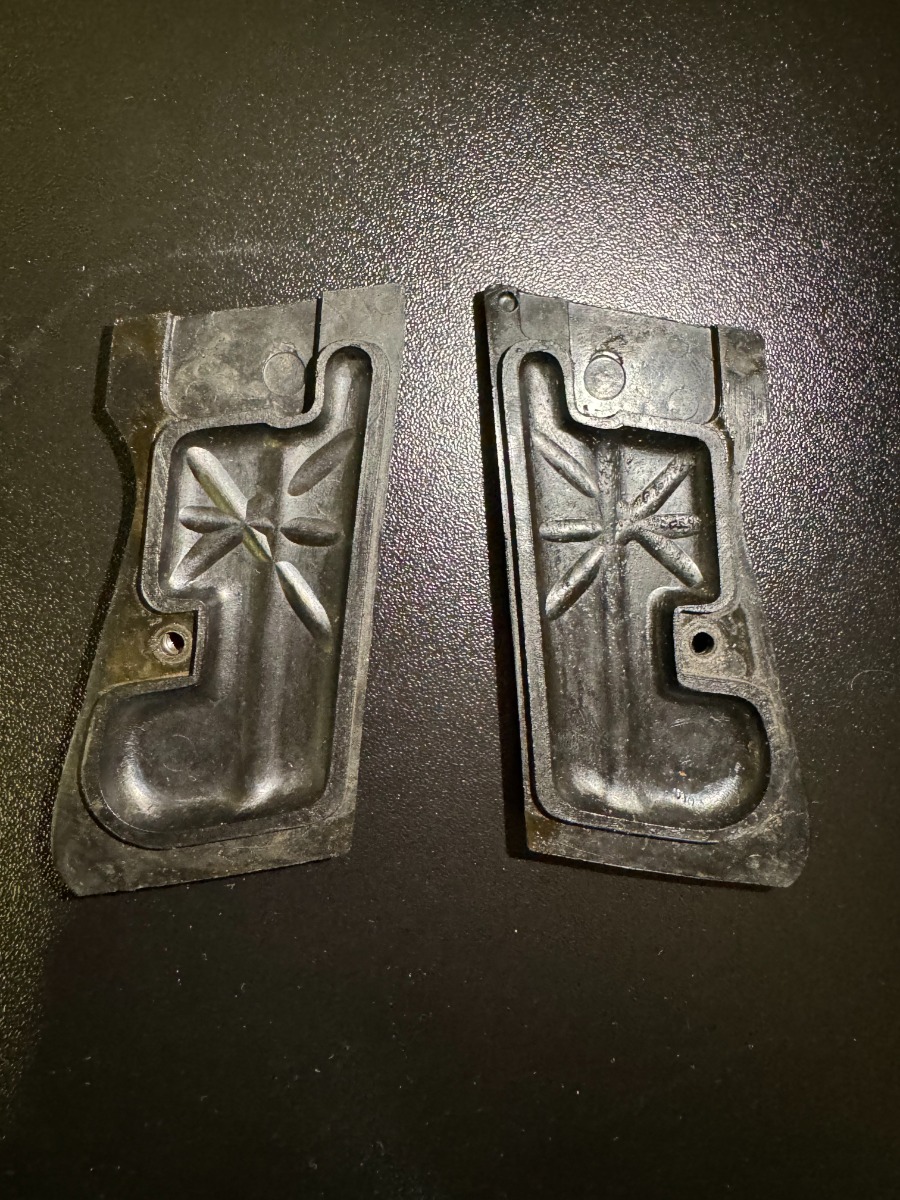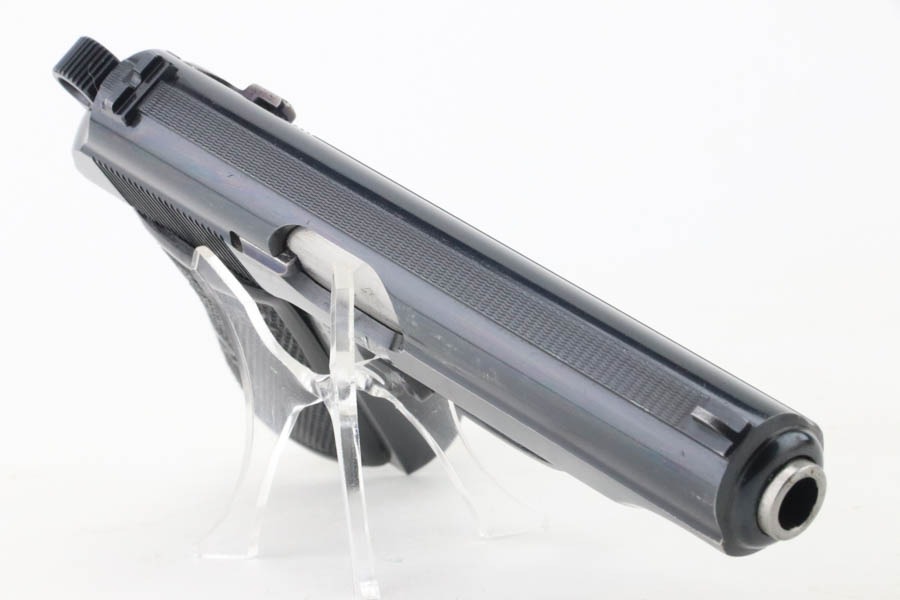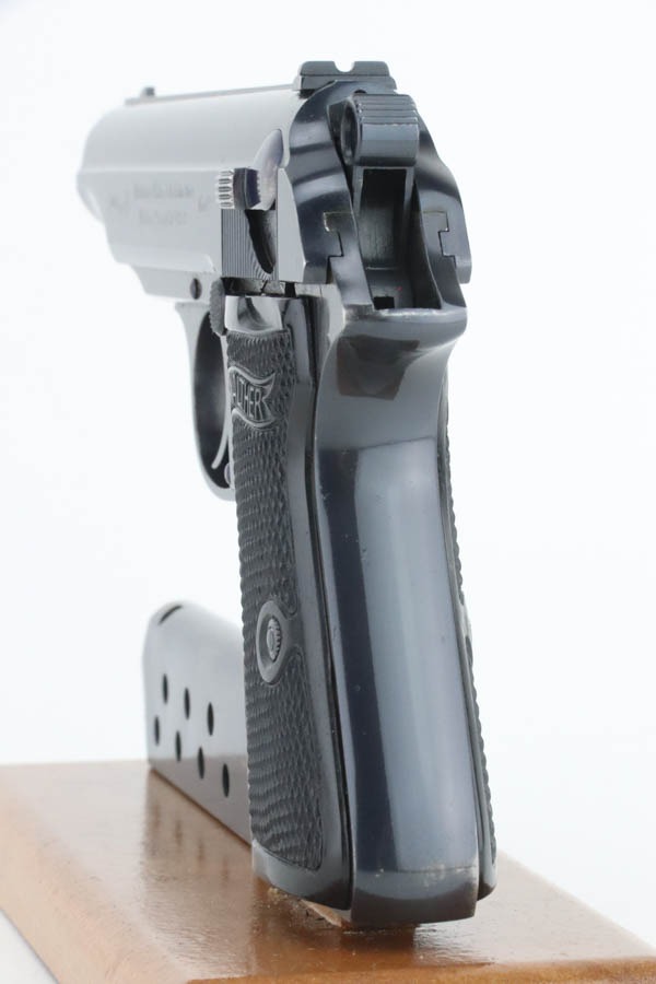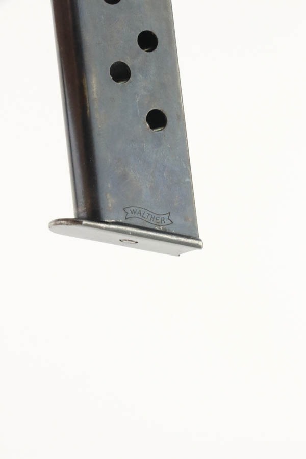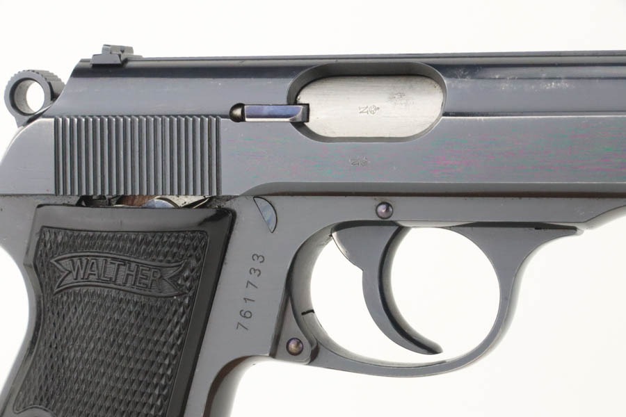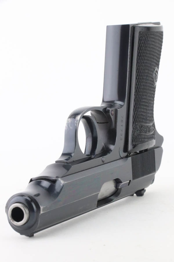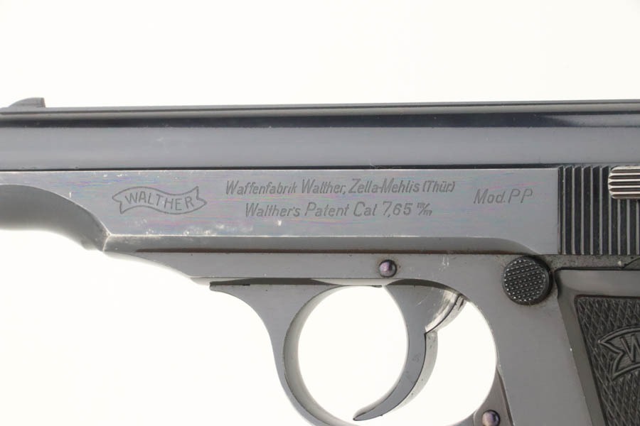 10/3/24 – This is an excellent example of an early Walther PP manufactured in 1931. It is all matching and has the proper “Crown N” proofs. It has correct early features, such as the heavy hammer, 90 degree safety, extended barrel, and “upside down” serial number. The gun has retained about 96-97% of its original high polish finish. While there is very little actual finish loss, there is some mild discoloration along the left side of the slide. Comes with a period-correct Walther banner-only magazine. Excellent, shiny bore. This particular gun is fitted with a scarce set of transitional “X back” grips that only appear in the 756xxx – 770xxx serial range. They are slightly different than the earlier “heavy X back” grips (see photo).