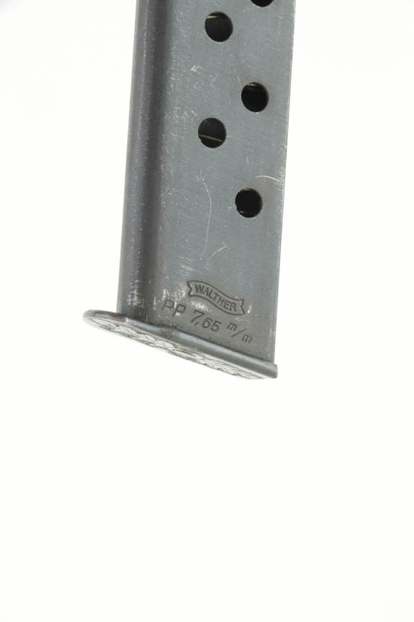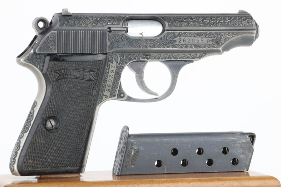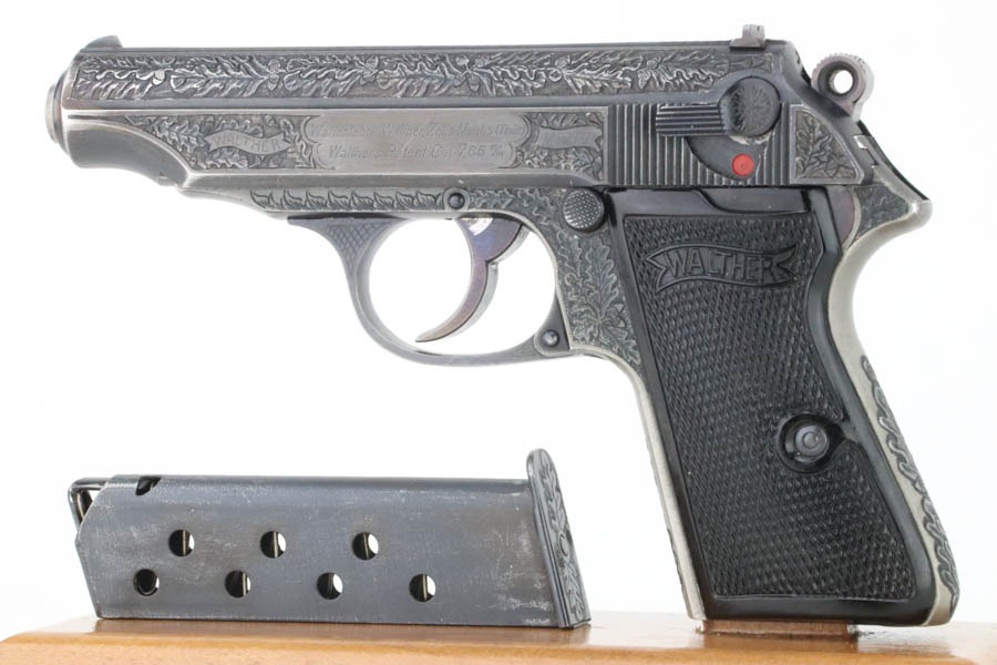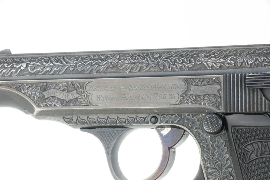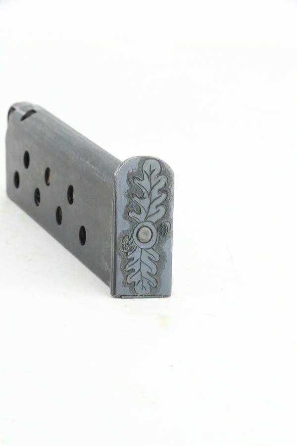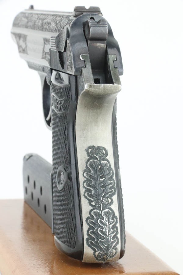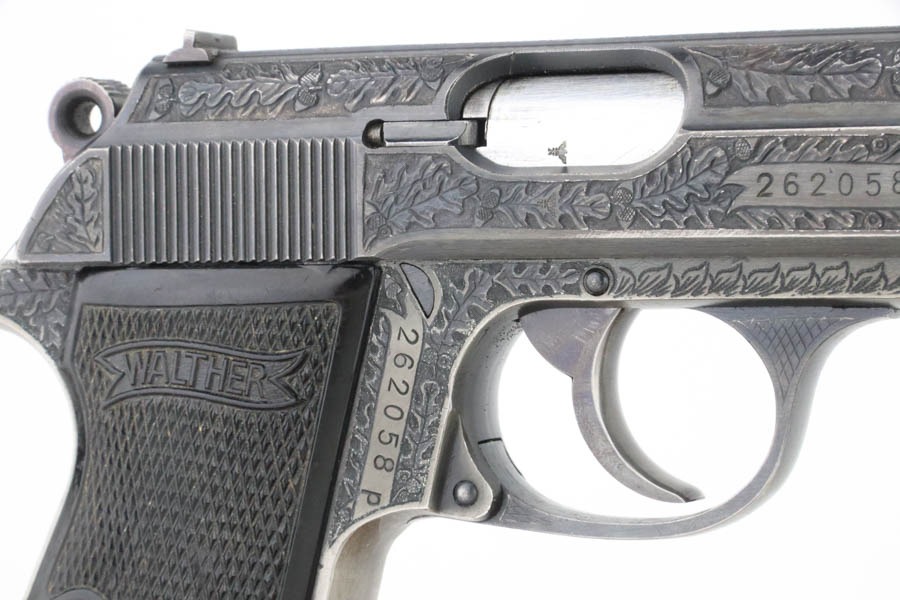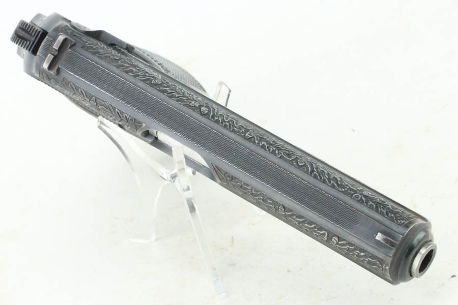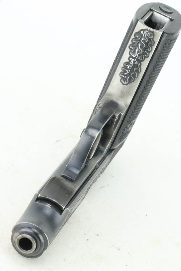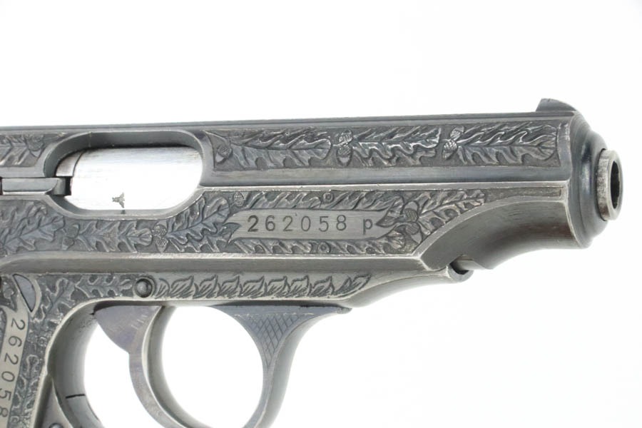 10/8/24 – This is an engraved Walther PP that was originally sold in the commercial market in 1942. All matching with a lightweight duraluminum frame. The entire gun features a German-style “oak leaf and acorn” engraving pattern. The quality of the engraving is nice, but it was done recently. It has retained roughly 70% of its finish with obvious finish loss on the grip straps. Fitted with nice period-correct black bakelite grips. Comes with a proper wartime magazine with an engraved base. Mint bore.