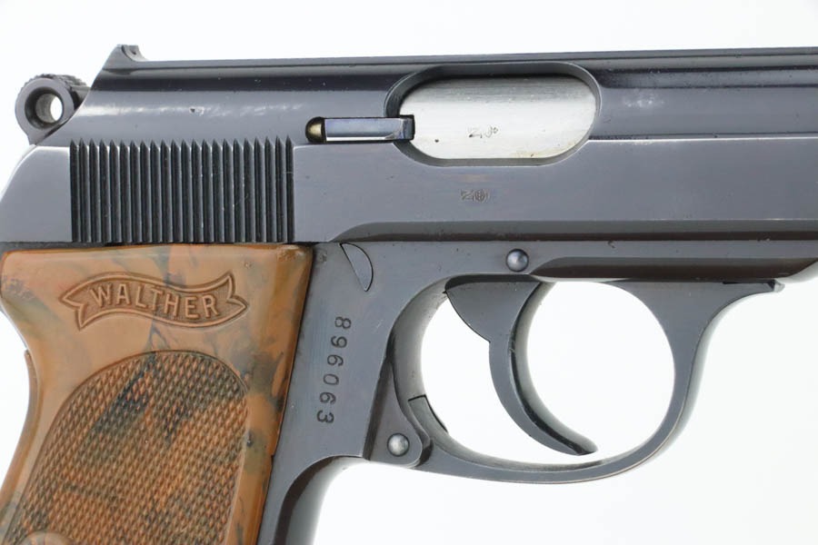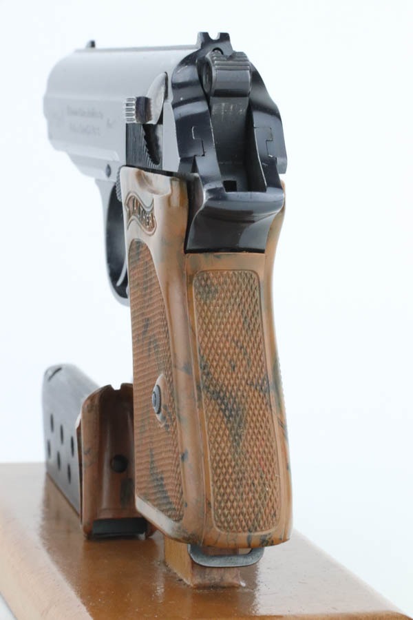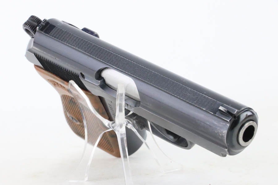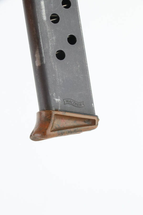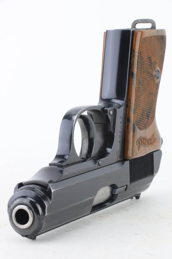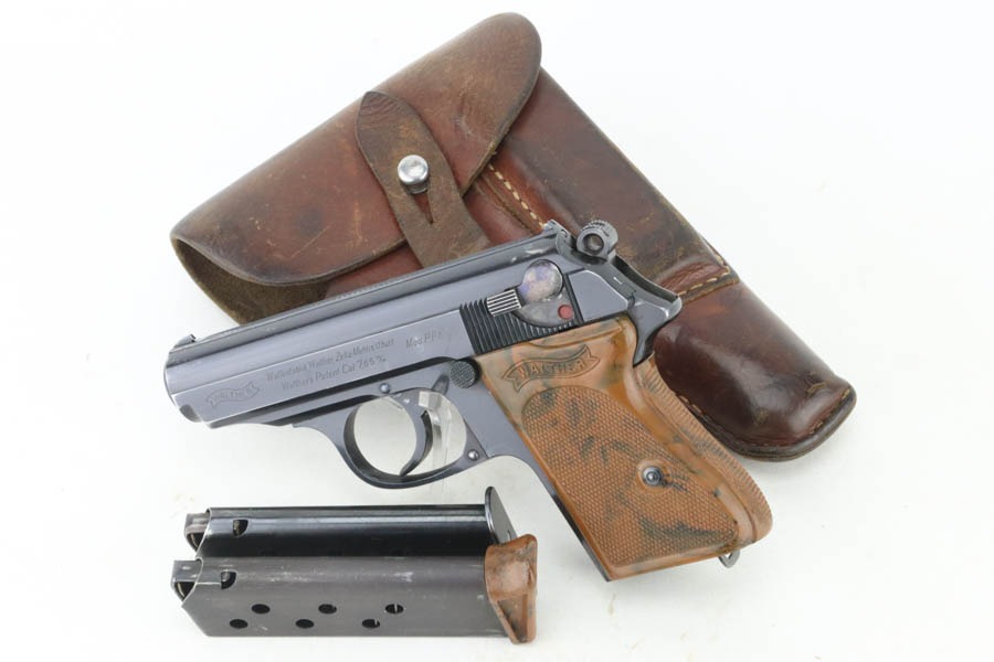 10/30/24 – This is an excellent example of a Walther PPK sold in the commercial market in 1935. All matching and “Crown N” proofed. It comes as a rig with a generic brown leather holster, one finger extension magazine (tiny chip in the finger extension bottom), and one flat bottom magazine. The gun has retained about 96% of its original high polish finish. There is just very minor muzzle wear and a minor wear at the back right side of the slide. Excellent brown grip. Minty bore.