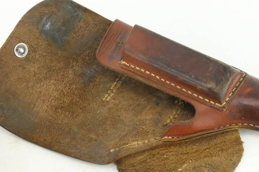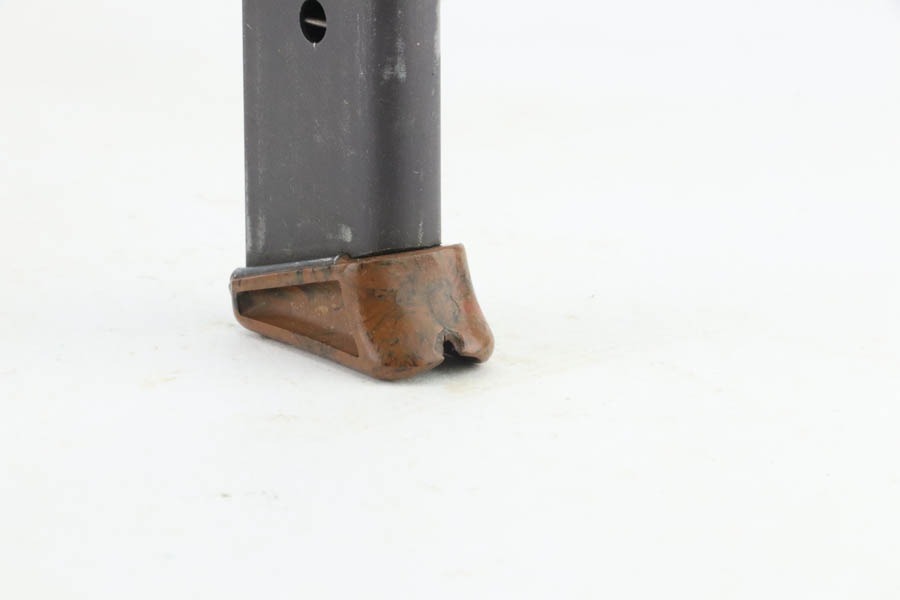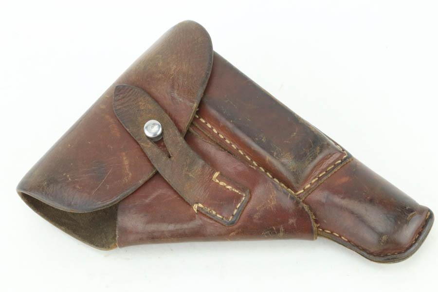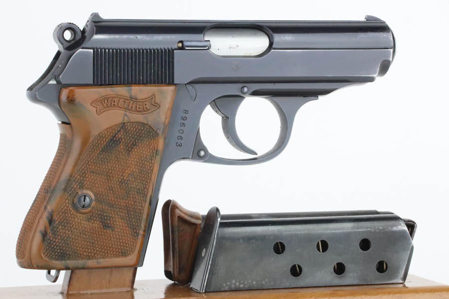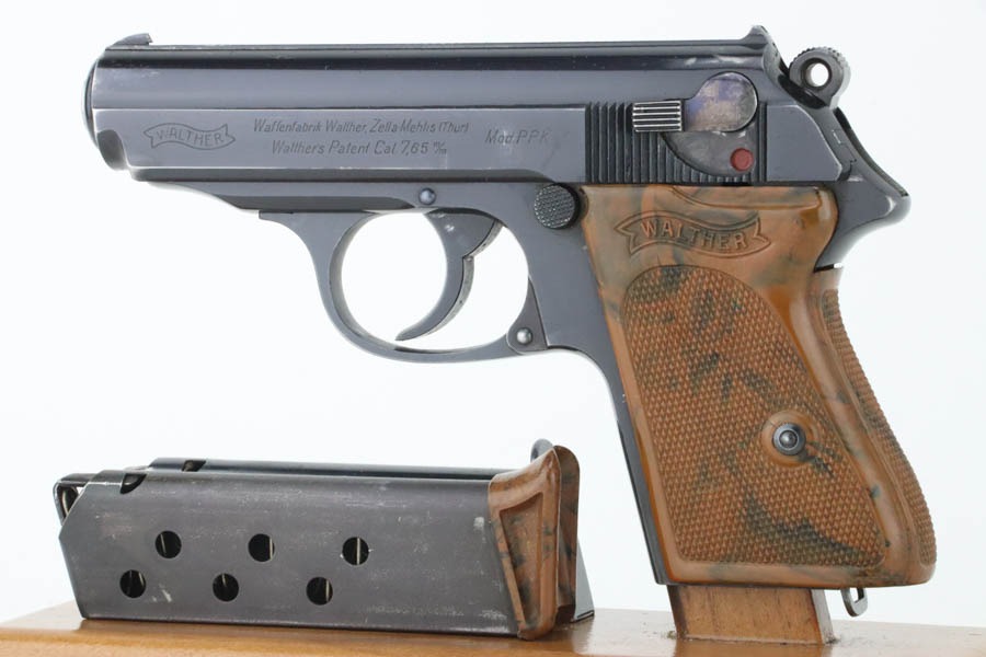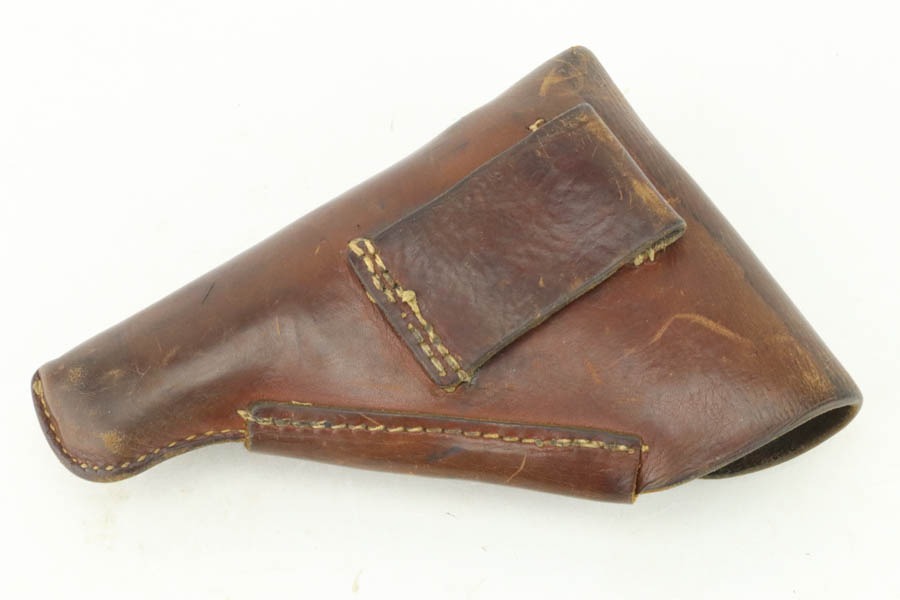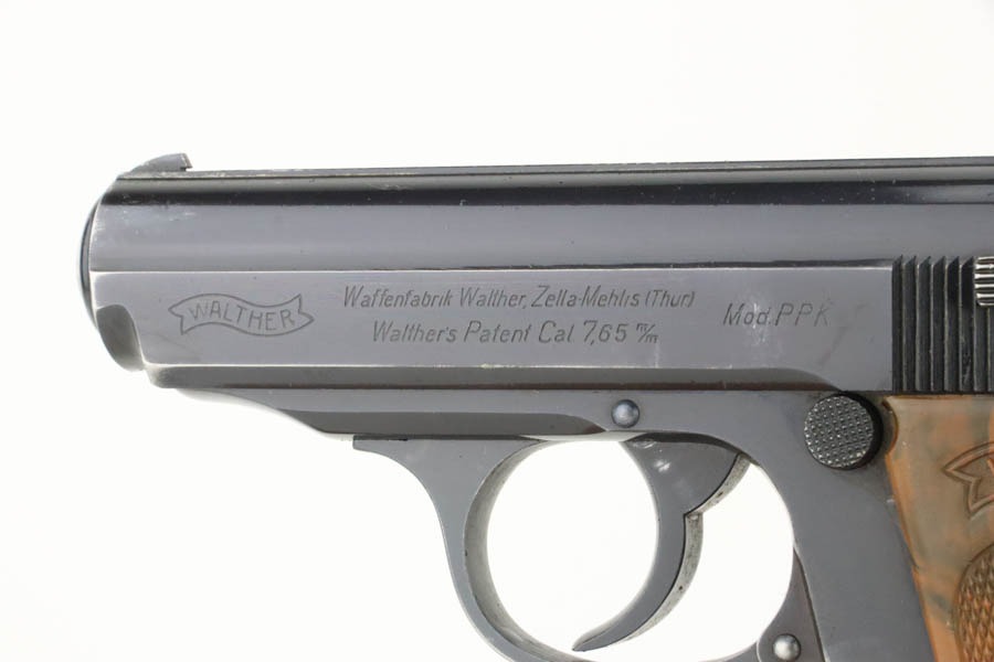 10/30/24 – This is an excellent example of a Walther PPK sold in the commercial market in 1935. All matching and “Crown N” proofed. It comes as a rig with a generic brown leather holster, one finger extension magazine (tiny chip in the finger extension bottom), and one flat bottom magazine. The gun has retained about 96% of its original high polish finish. There is just very minor muzzle wear and a minor wear at the back right side of the slide. Excellent brown grip. Minty bore.