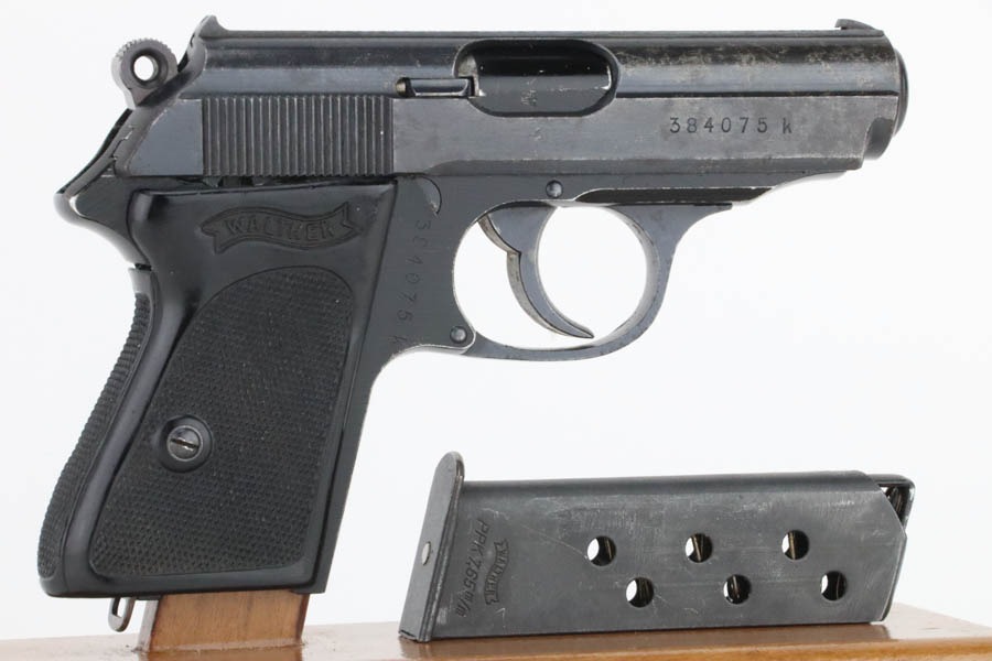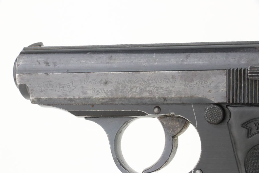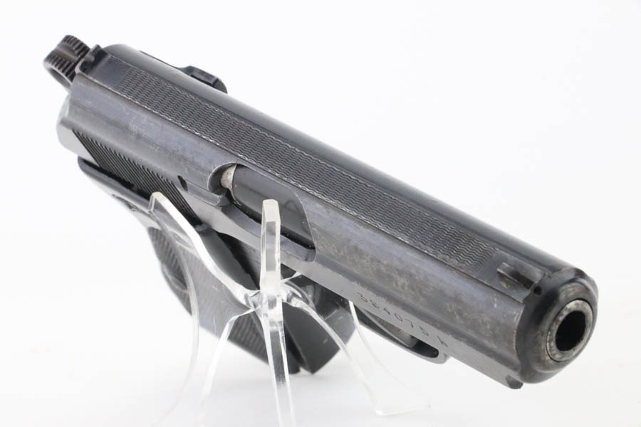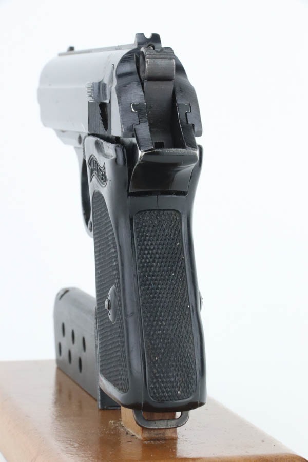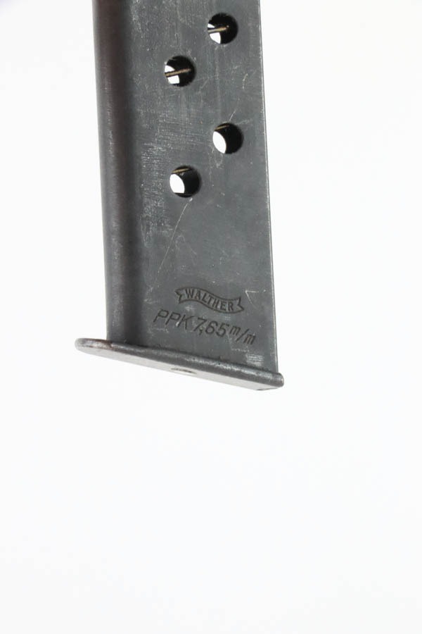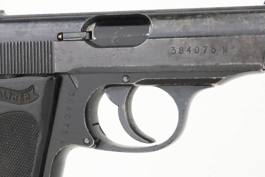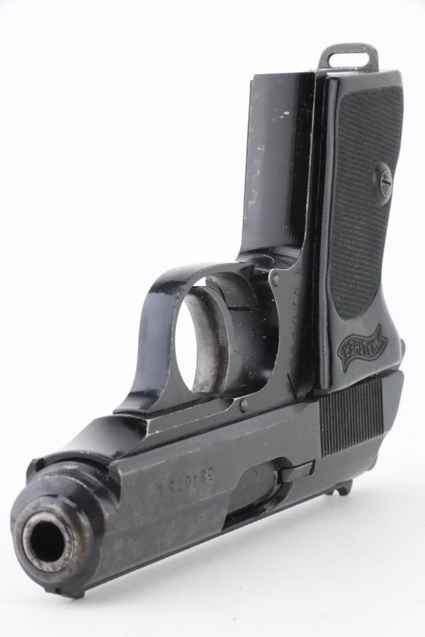 10/124 – This is a late-war Walther PPK from 1943. This one is especially desirable because it has a lightweight duraluminum frame and is fitted with an excellent late-war black bakelite grip (tiny hairline crack in the spine). It has retained roughly 85% of its original finish. There is spotty oxidation on the whole slide and obvious pitting along the right side of the slide. The black anodized finish on the frame is nice for the most part, but there are some handling marks on the front strap. Comes with a proper wartime magazine. Very nice bore.