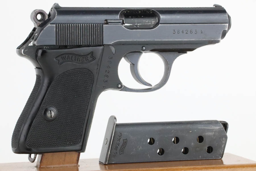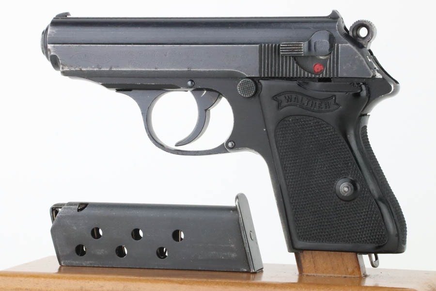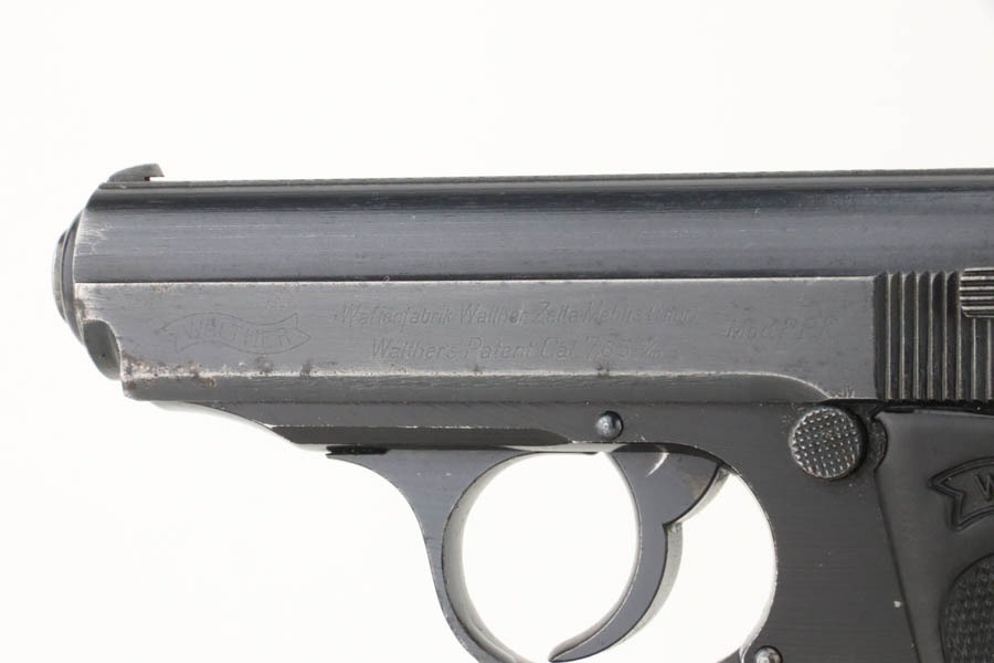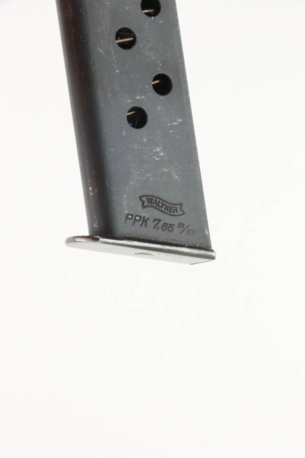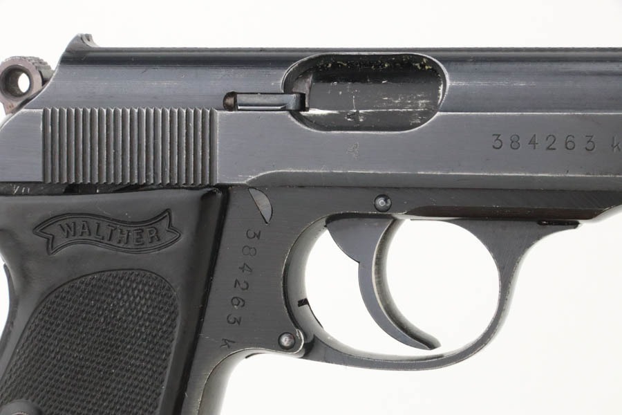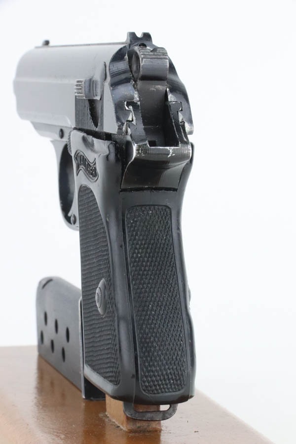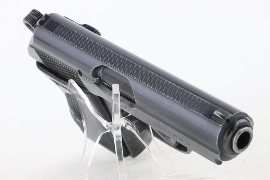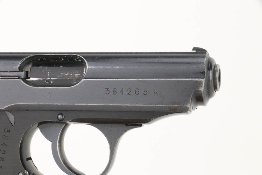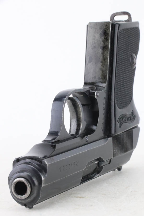 11/22/24 – This is a late-war Walther PPK from 1943. This one is especially desirable because it has a lightweight duraluminum frame and is fitted with an excellent late-war black bakelite grip. It has retained about 90% of its original finish. The majority of the wear is on the front strap where there is also some dots of discoloration. Minor high edge and muzzle wear. Comes with a proper wartime magazine. The bore has great rifling in general, but there are some noticeable pits here and there.