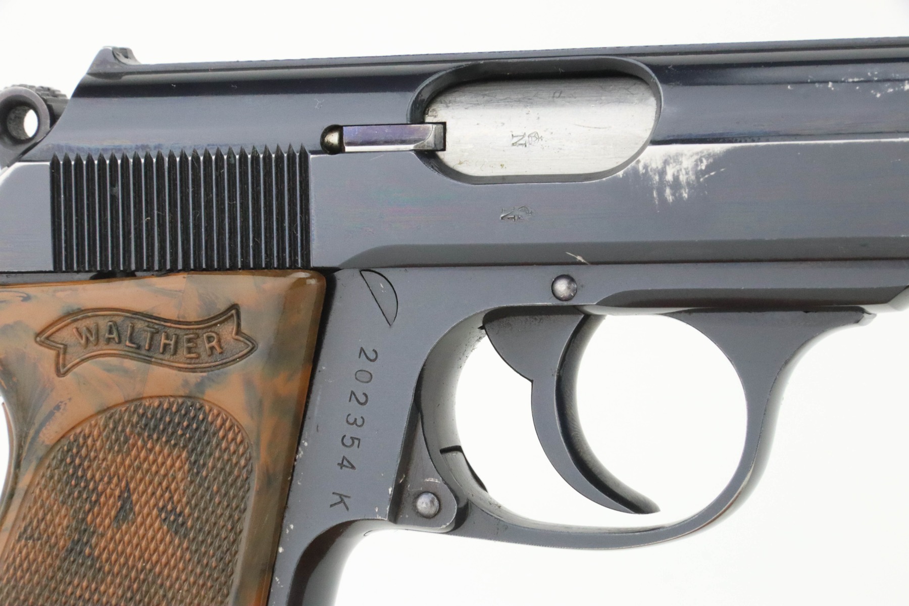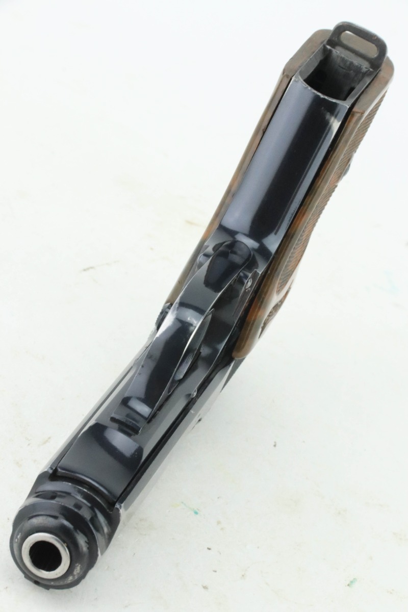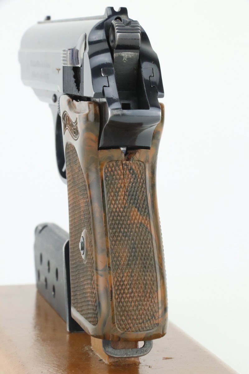 9/9/24 – This is a nice example of a Pre-WW2 Commercial Walther PPK from 1938. It is all matching and “Crown N” proofed. It has retained about 93% of its original high polish bluing. The majority of the wear is toward the muzzle end of the slide. Fitted with a nice period-correct grip (small chip in the spine) and comes with a later wartime magazine. Minty bore.