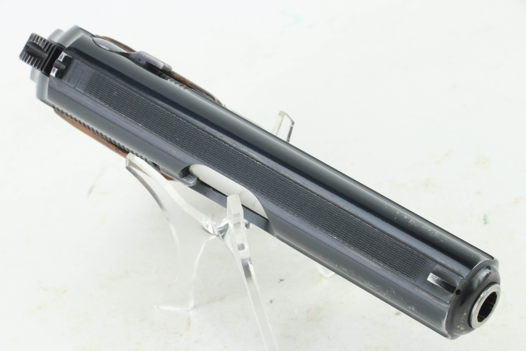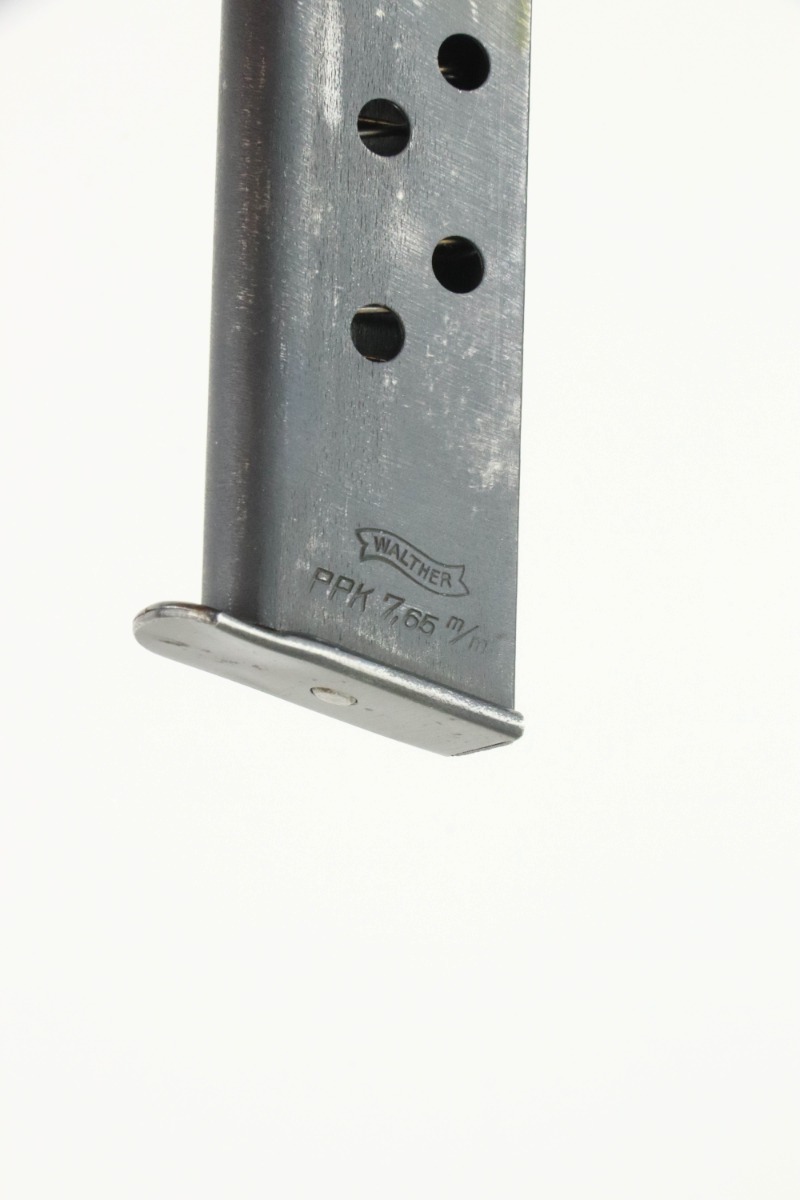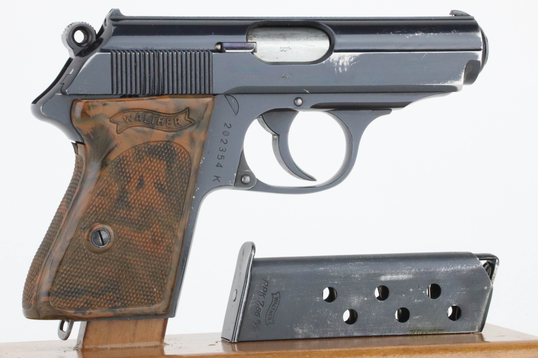 9/9/24 – This is a nice example of a Pre-WW2 Commercial Walther PPK from 1938. It is all matching and “Crown N” proofed. It has retained about 93% of its original high polish bluing. The majority of the wear is toward the muzzle end of the slide. Fitted with a nice period-correct grip (small chip in the spine) and comes with a later wartime magazine. Minty bore.