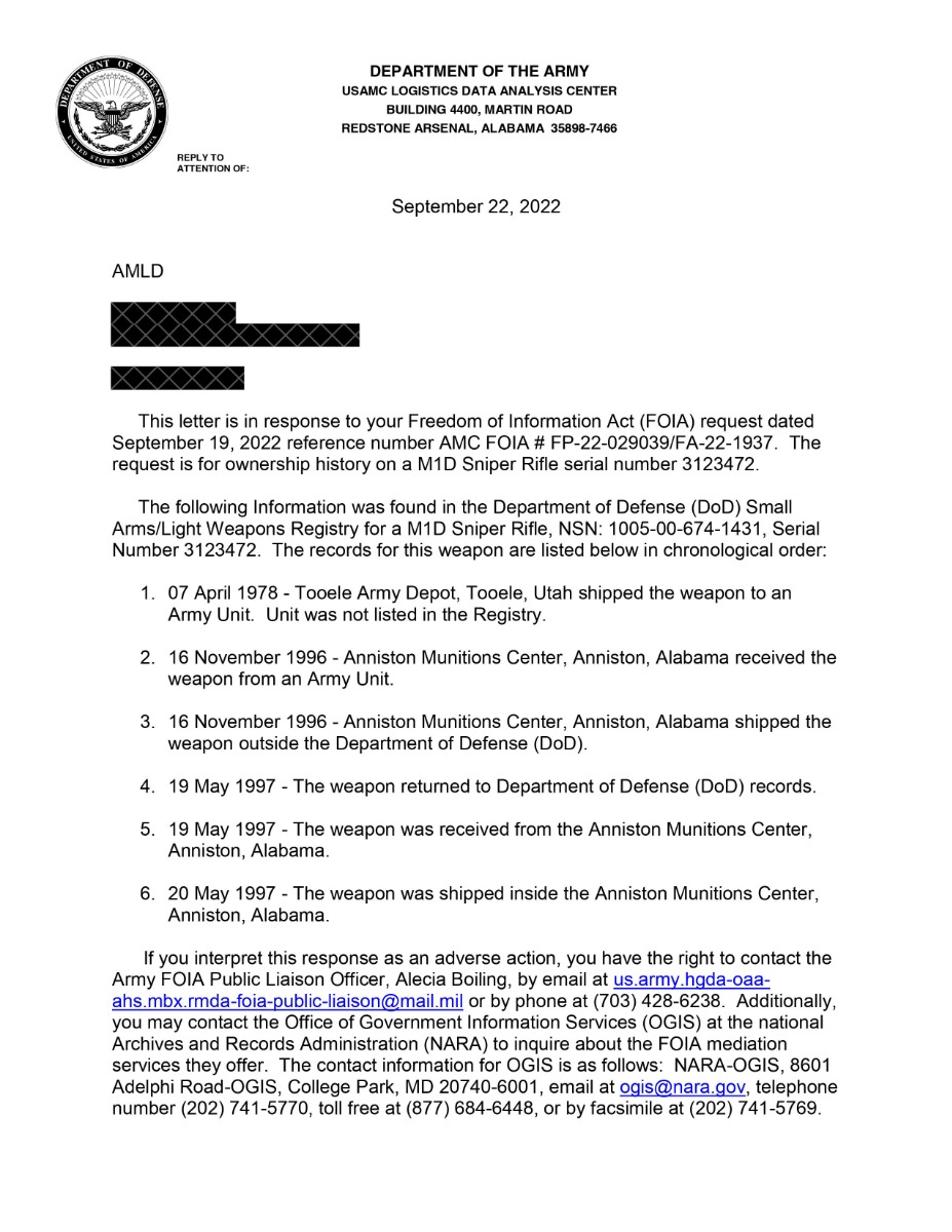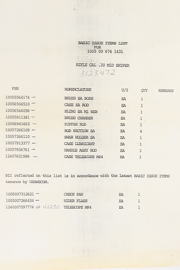 5/28/24 – Here is an absolutely gorgeous and documented DCM Lottery US Springfield M1D sniper rifle with M84 scope, mount, sun shade, cone flash hider, MRT 3-69 stamped leather cheek piece, sling, original basic issue cleaning accessories, AND verification of the sale in 1996. It also has a FOIA document stating it went to Tooele Army Depot in the 1970s. The receiver leg is also marked “TE-XX”. Comes in the shipping box with plastic storage wrap numbered to the rifle. Excellent September of 1944 serial numbered Springfield receiver with 5-51 SA barrel with mint bore. ME is a 2, TE is a 1. The rifle looks about new as re-arsenaled with just some light storage marks. The rifle and scope are excellent inside and out. All the accessories otherwise are still sealed in their packaging. The M1Ds were all made from existing stocks of M1 rifles, utilizing new SA barrels (usually 1951/52 dated) with a mix of other parts. They all typically show some stock evidence of rebuild as this one does. SA cartouche on left side. Two Circle P Proofs on the stock wrist. SA marked bolt, barrel, receiver, trigger guard assembly, and stock. The US M84 scope has crisp clear optics and has excellent blue finish. Scope adjusts properly. We doubt this M1D was ever issued. This one appears to have seen no service use after completing M1D program rebuild. Rifle, M84 scope, US Government paperwork, shipping box, accessories shipped with the rifle and all are tied together through documented part/serial numbers on the DCM purchase & shipping paperwork/box.