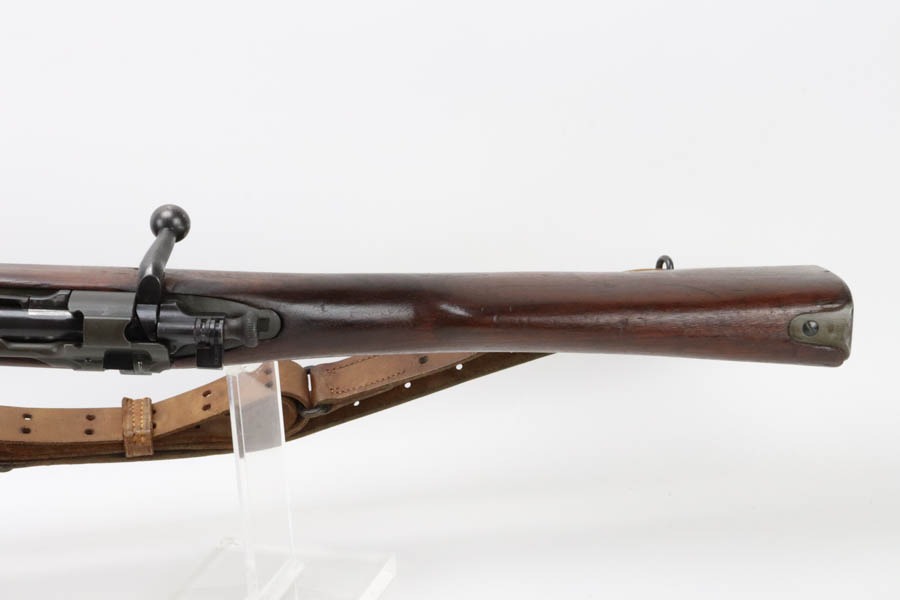 This rifle is in great condition with minor wear to note. The metal retains a nice parkerized finish with minor edge wear. The stock is in great condition with some small dings and nicks from handling but there are no cracks or breaks. The bore is bright with great rifling and the muzzle erosion rates a 1. The rifle is void of any typical British proof marks which is correct for these rifles. The stock has a red band painted on the stock to note that it shoots .30-06 and was not to be confused with loading .303 Ammo. The rifle comes with a letter from the Nephew of Lt. Col. Levin, the one who inherited these rifles, as a letter of provenance on this rifle. An issue of the NRA magazine is also included that explains the story of these rifles along side original photos of when the crate for this rifle was opened.