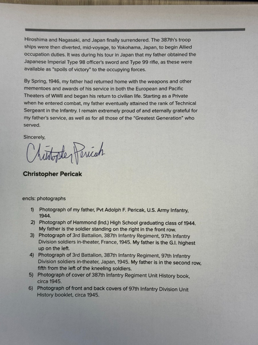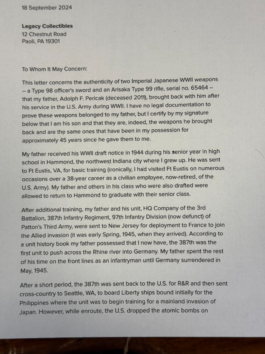10/17/24 – This set comes to us from the son of the vet that brought it back from Japan. Technical Sergeant Adolph F. Pericak served in the 3rd Battalion, 387th Infantry Regiment, 97th Infantry Division of Patton’s Third Army. His unit was the first to push across the Rhine into Germany, and he spent the rest of his time in Germany on the front lines as an infantryman. After Germany surrendered, the 387th was sent to Japan to begin occupation duties. The listing includes a signed letter from his son, detailing what he knew of his father’s military service and the history on the two items offered here. The rifle offered here is a Type 99 with matching numbers throughout. The mum has been ground and there is some notable surface rust on the underside. Unfortunately, the bore is very worn and has a deep ring of pitting inside. The real prize here is the Katana, which is a Type 98 ShinGunto. It is a handmade blade from the late 19th century. The blade has been lightly polished but good grain remains visible. The scabbard is original but shows visible wear. The blade is in good condition aside from minor damage near the tip.
