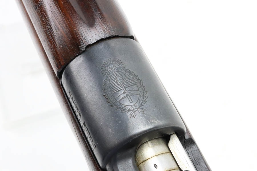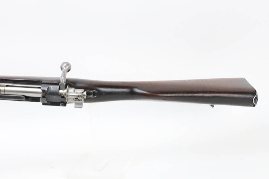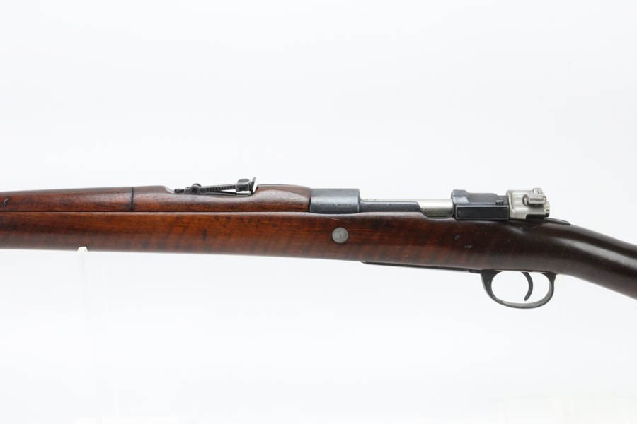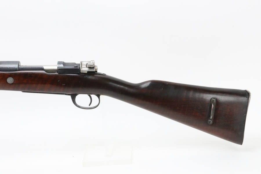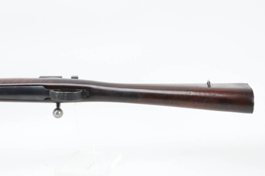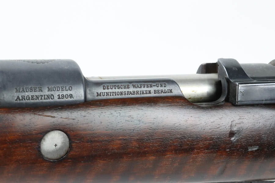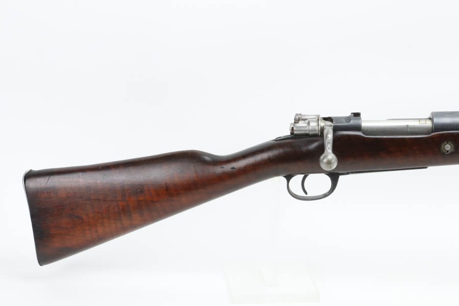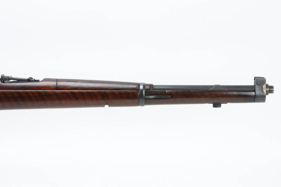 12/2/24 – For sale is an Argentine Model 1909 Mauser Engineer Carbine made in 1910. The carbine is in great shape overall with a nice tiger stripe pattern visible on the stock. The metal retains a nice dulled blued finish with minor wear and spots of finish loss. The stock is in great condition but has been sanded and has minor handling marks and dings on the finish. The serial number isn’t legible on the stock but the bolt, receiver, and trigger guard are matching. The nose cap has markings of braze welding as a bushing was installed for the use of a bayonet. The bore is on the darker side but with good rifling.