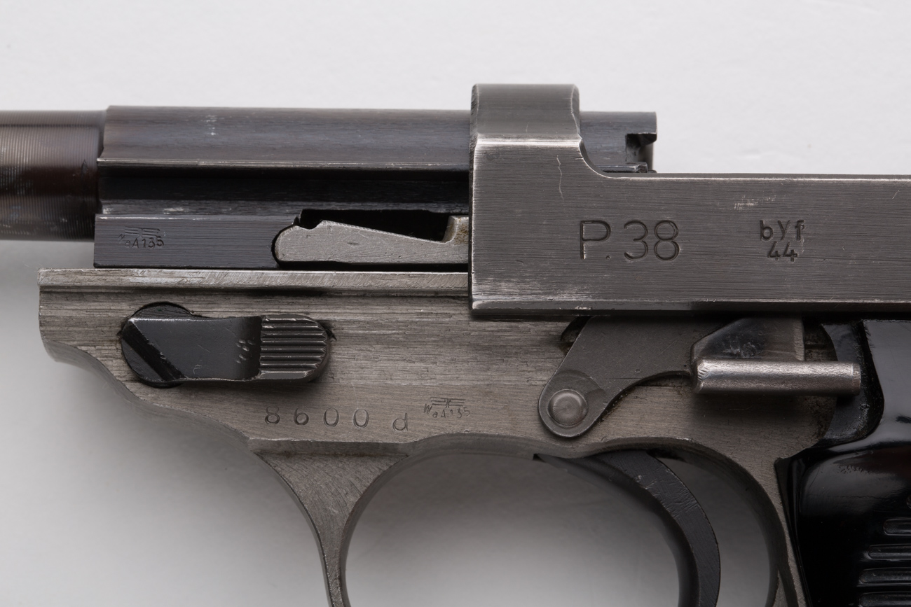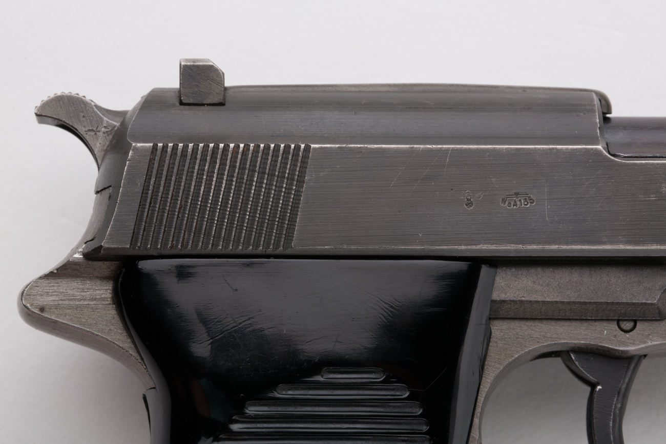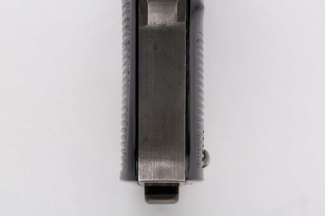12/3/18 – This is a nice dual-tone Mauser P.38 from 1944. It is all matching and correct with about 95% finish remaining. There’s edge wear to the slide and muzzle but very little to the frame. Some blued small parts, some phosphate. Interesting feature to this one is that it only has two slide proofs, missing one WaA135 proof. Probably wasn’t put together until the end of the war. Minty grips and bore.