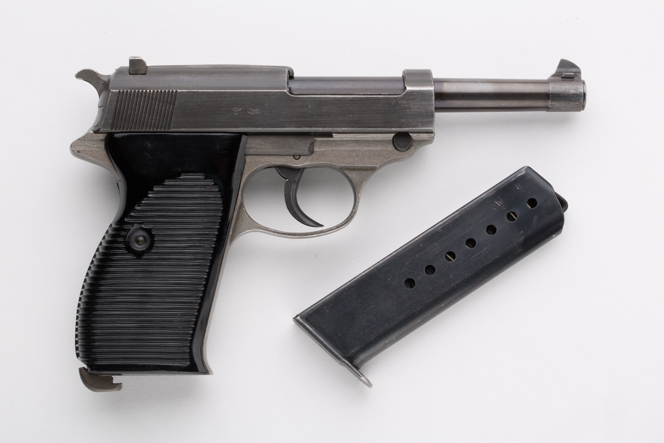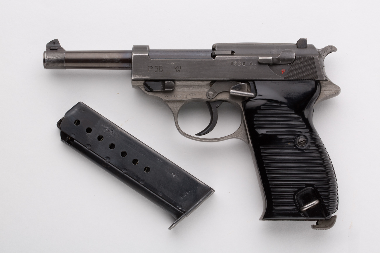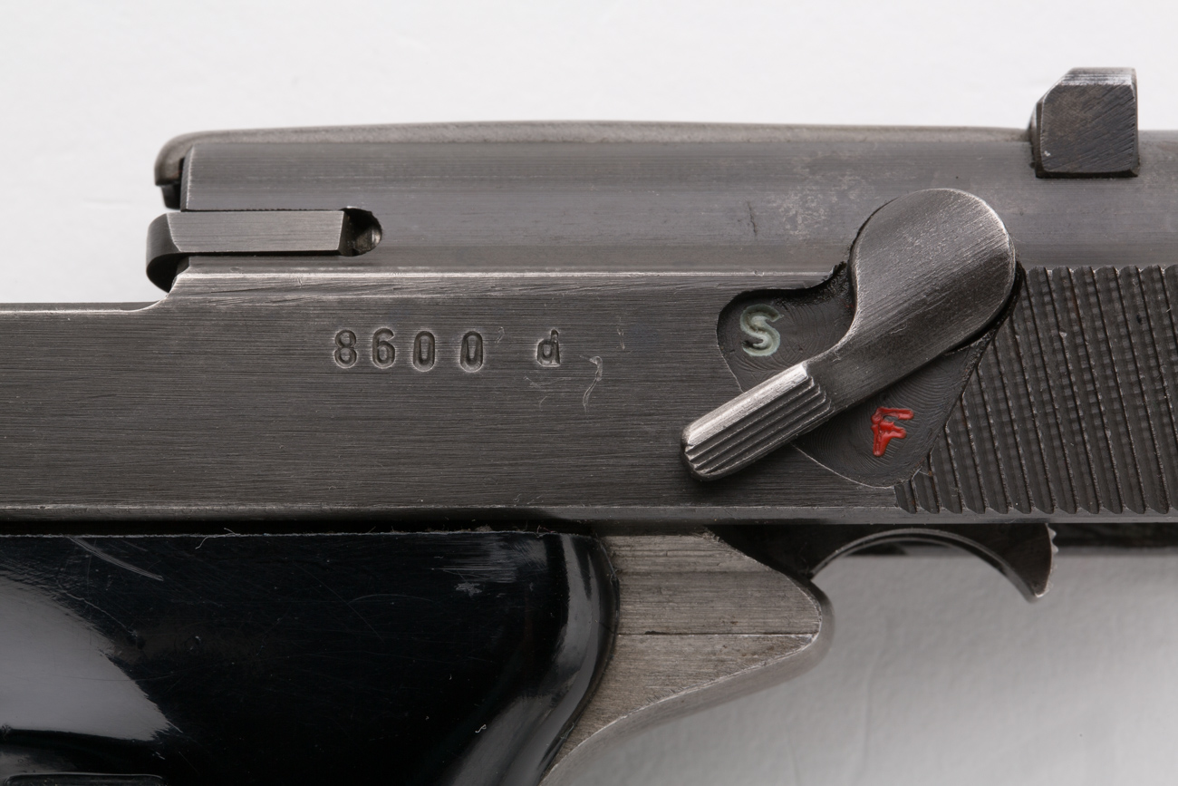 12/3/18 – This is a nice dual-tone Mauser P.38 from 1944. It is all matching and correct with about 95% finish remaining. There’s edge wear to the slide and muzzle but very little to the frame. Some blued small parts, some phosphate. Interesting feature to this one is that it only has two slide proofs, missing one WaA135 proof. Probably wasn’t put together until the end of the war. Minty grips and bore.