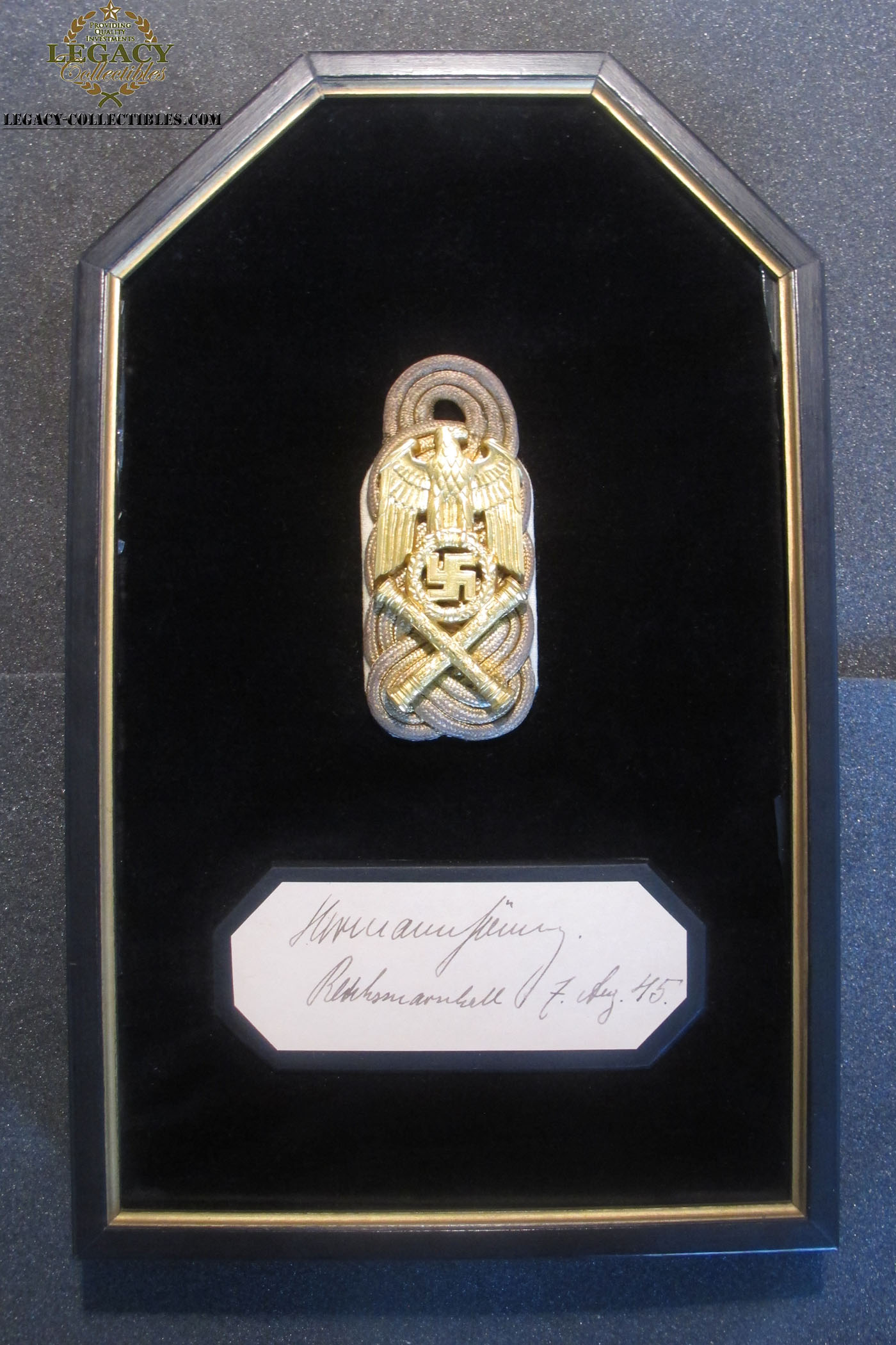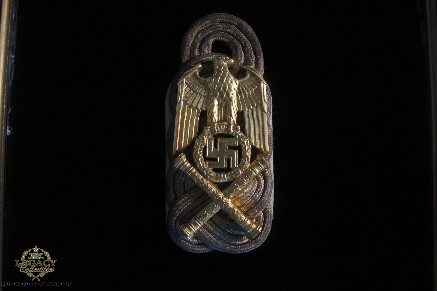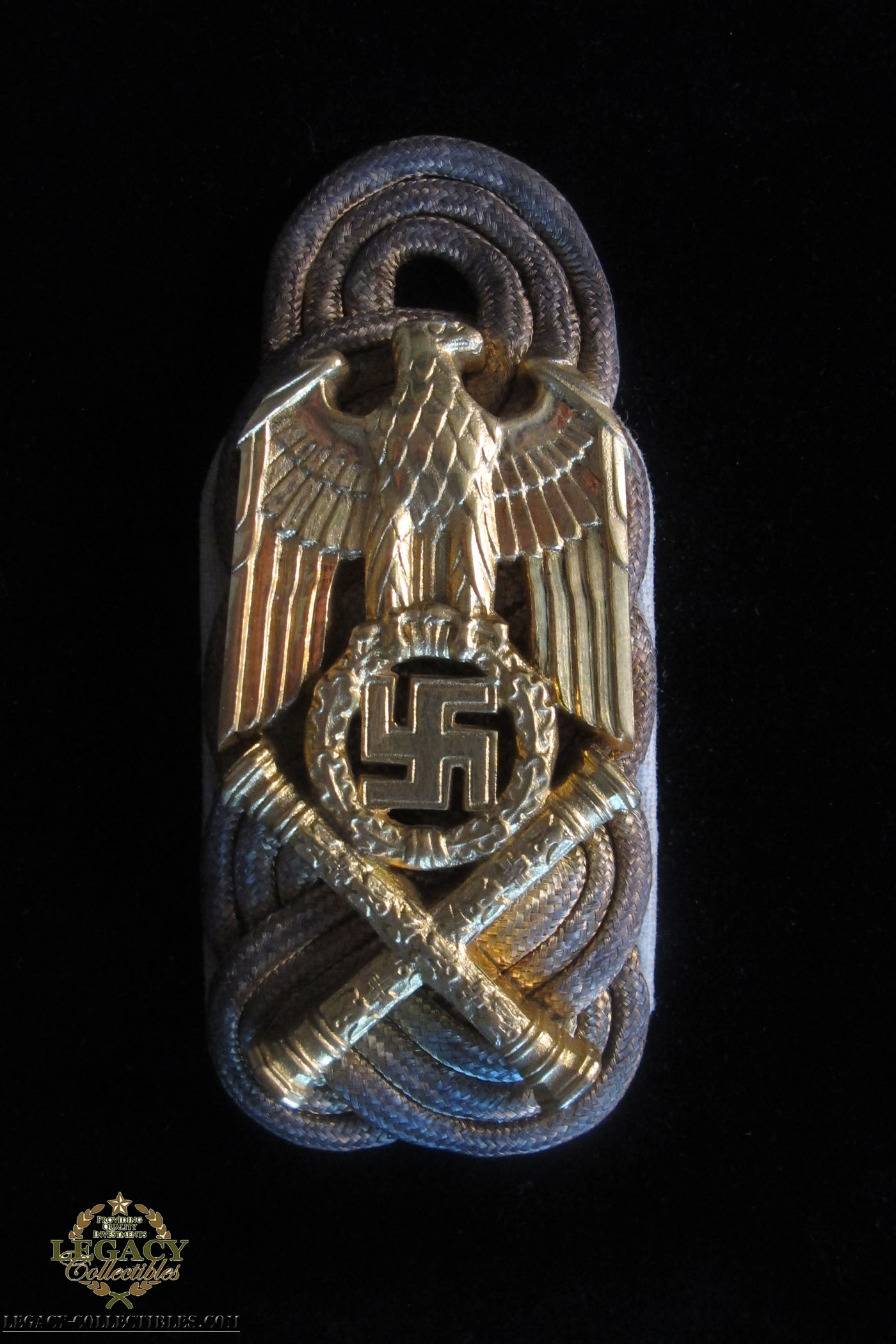10/16/12 – This is one of Goring’s Schulter Klappen (collar tabs) and is documented. It was given to the Army psychologist who helped as a counselor and translator for Goring just before he committed suicide.