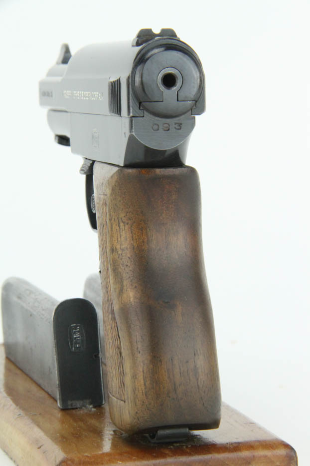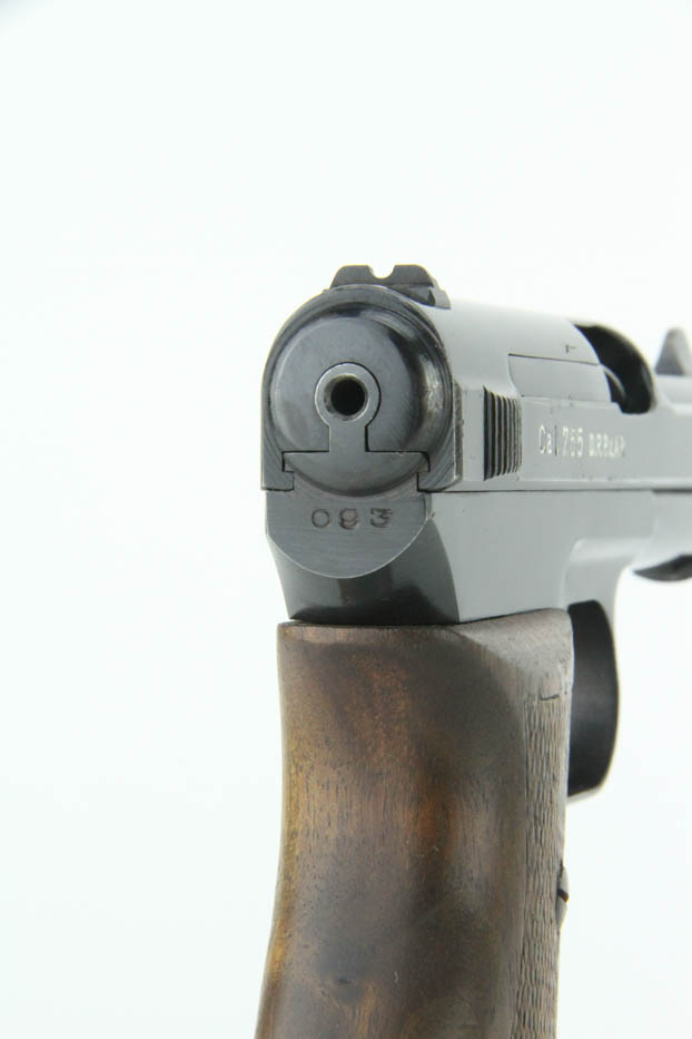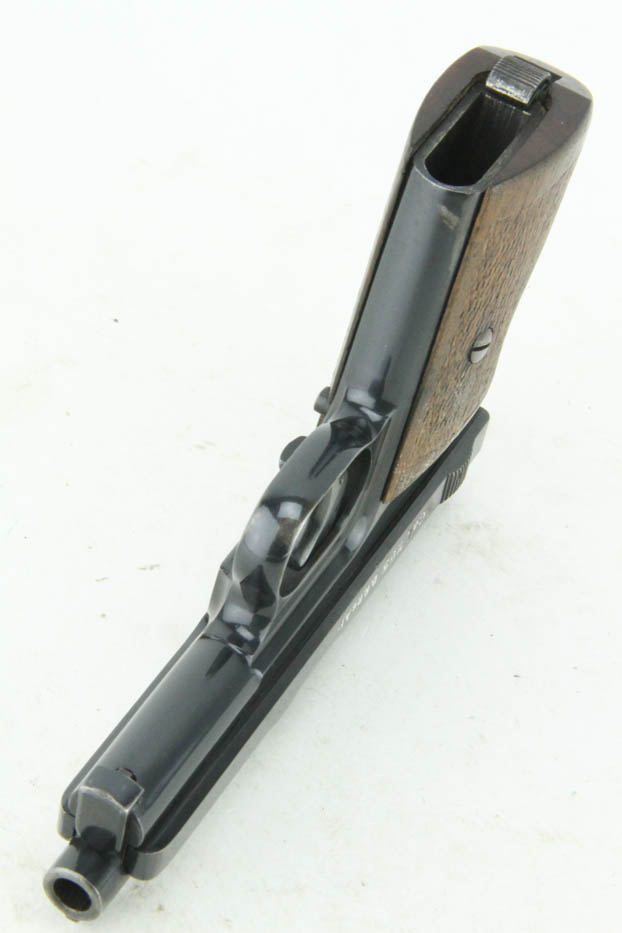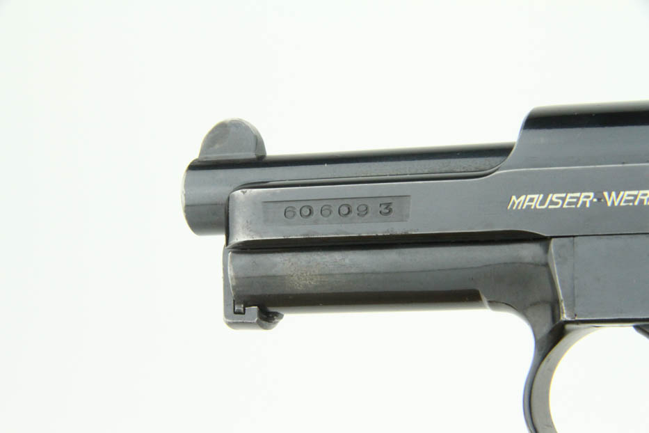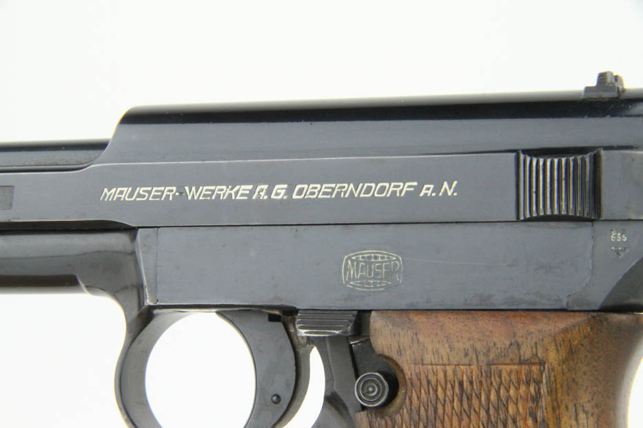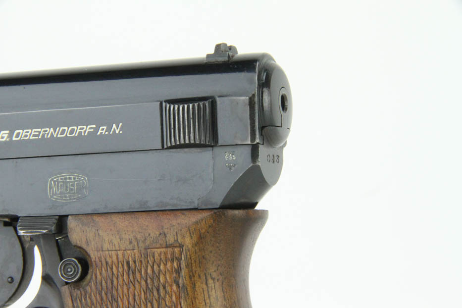 9/3/24 – This is an excellent example of a scarce Mauser Model 1934 issued to the Nazi army during WW2. It was made around 1940. Only about 8,000 of this variation made. All matching with the proper Eagle test proof and “Eagle 655” military acceptance proof on the left side of the tang. It comes as a rig with a WWI-era holster (fits the gun well), one proper magazine, and a spare magazine that is actually for a Mauser Model 1914. The gun has retained about 96% of its original high polish finish. Minor wear around the muzzle and around the high edges. A small area of pitting on the right side of the slide. Fitted with a very nice wood grip. Minty bore.