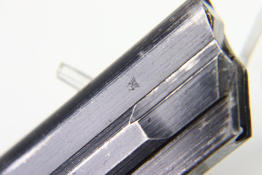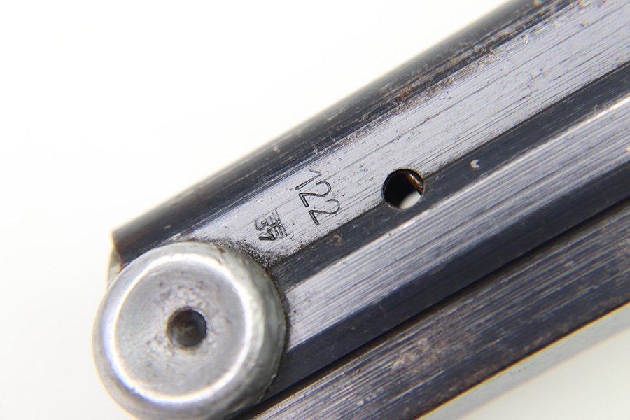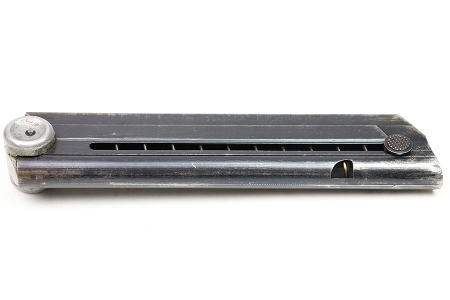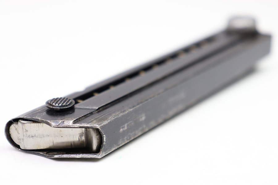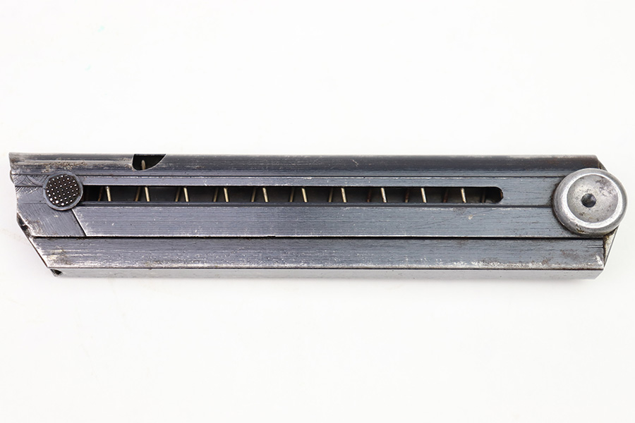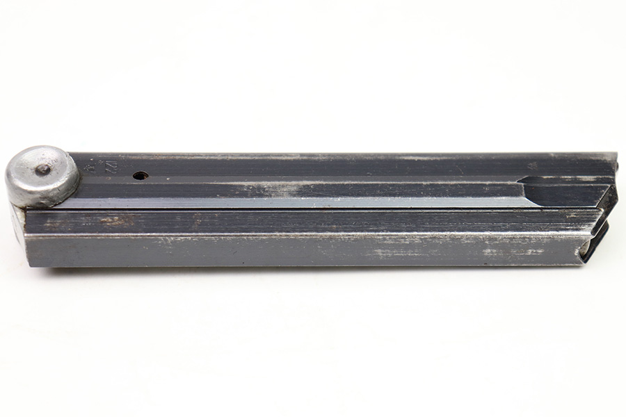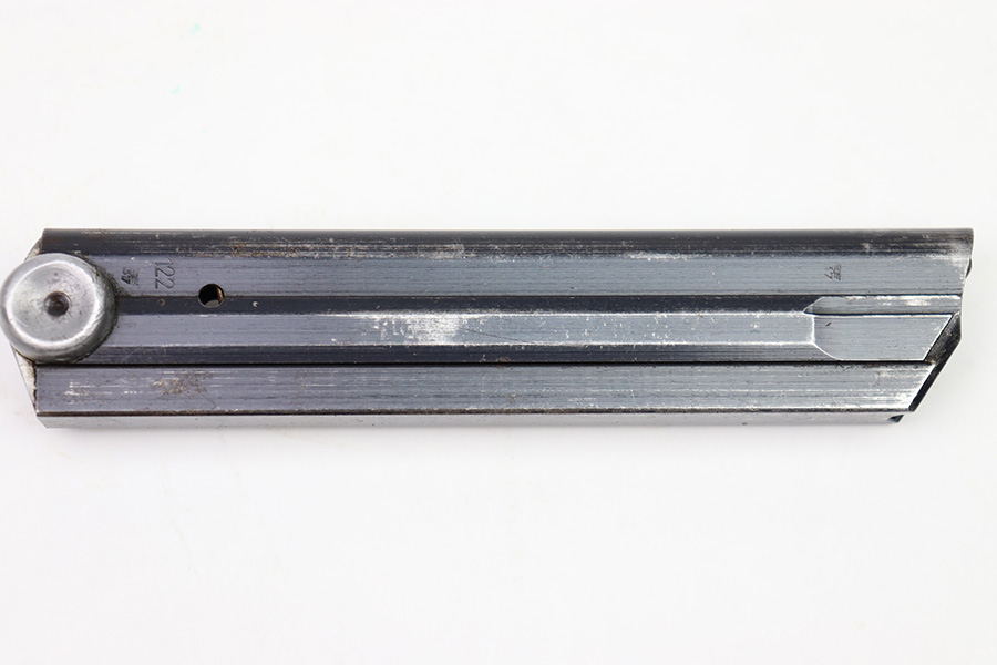 10/18/22 – This is an original WW2 production Luger magazine. The magazine is stamped on the aluminum base with a serial number “3128 o”. The tube is blued and stamped with two eagle 37 proofs and a “122” code by Haenel. There’s some mild finish loss but most of the original finish is intact. No rust or pitting and a strong, functional spring.