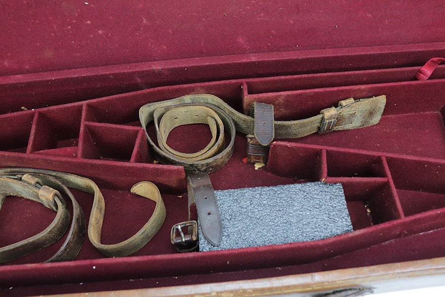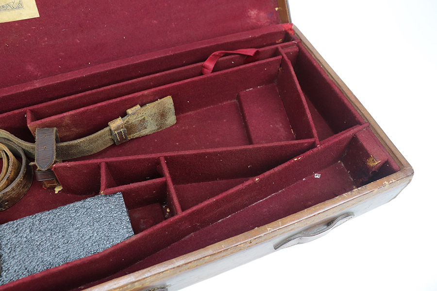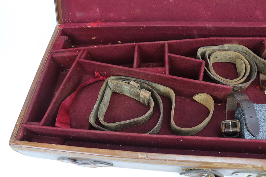 8/6/21 – This is a spectacular antique English leather carry case for 2 side-by-side shotguns. Original maker marked inside the lid – W. Richards. Excellent condition with original leather straps. Should accommodate 2 shotguns with barrel length up to 30.5 inches. Impossible to find and would greatly increase the value of your shotguns as a set.
