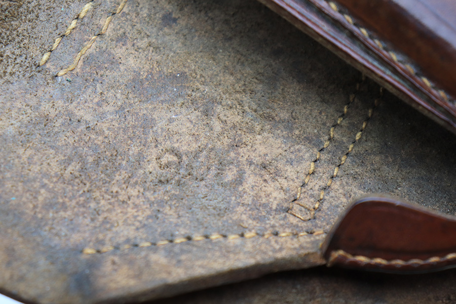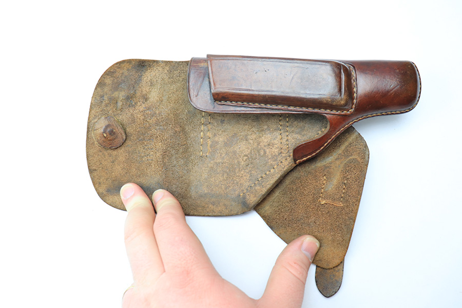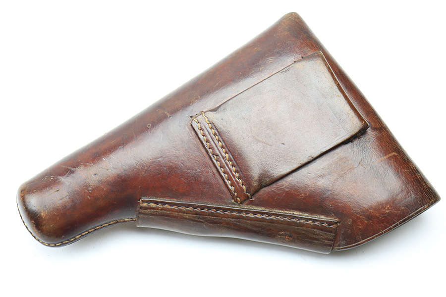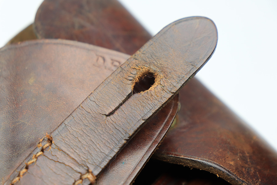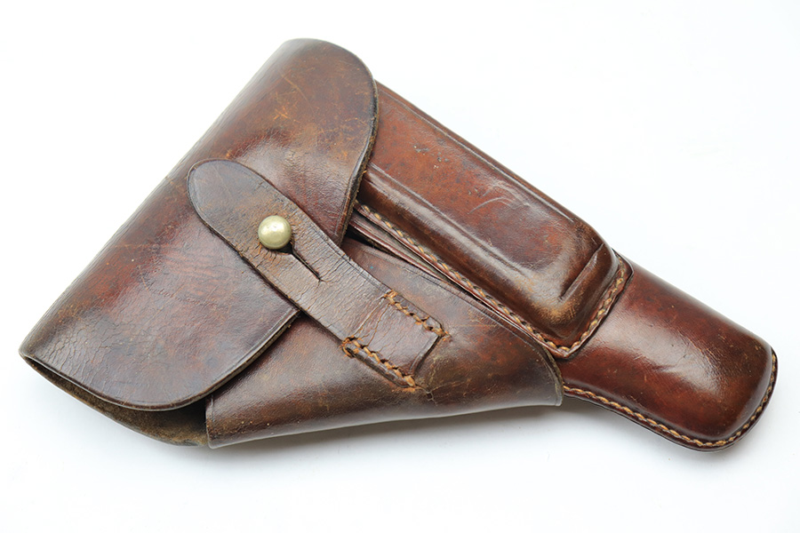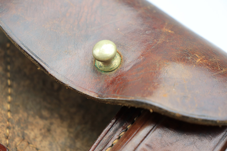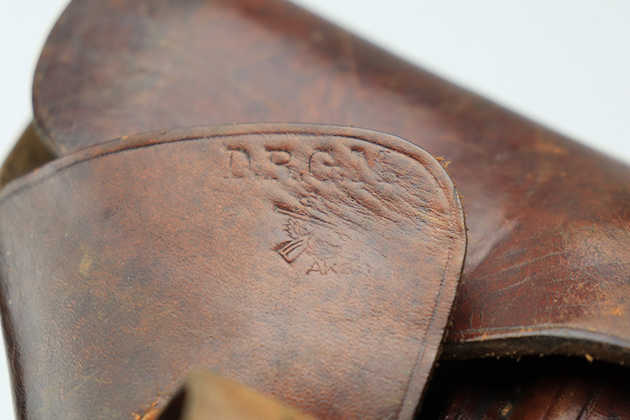 4/11/22 – This is an original AKAH Walther PP holster from WW2. The holster features nice brown leather and all original stitching in tact. There’s an AKAH maker stamp under the closure strap as shown. The interior leather is somewhat clean but does show typical signs of previous use wear. The leather patch that covers the interior of the knob is loose but still attached. The exterior leather has some mild surface wear but no major issues.